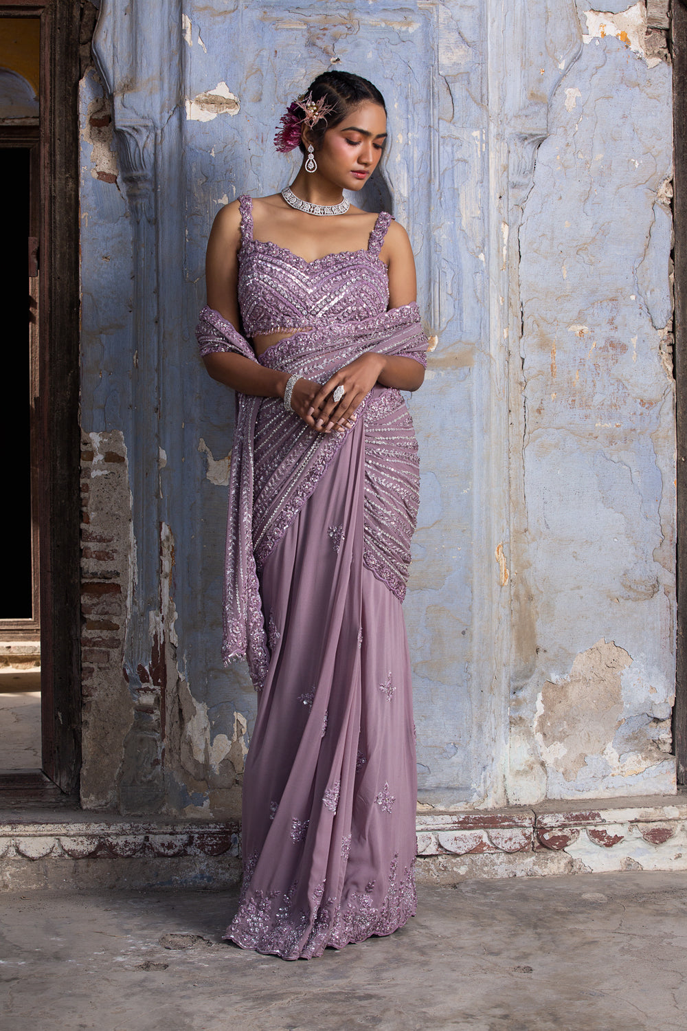Lavender Georgette Drape Saree with a net blouse with tonal and silver resham, beadwork, and crystal.