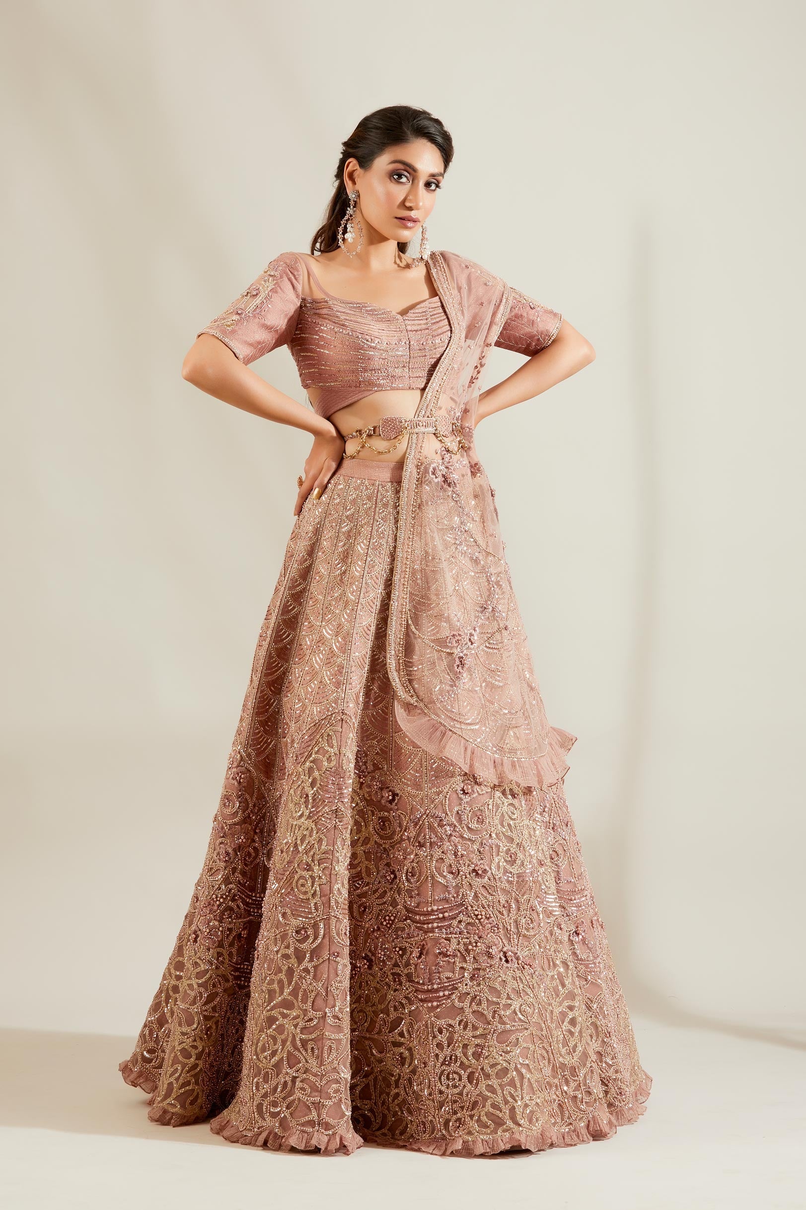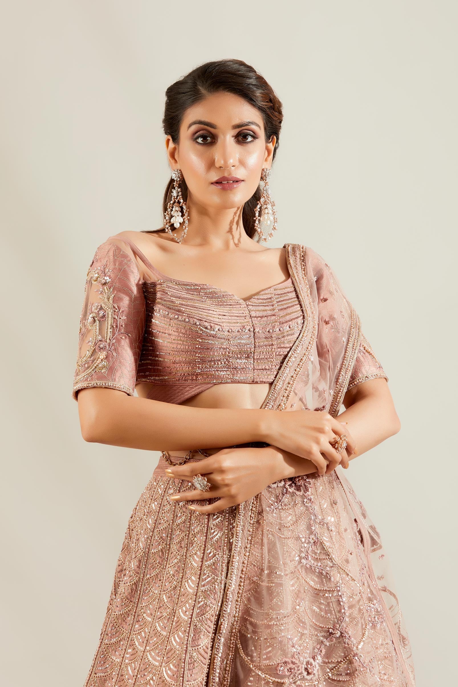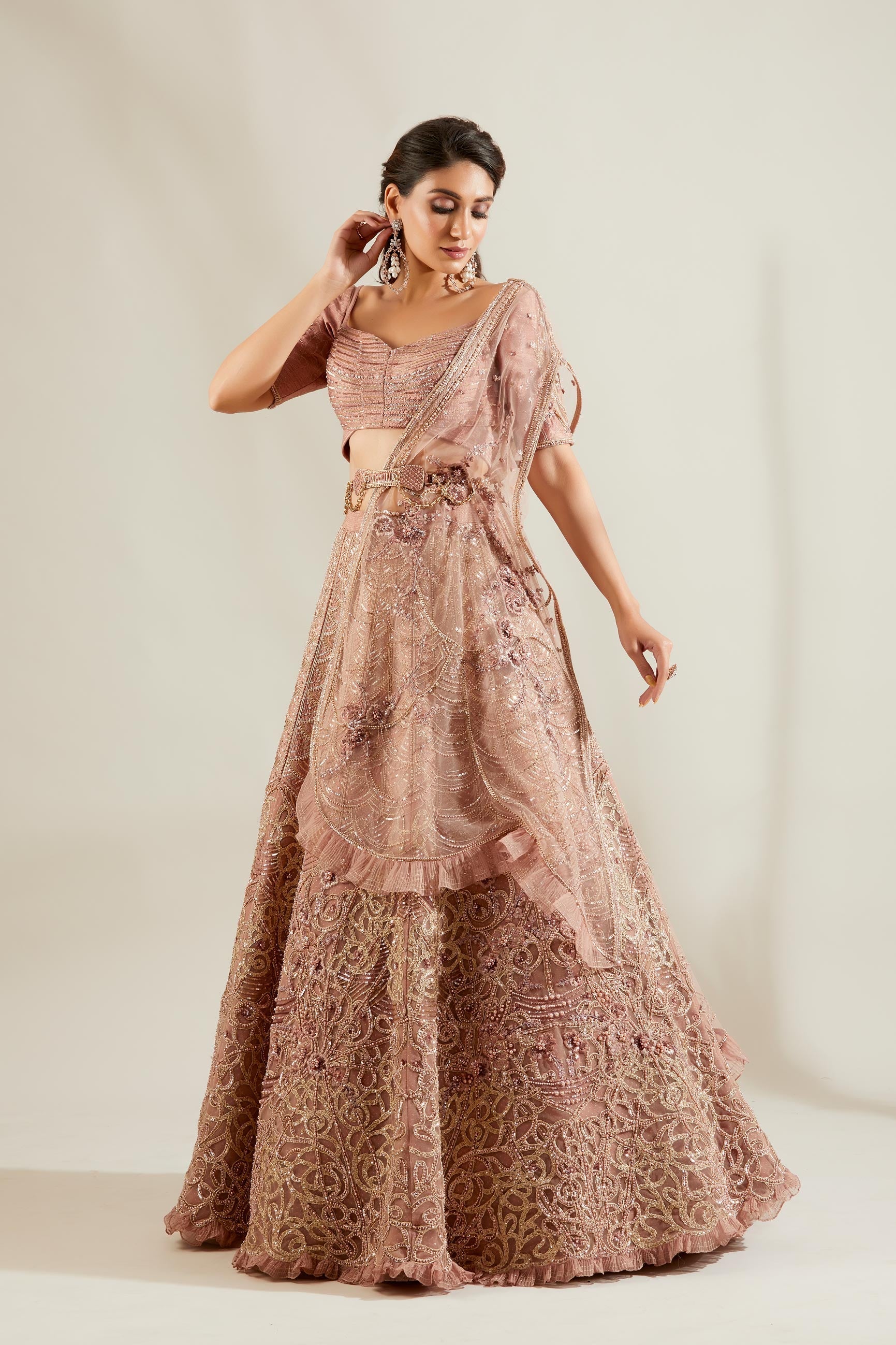 Lavender lehenga with pattern placement pearl embellishment comes with an elegant wide U-neck blouse, intricate lattice work pearl embellishment