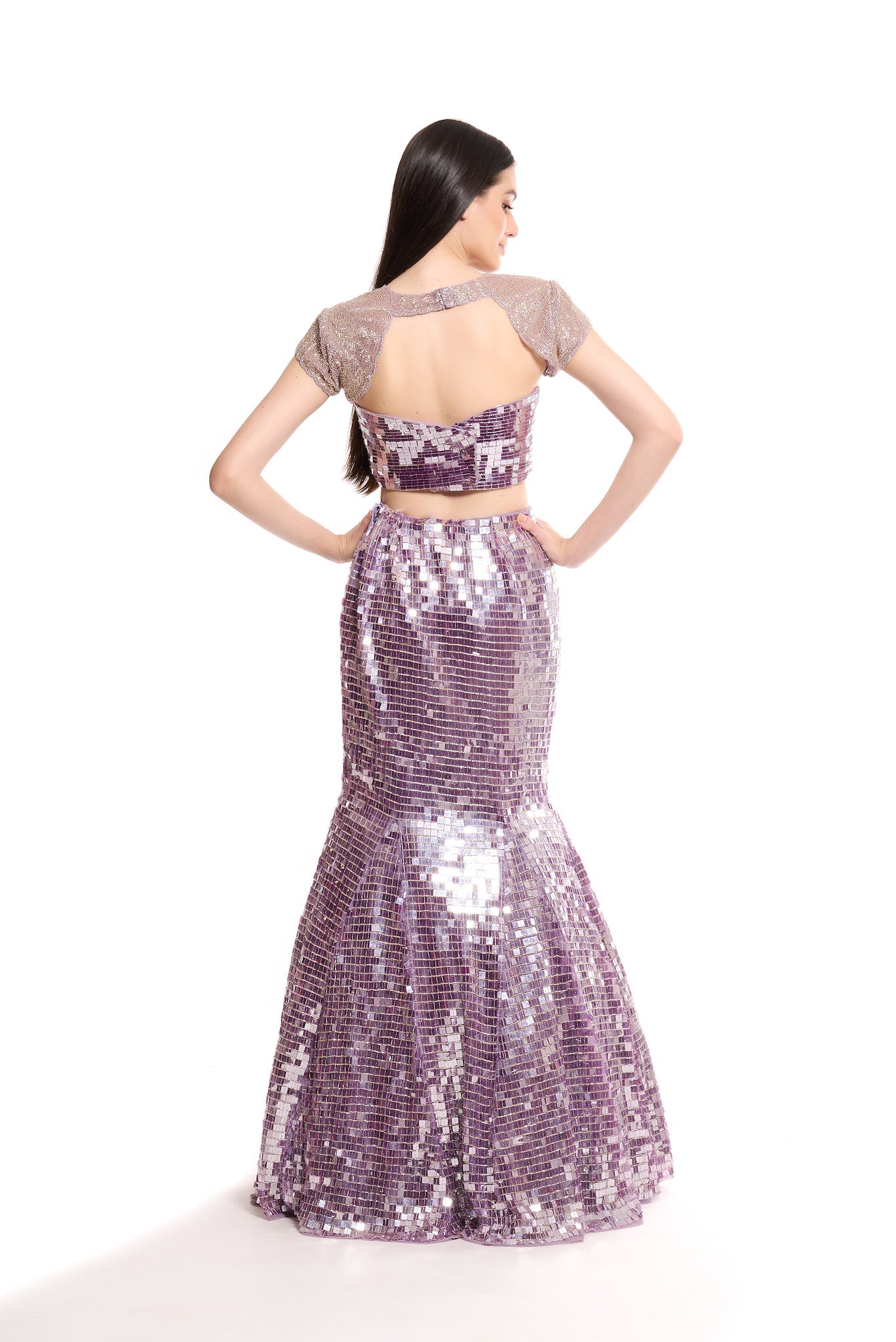 Fully hand embroidered fish cut lehenga with 3D sequin on tulle fabric.