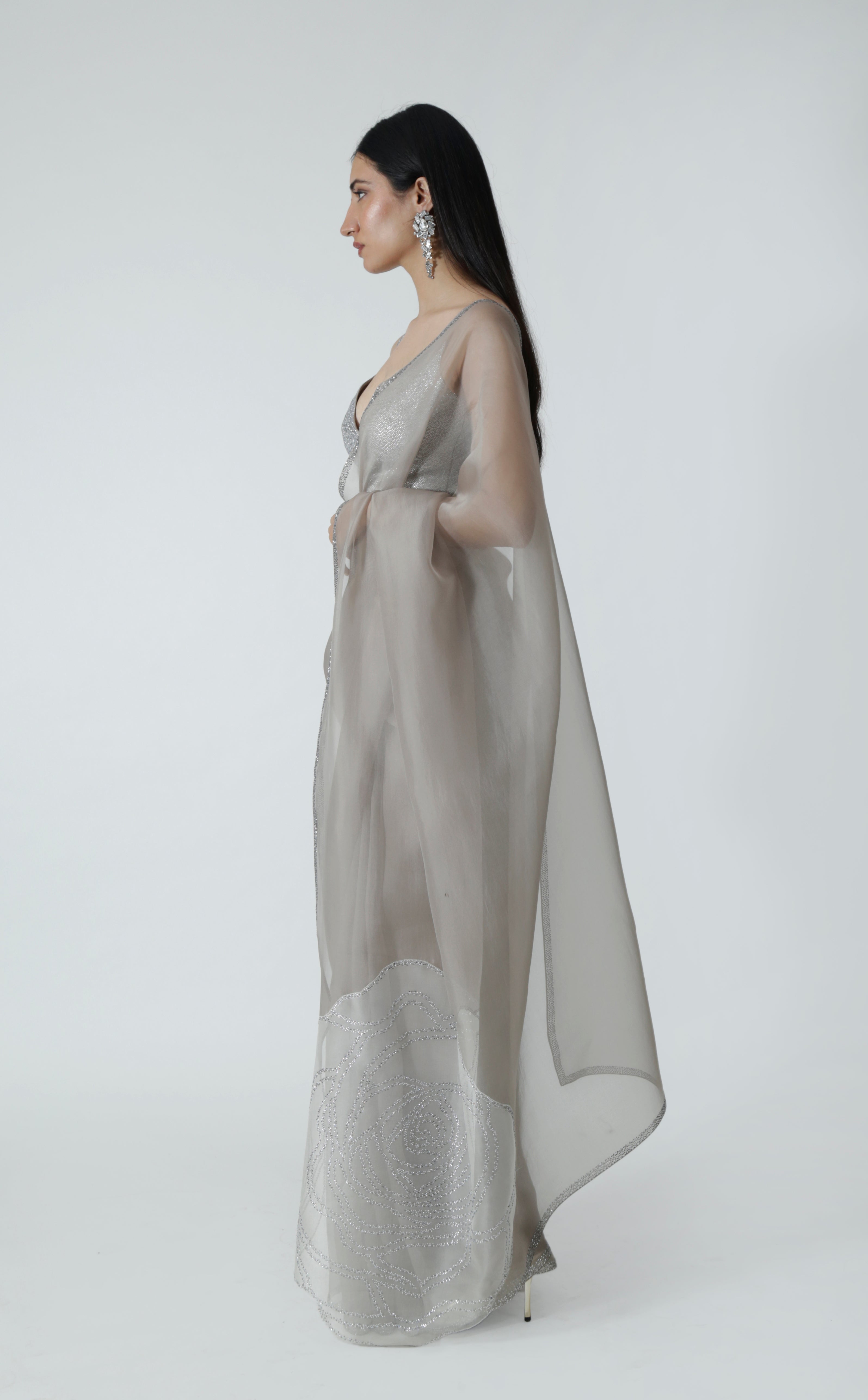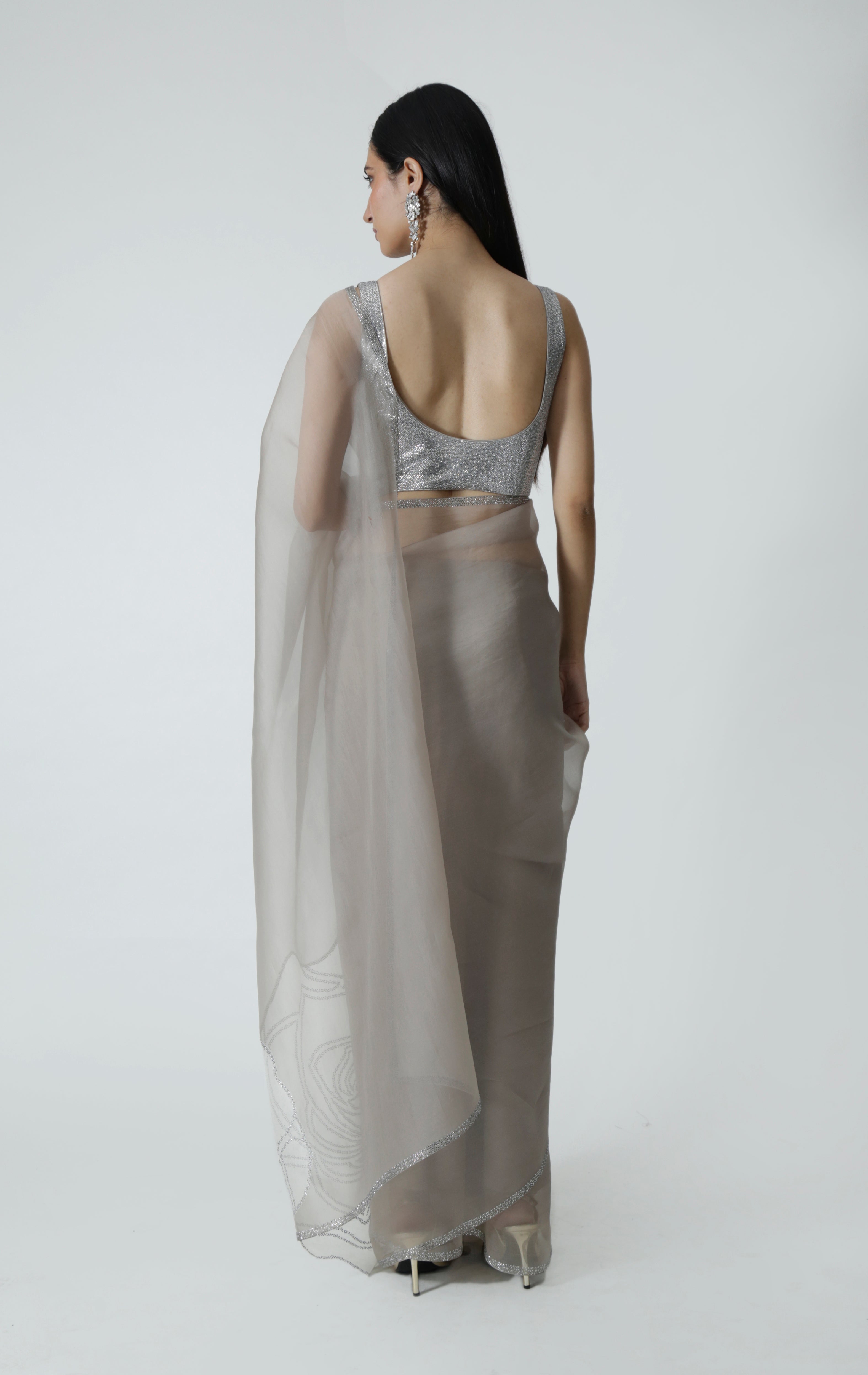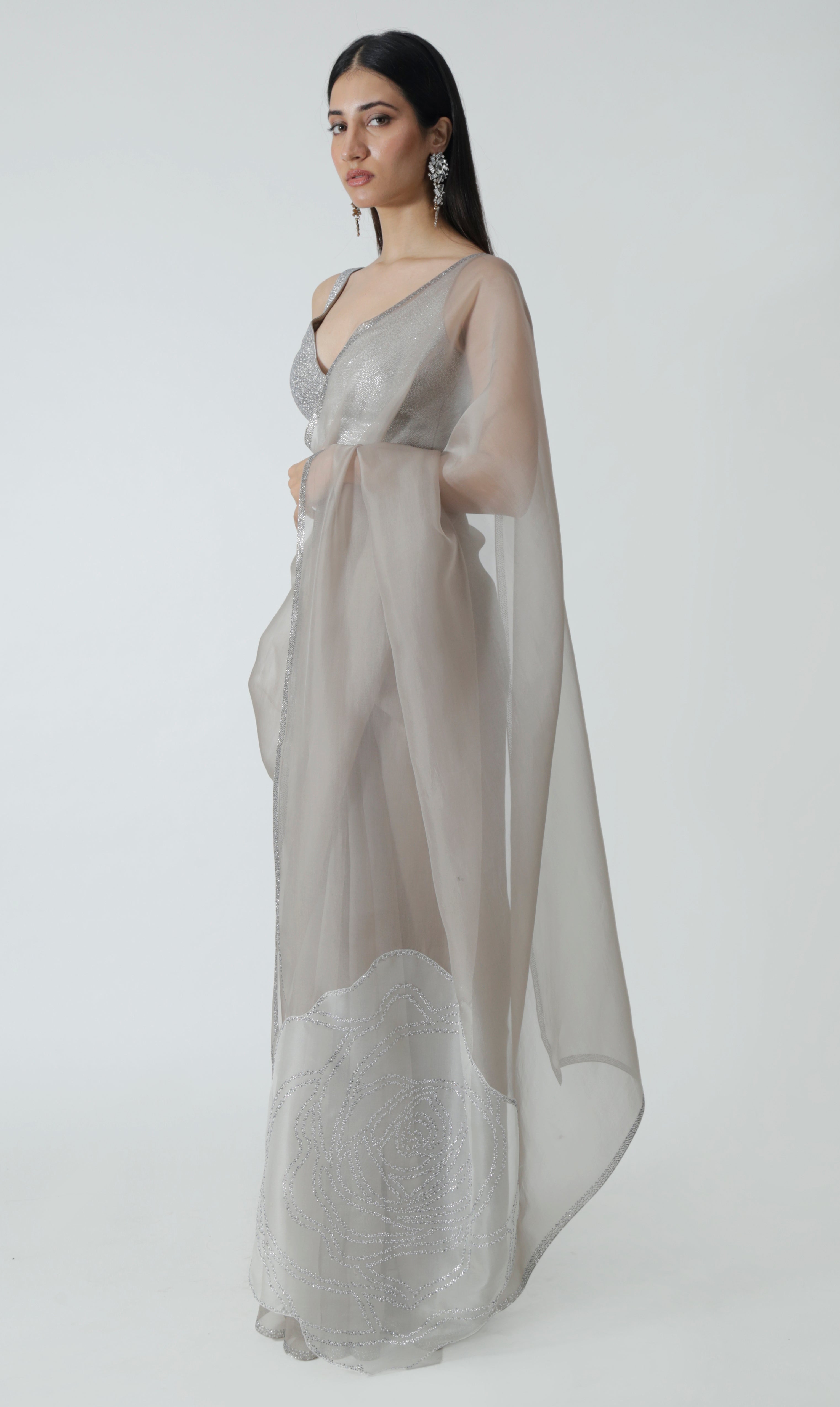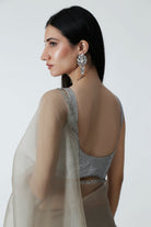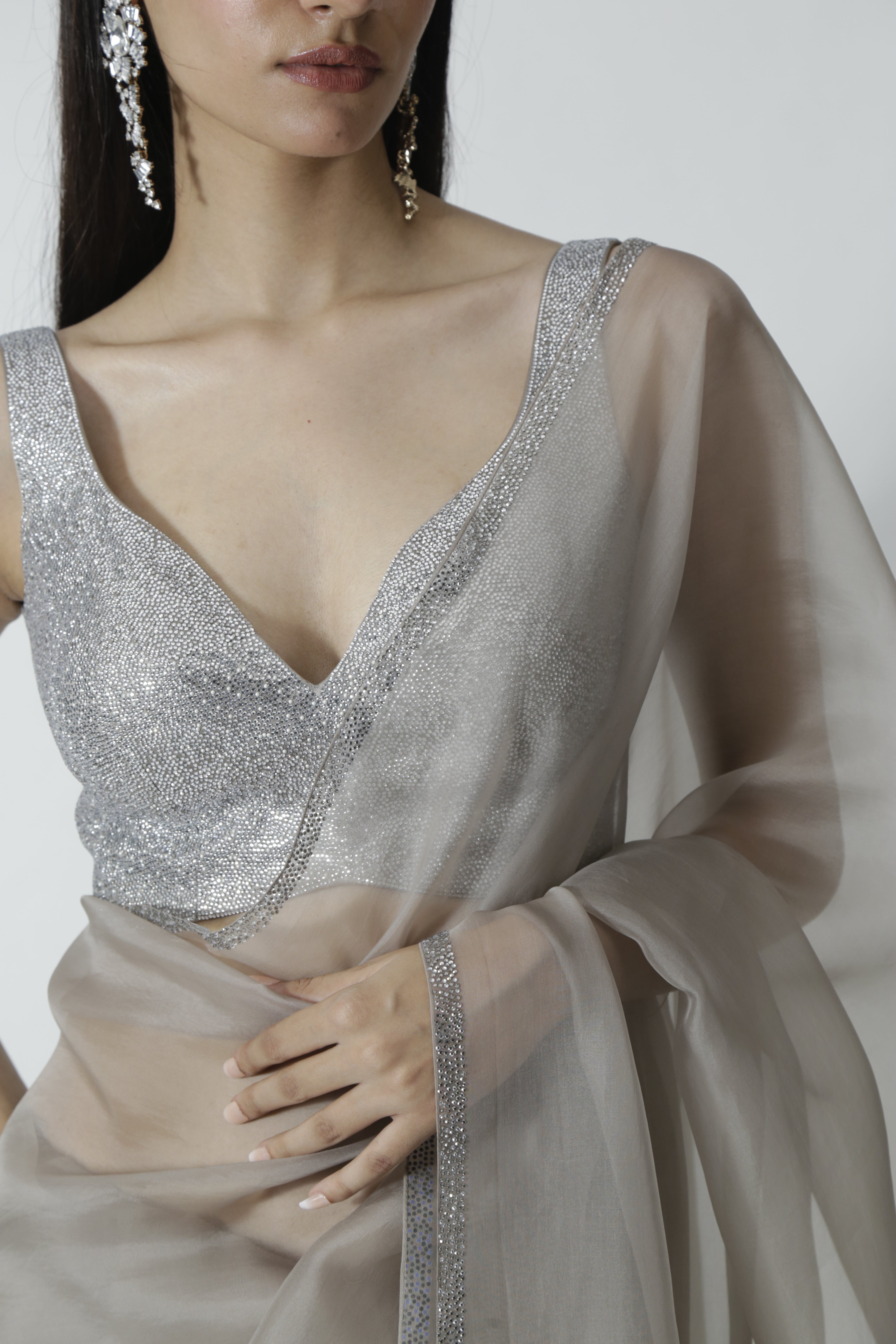 A Silver Grey silk organza saree, accented with an ivory rhinestones embellished applique, paired with rhinestone encrusted blouse.
