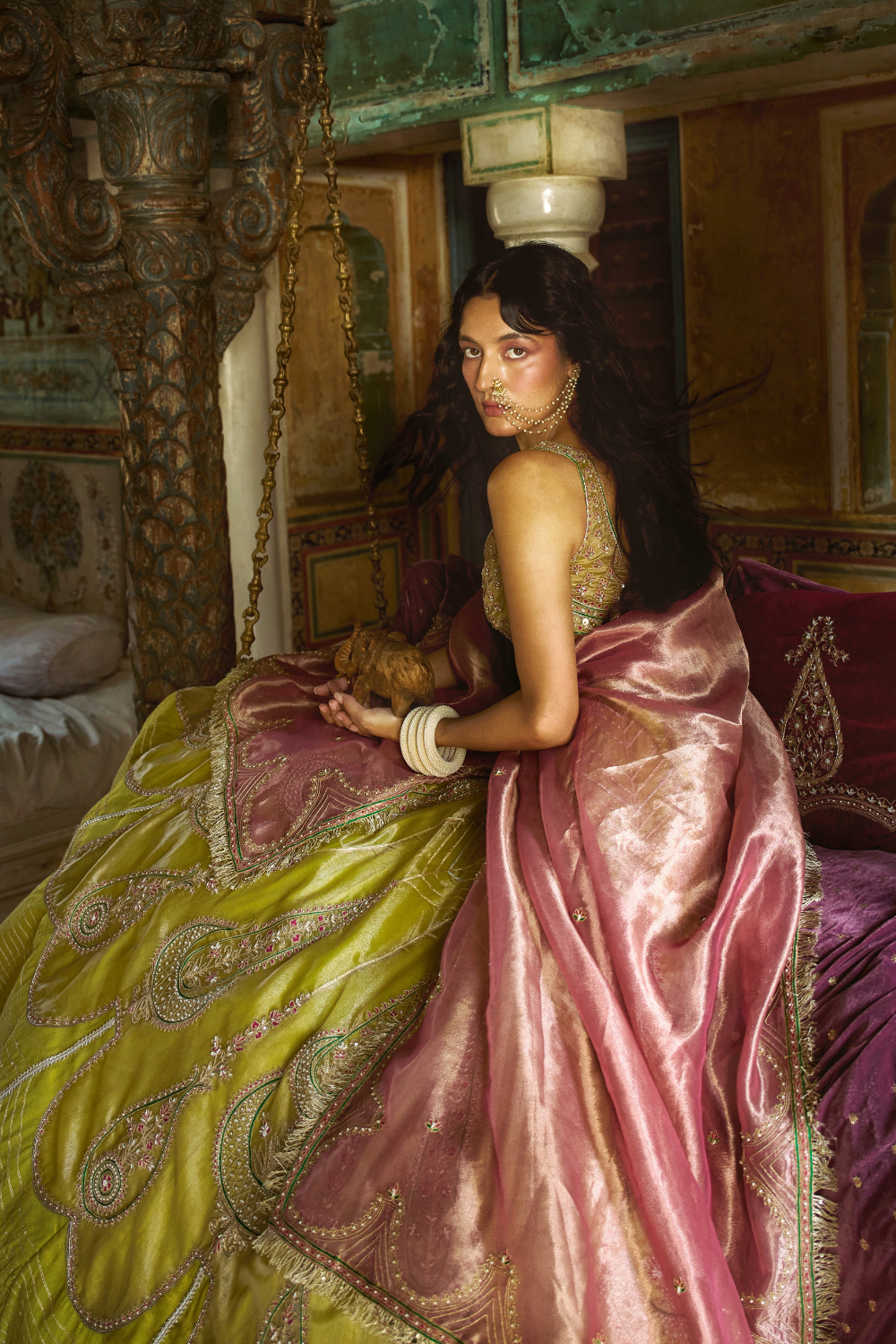 Lemon green silk zari tissue Lehenga with rose pink dupatta