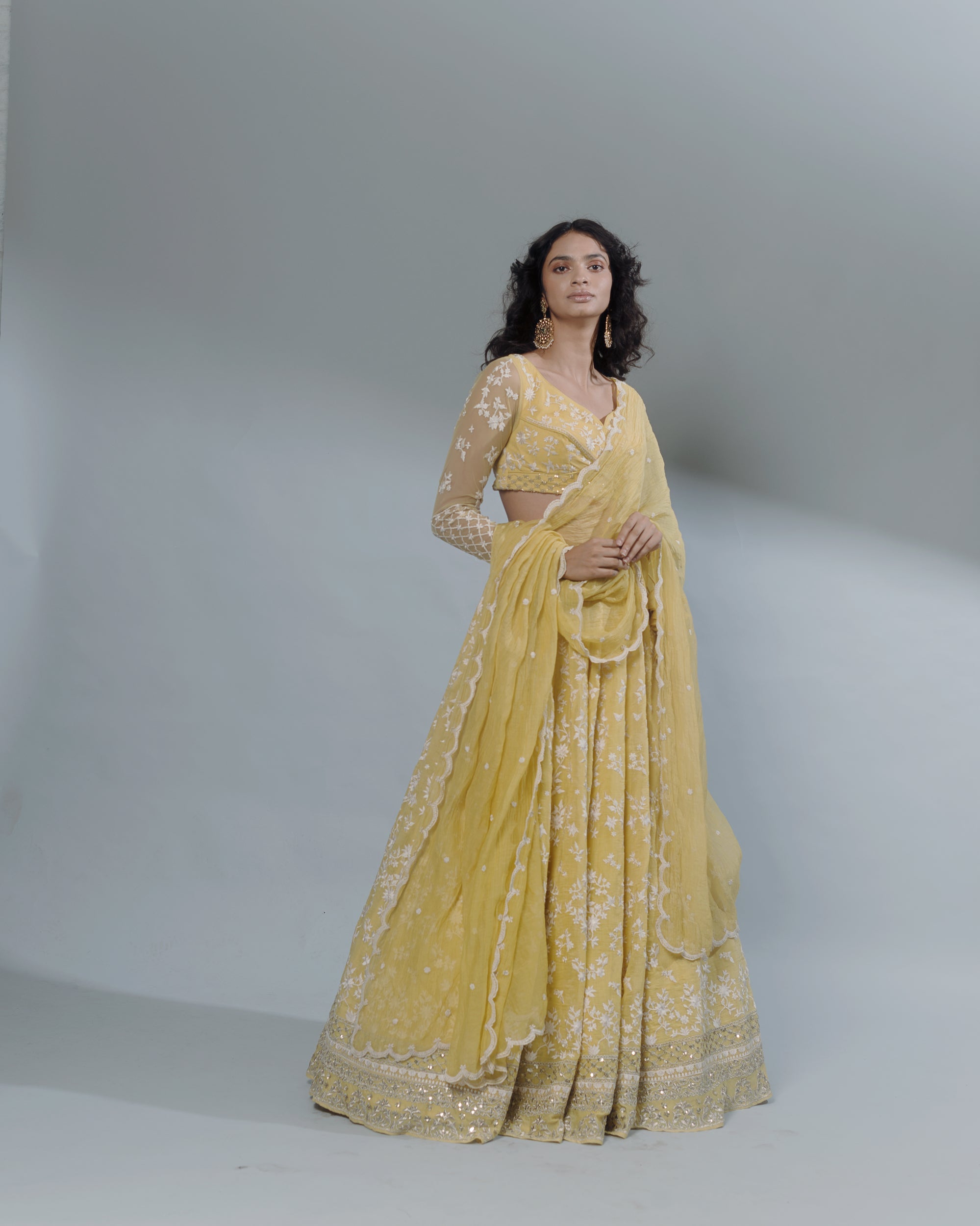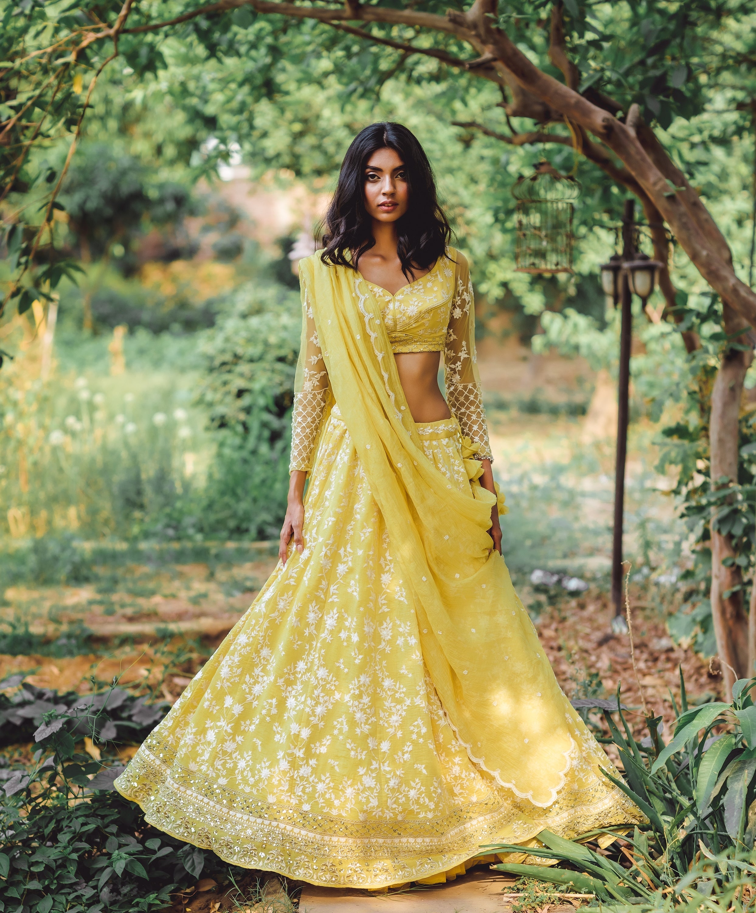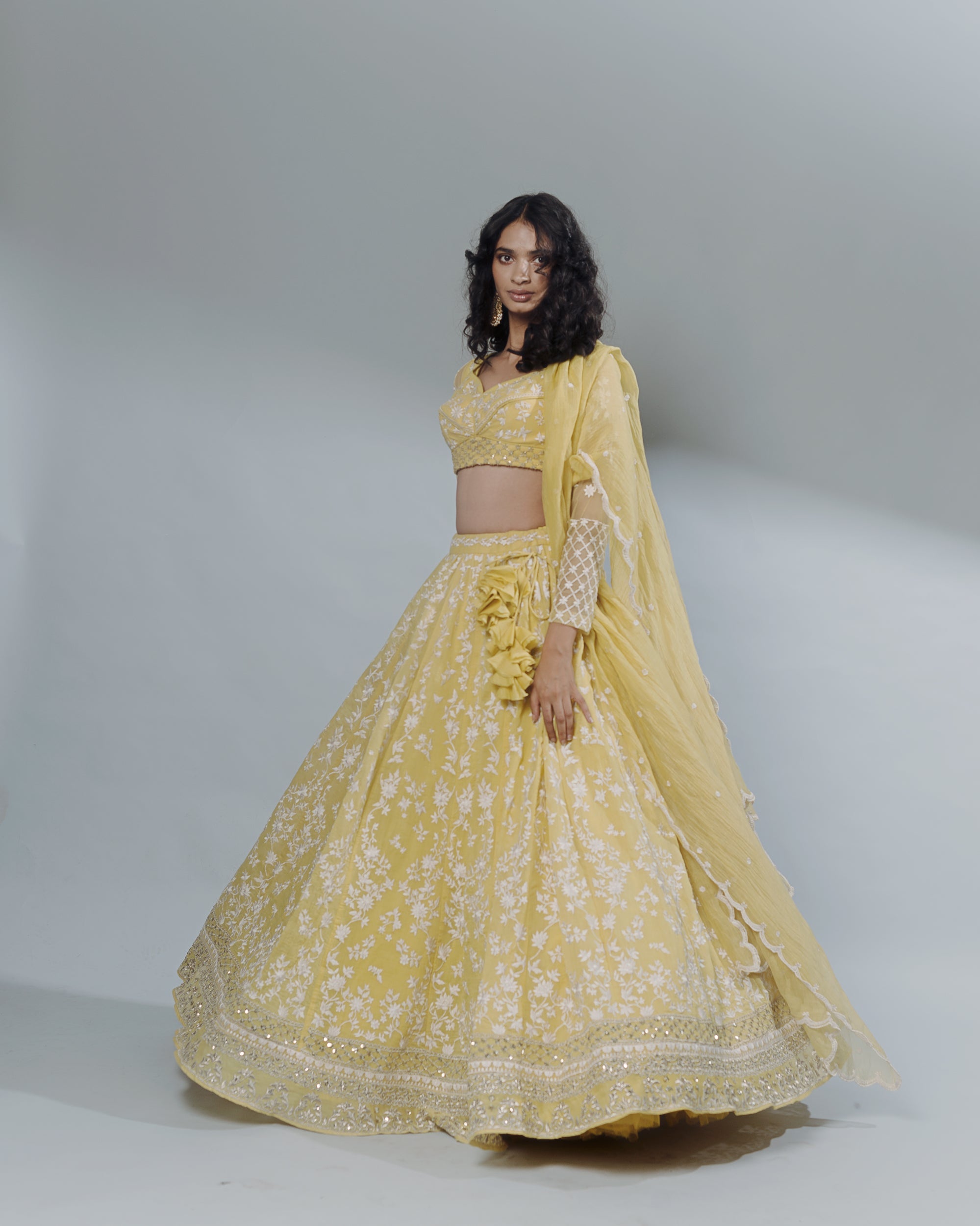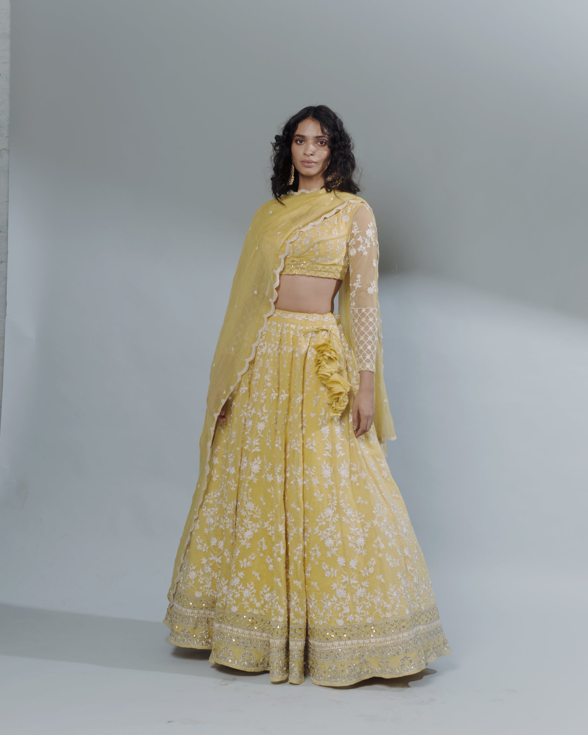 Featuring a LEMON YELLOW THREADWORK LEHENGA SET IN NET.