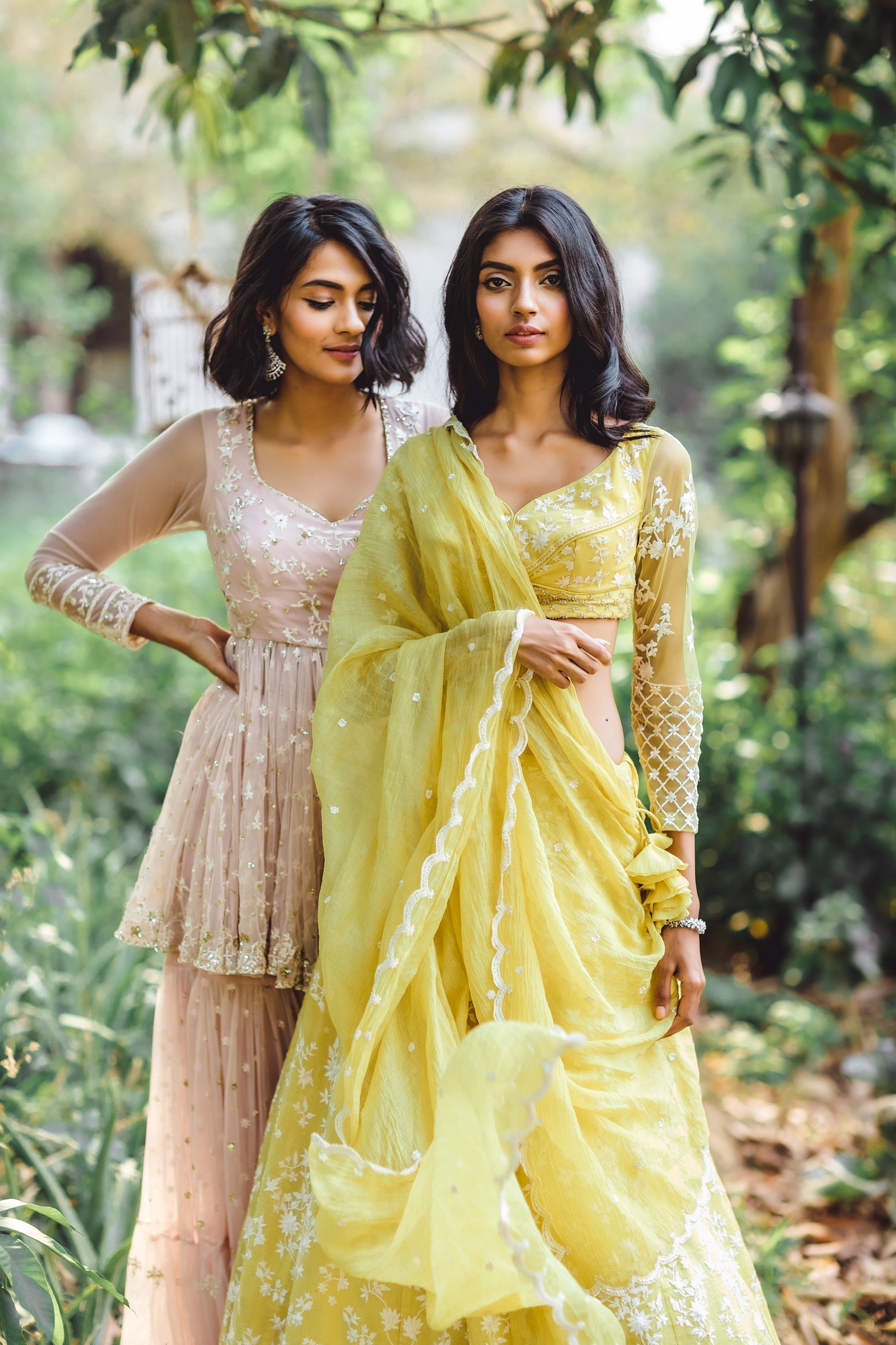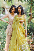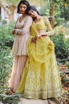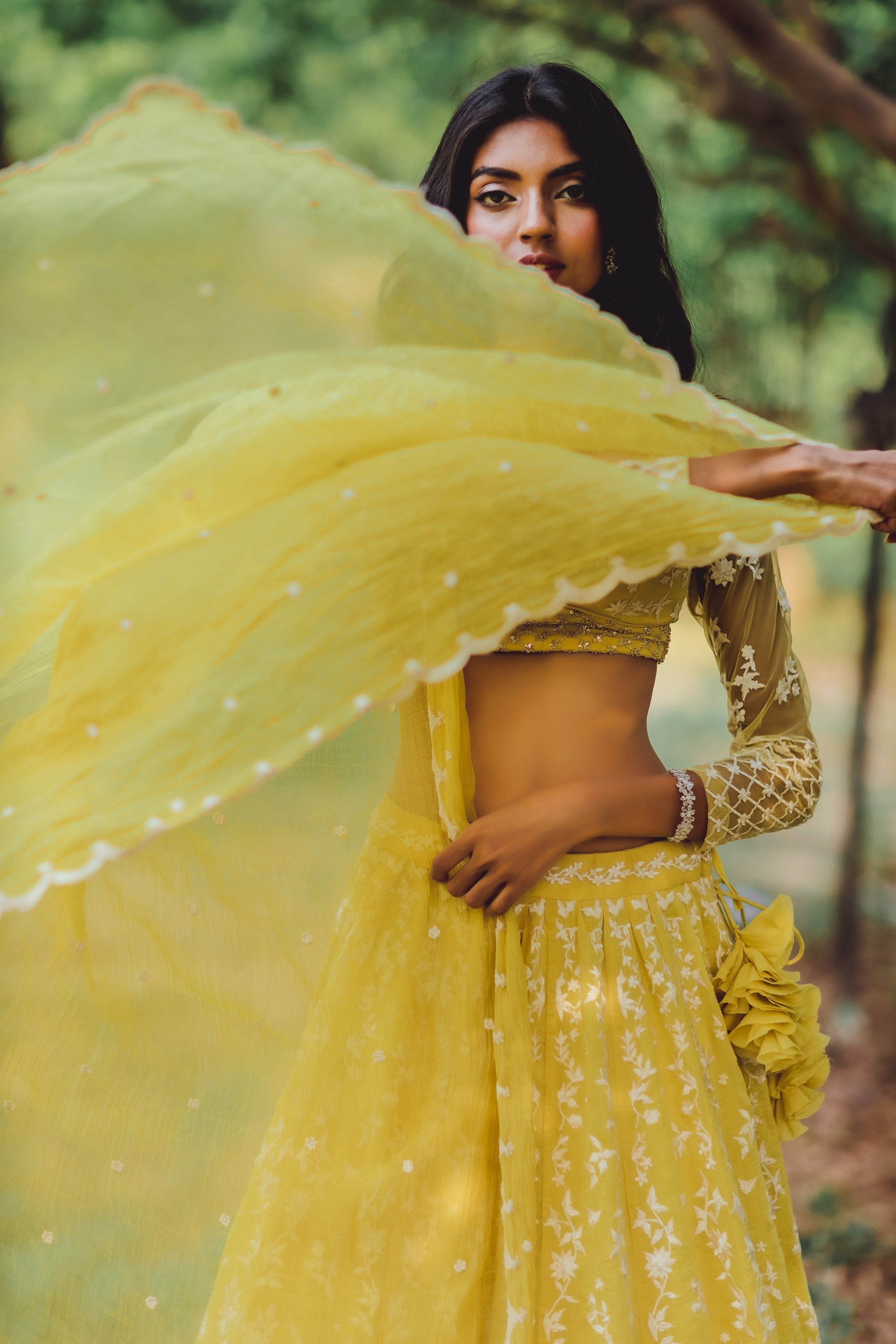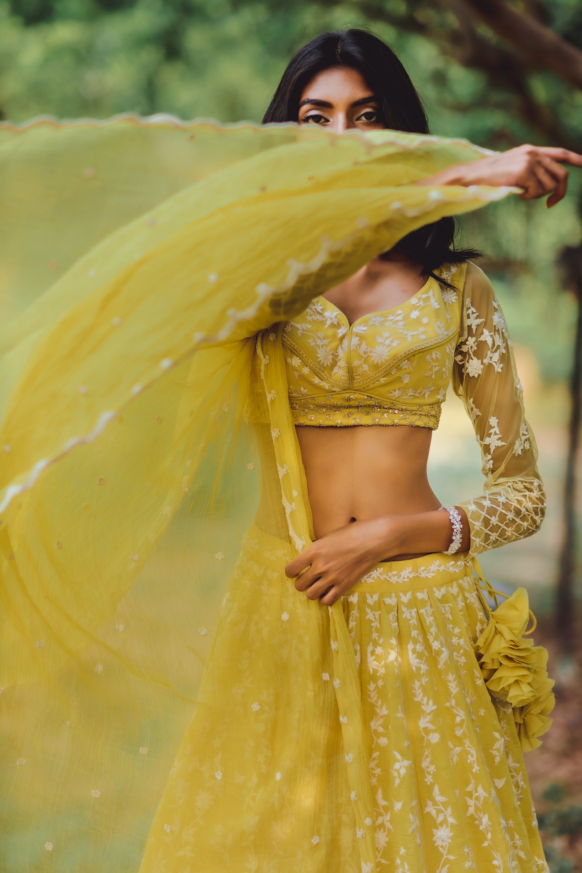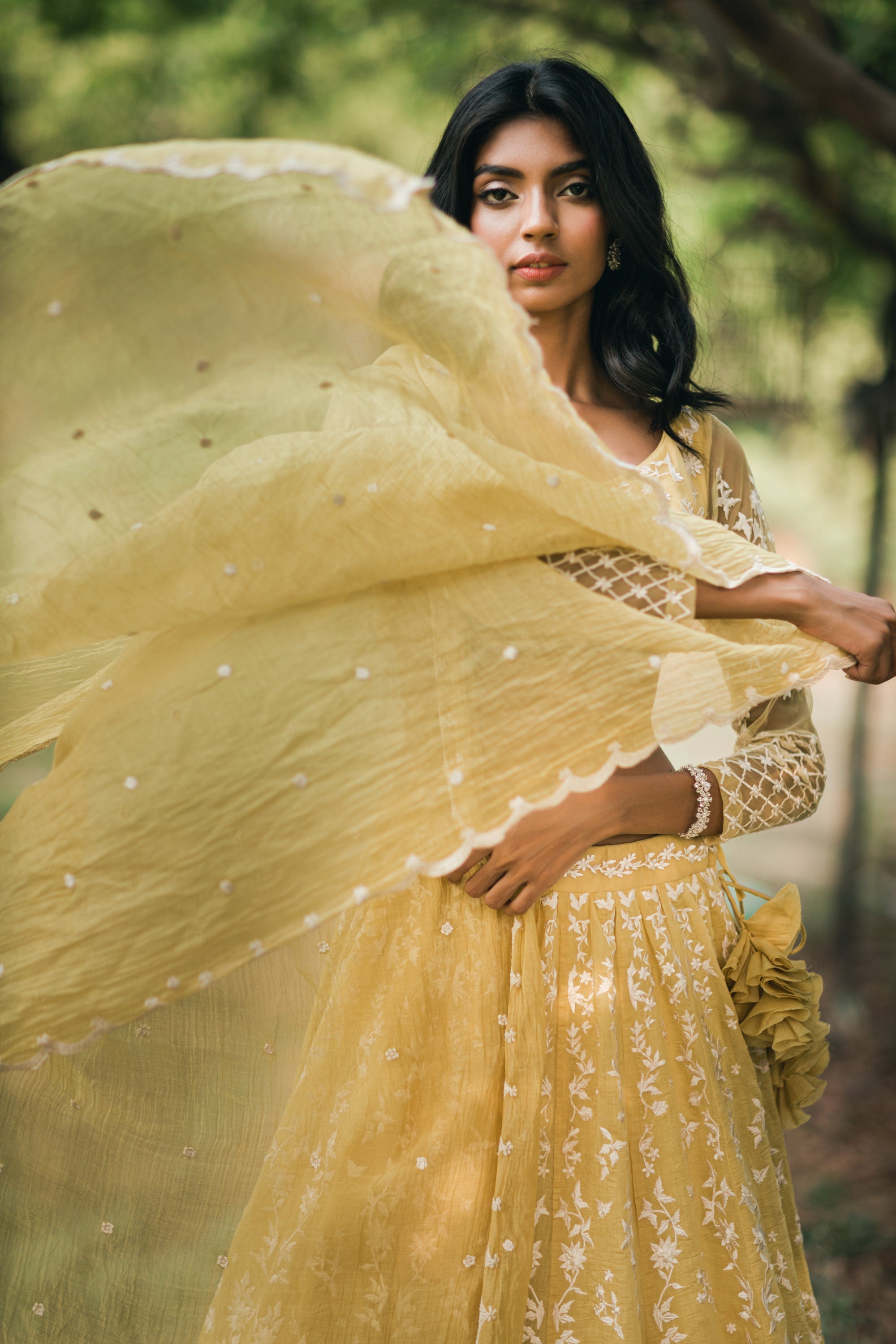 Featuring a LEMON YELLOW THREADWORK LEHENGA SET IN NET.