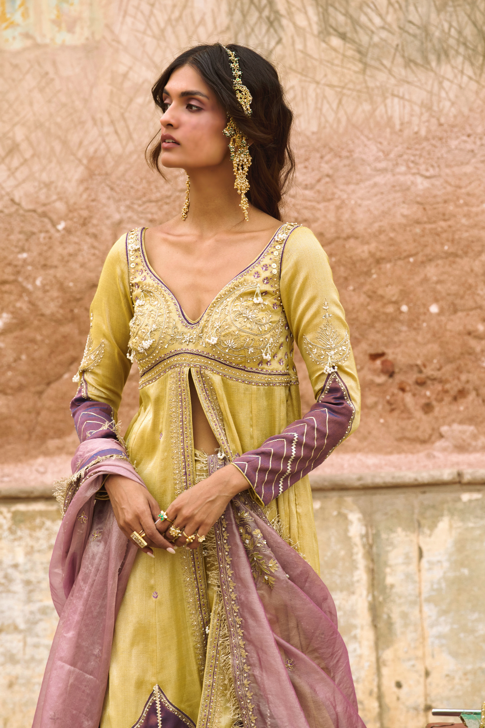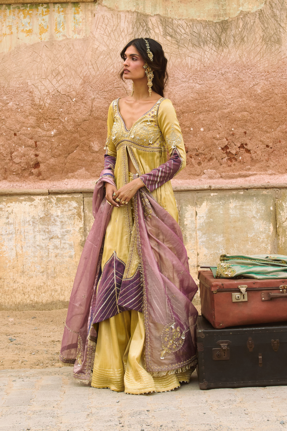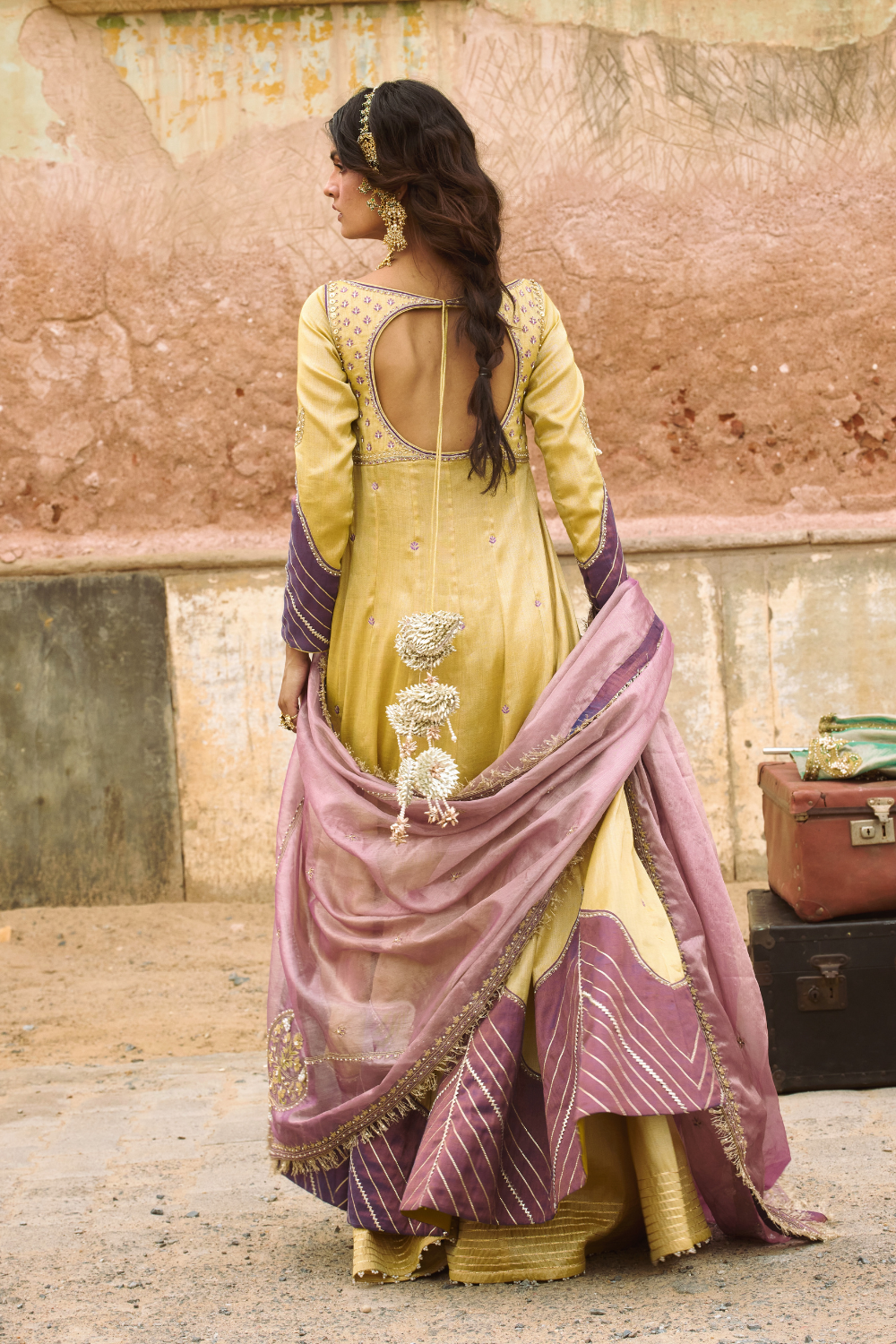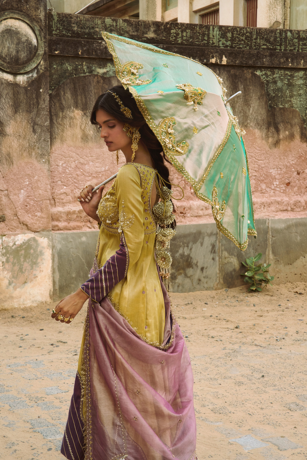 This kalidar jacket, crafted in lemon yellow tissue and lilac chanderi tissue, blossoms with contrasting floral accents and delicate half-moon motifs. Adorned with shimmering zari and pearl embellishments, it radiates timeless grace. A vibrant green border adds a striking finish. Paired with a monochromatic sharara in pure zari tissue and a lilac dupatta edged with lambi gota, the ensemble is a refined blend of elegance and tradition.