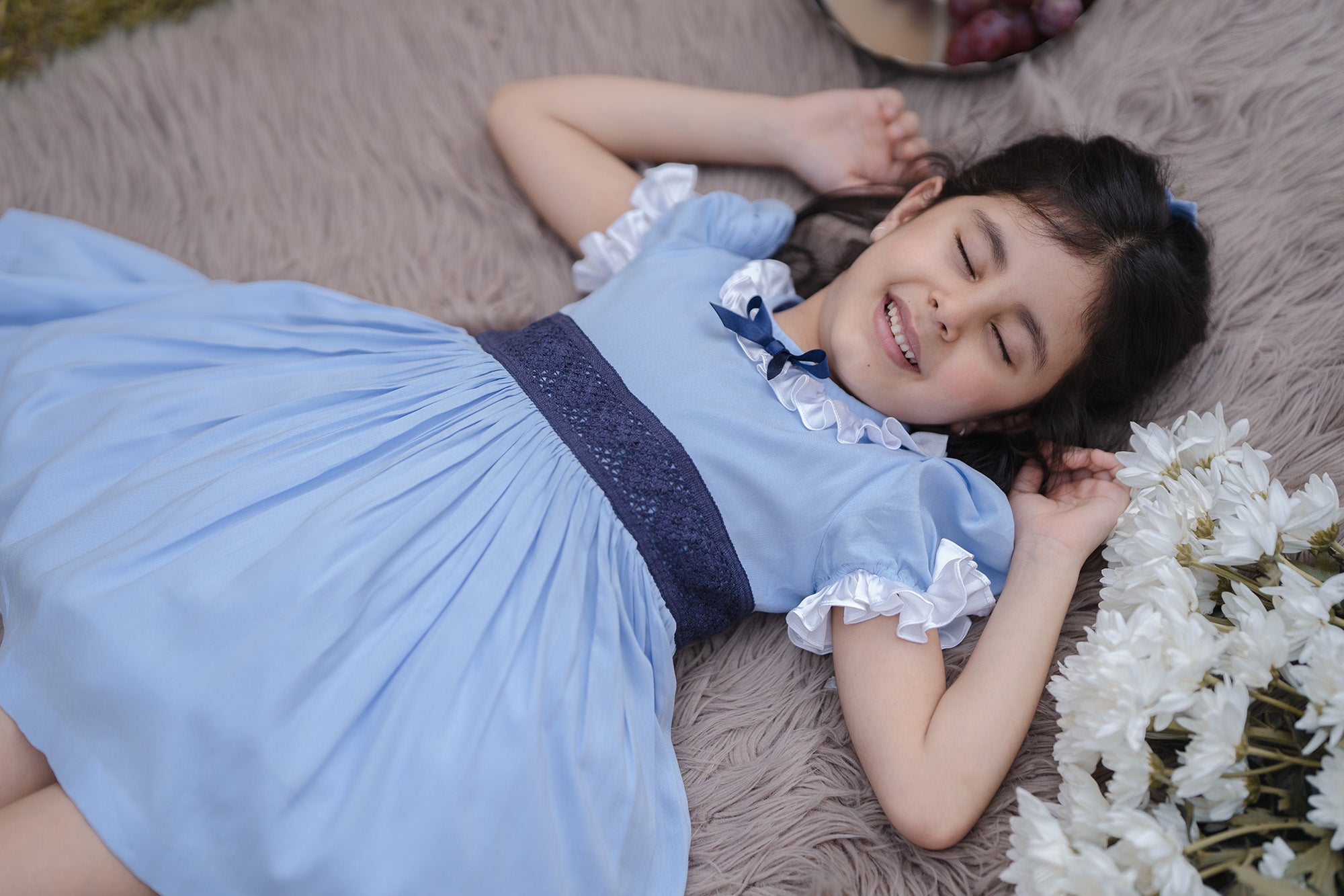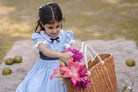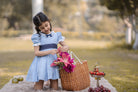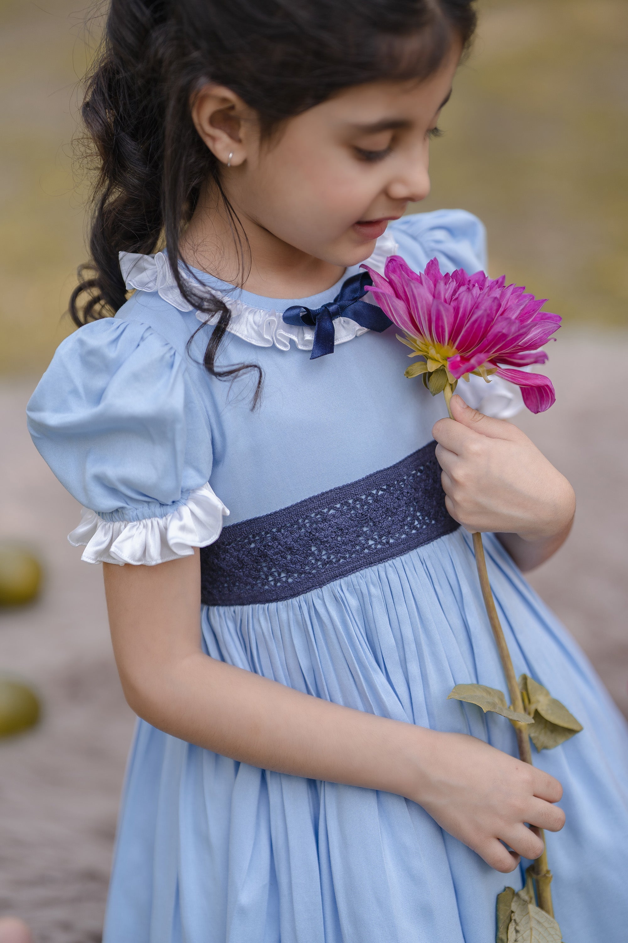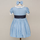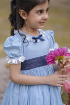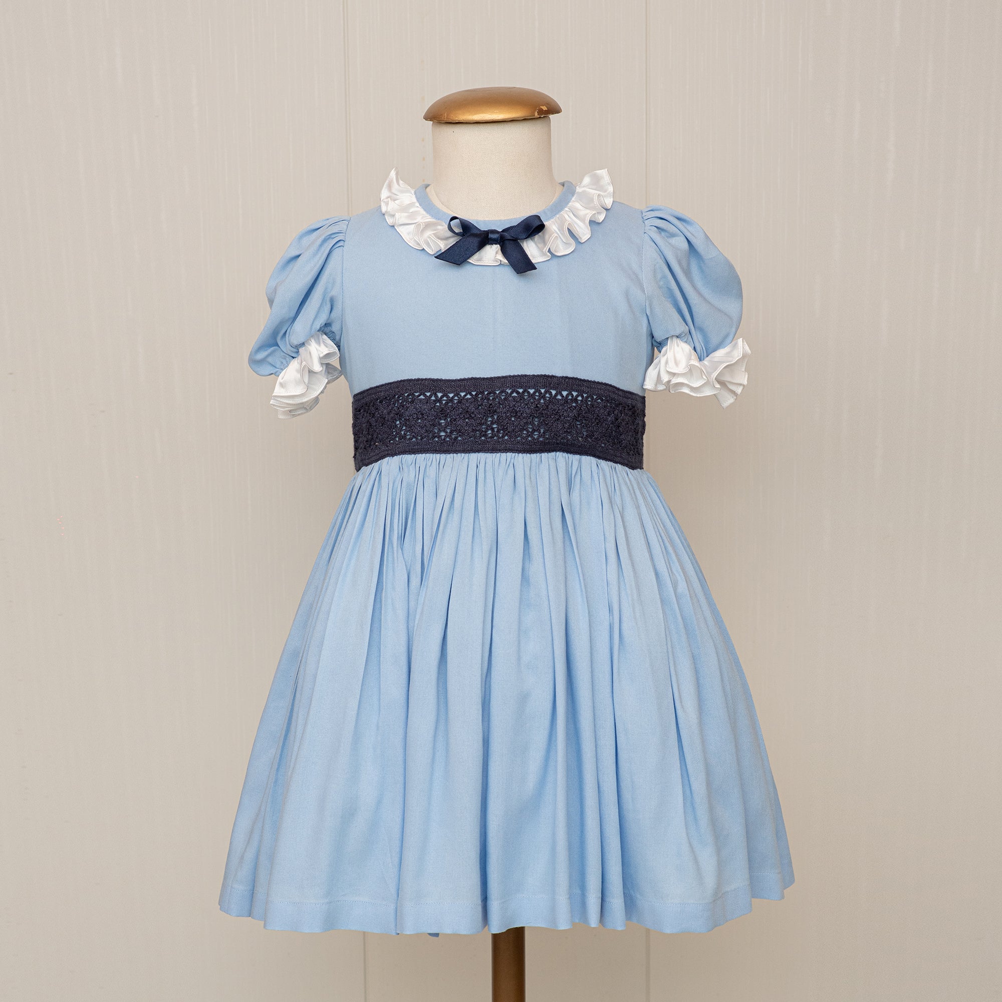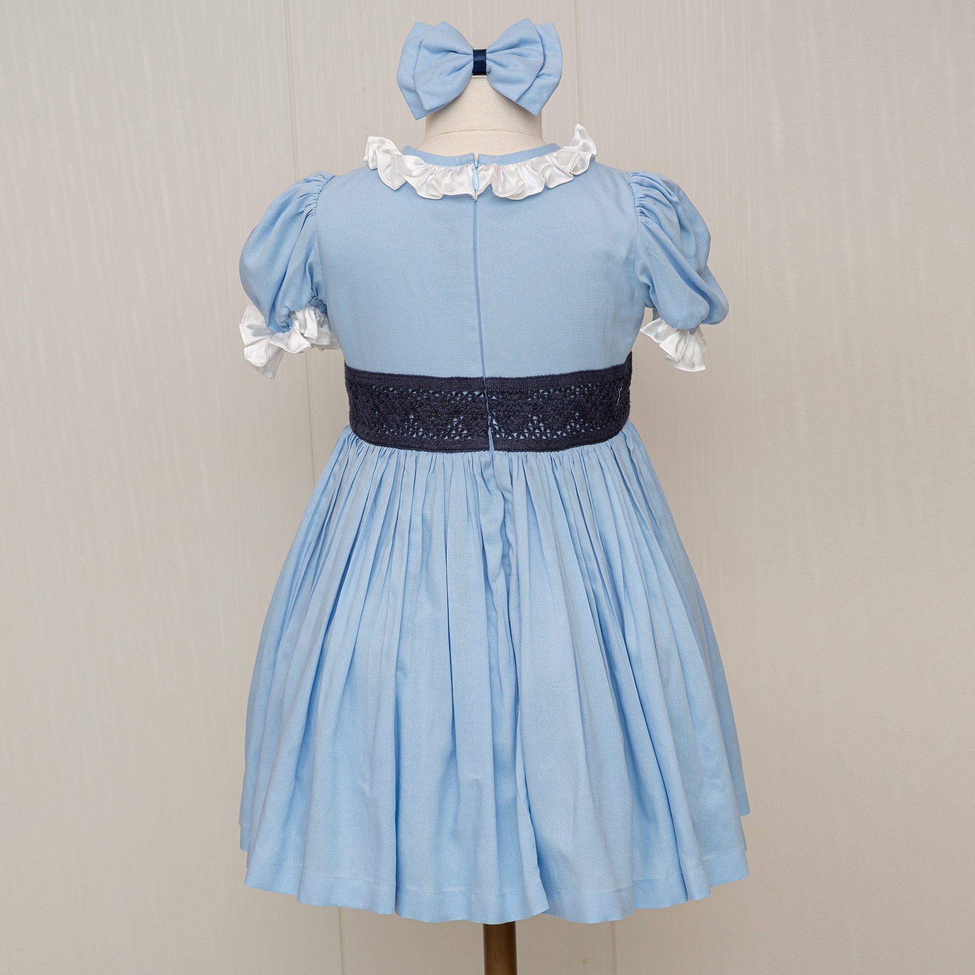 - LIGHT BLUE DRESS, WITH A NAVY BLUE BOW AND MESH APPLIQUE