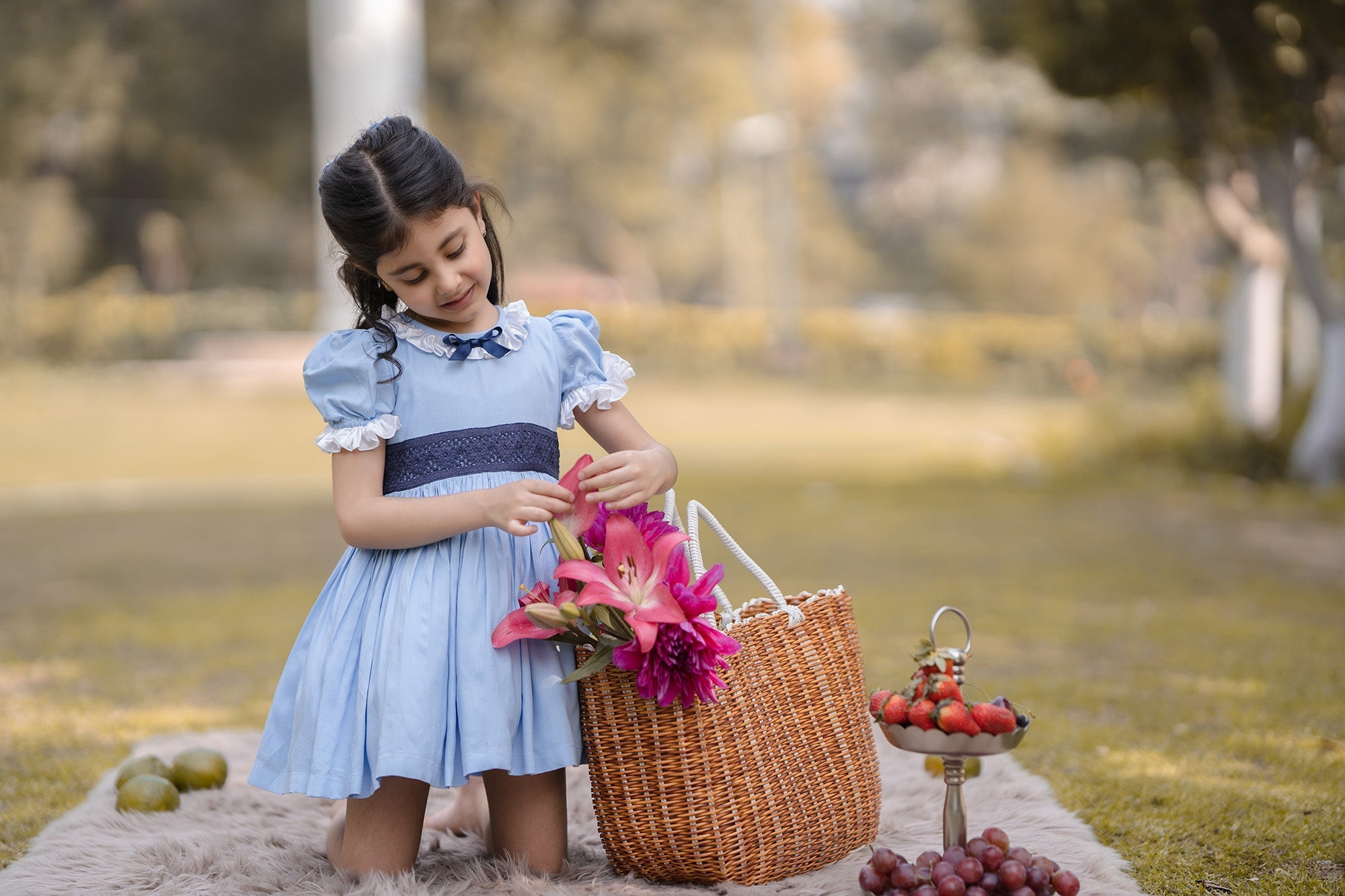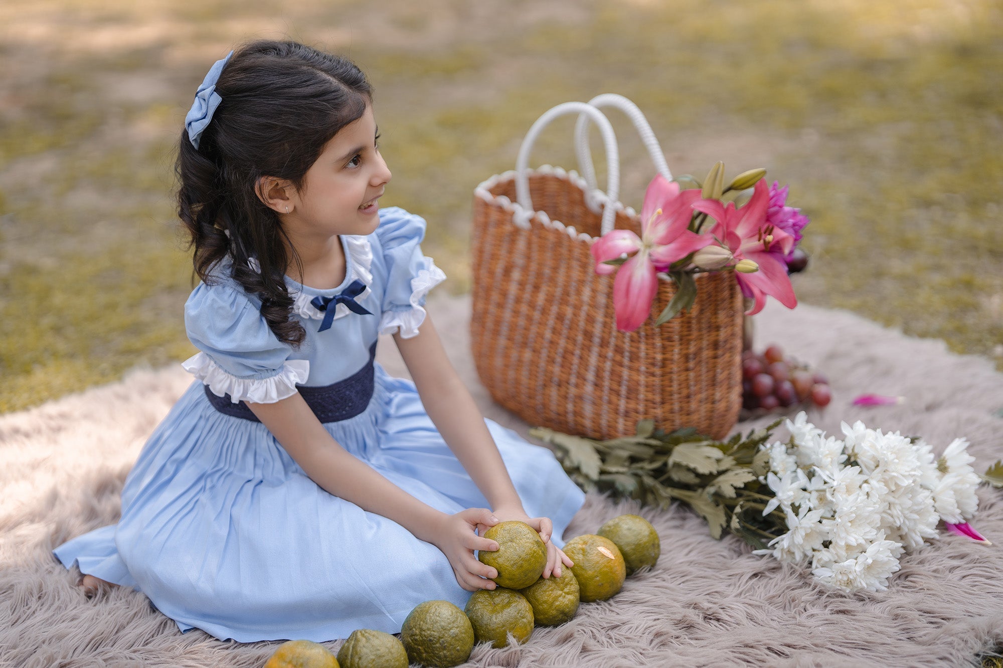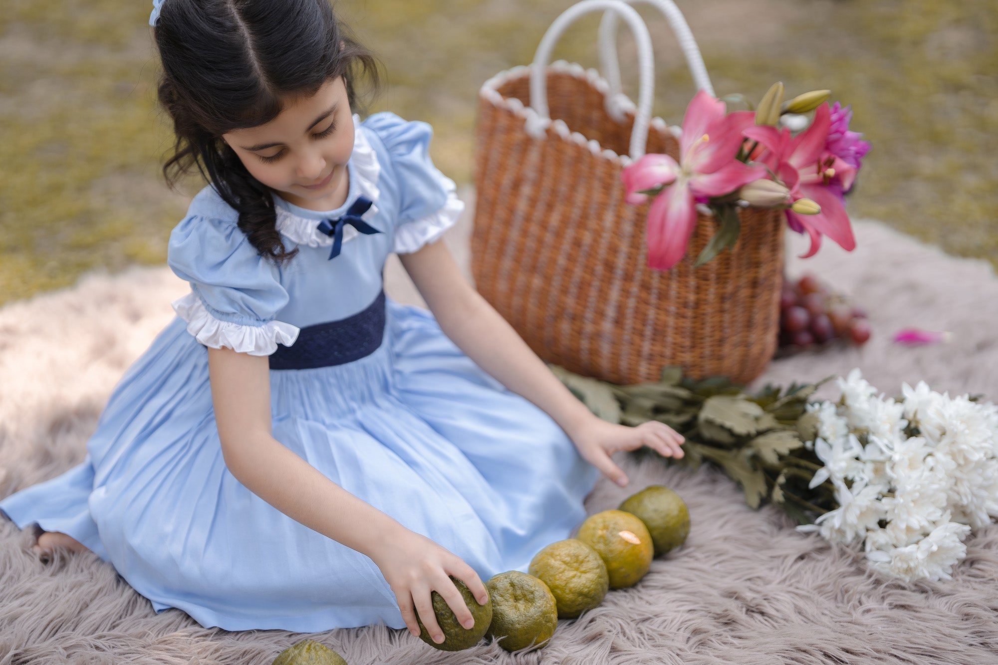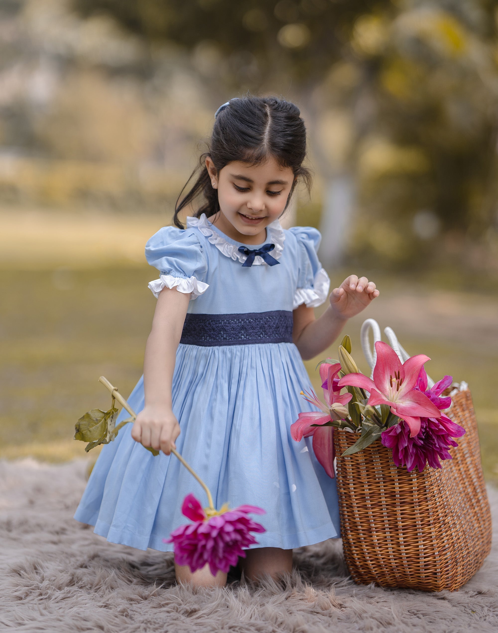 - LIGHT BLUE DRESS, WITH A NAVY BLUE BOW AND MESH APPLIQUE
