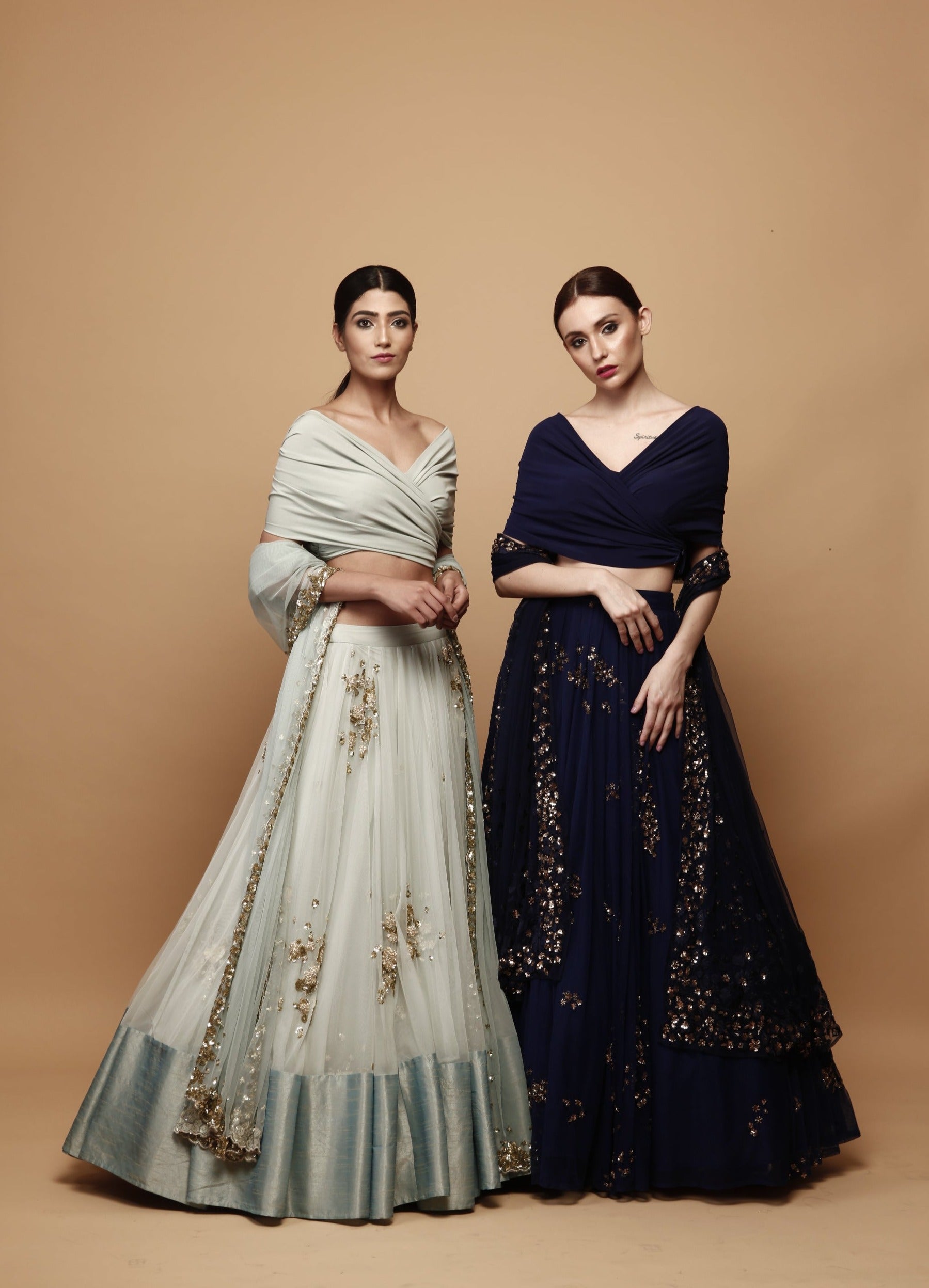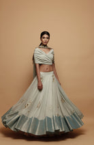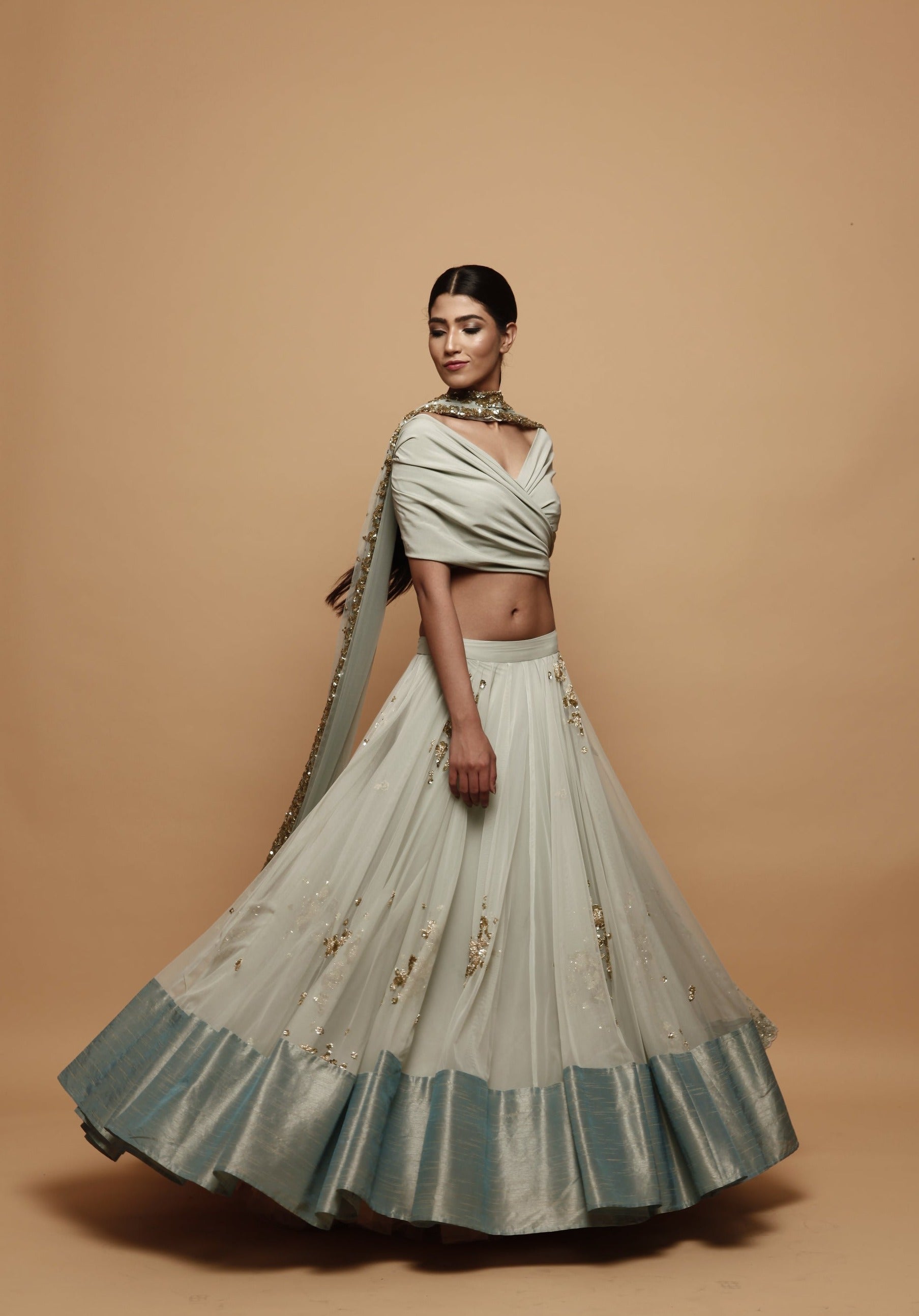 Featuring a LIGHT BLUE LEHENGA WITH DRAPE BLOUSE IN NET.