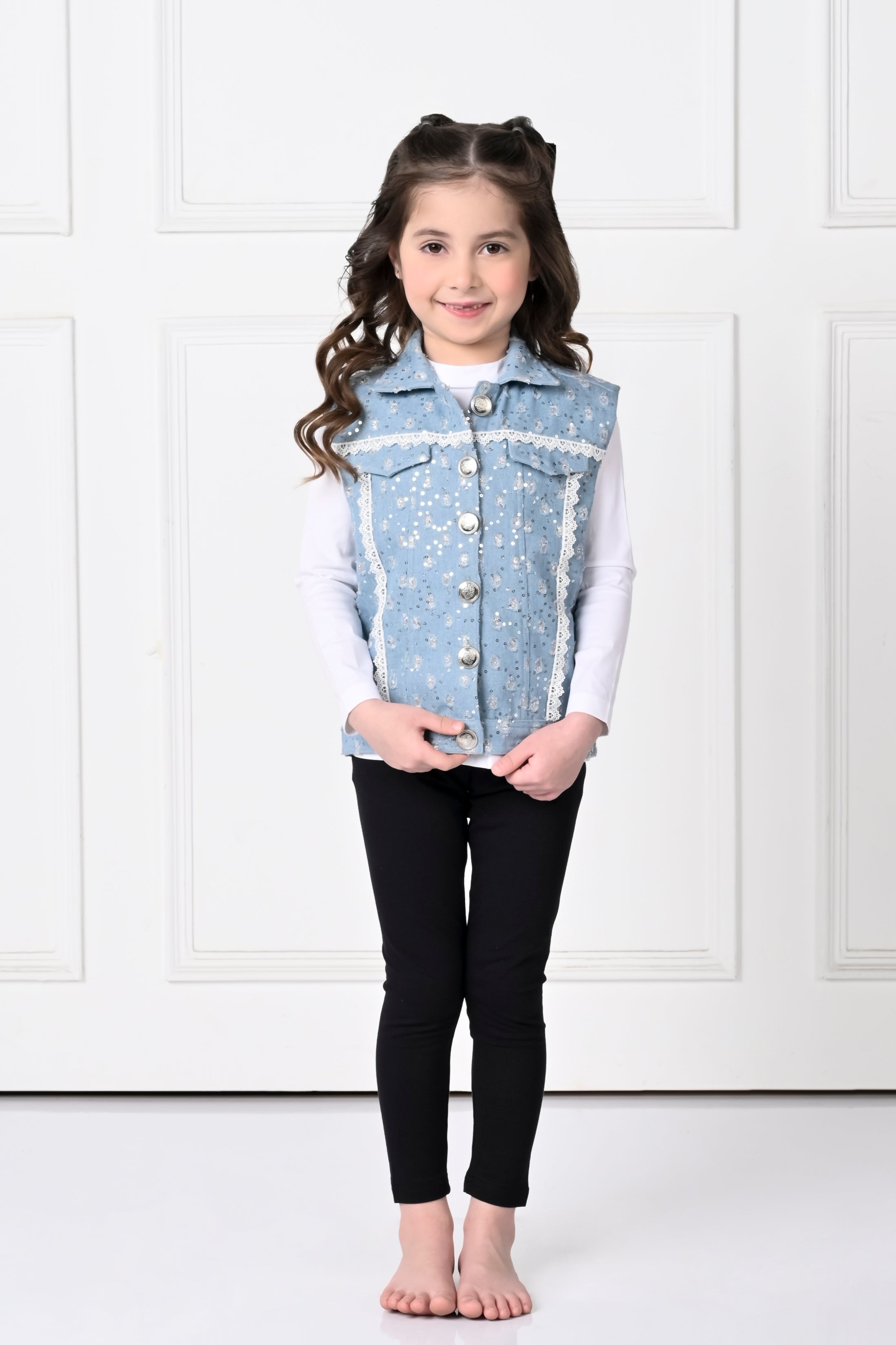 This Light Blue Over Size Sleeveless Lace Denim Jacket is a stylish and versatile addition to any wardrobe. The oversized fit provides comfort and a trendy look, while the lace detailing adds a feminine touch. The sleeveless design makes it perfect for layering, making it a must-have for any fashion-forward individual.