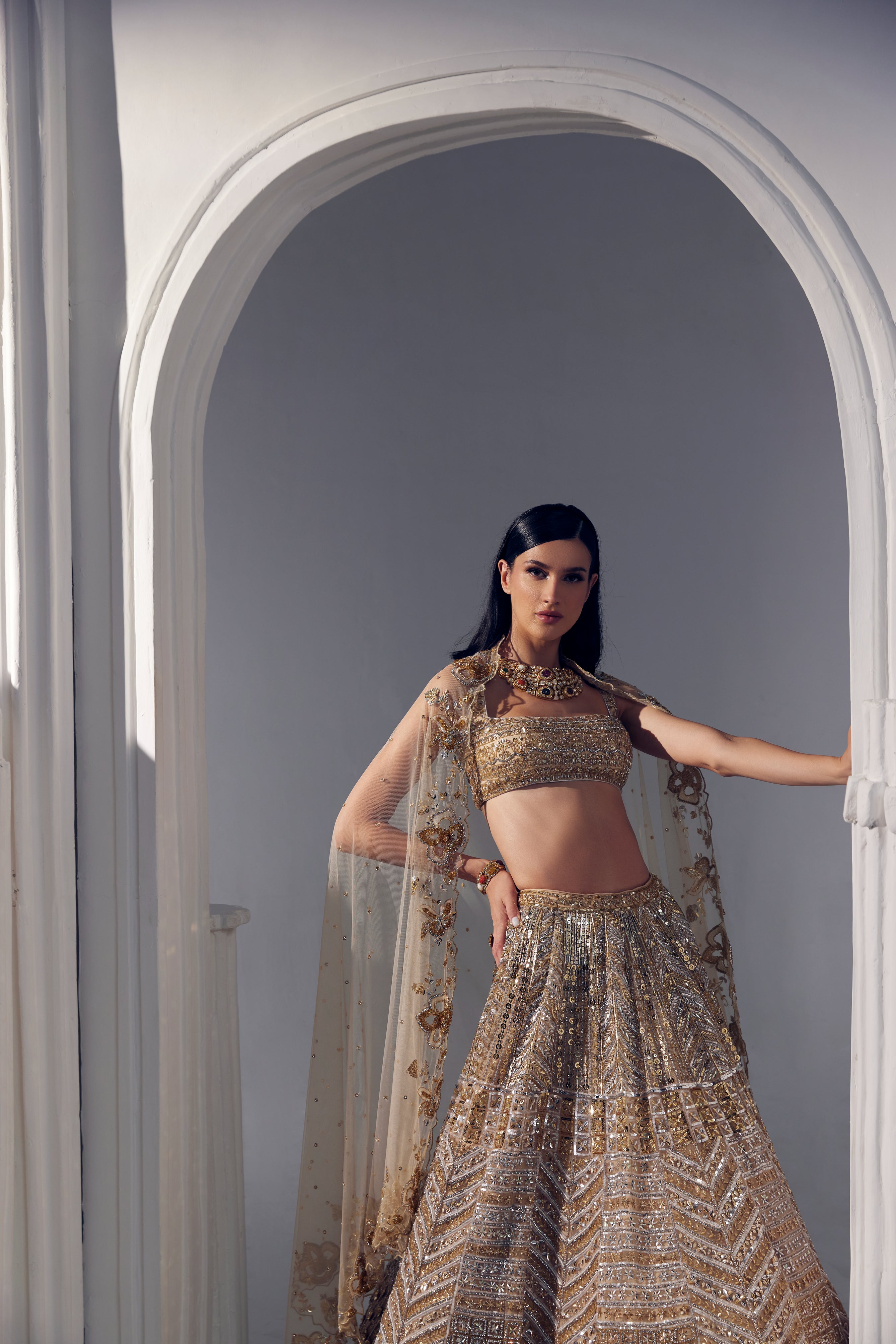 Light gold lehenga set featuring ruchika hurria statement embroidery elements on net base lined with silk. The set is paired with net duppatta with border on all 4 sides and scattered embroidery on the inside.