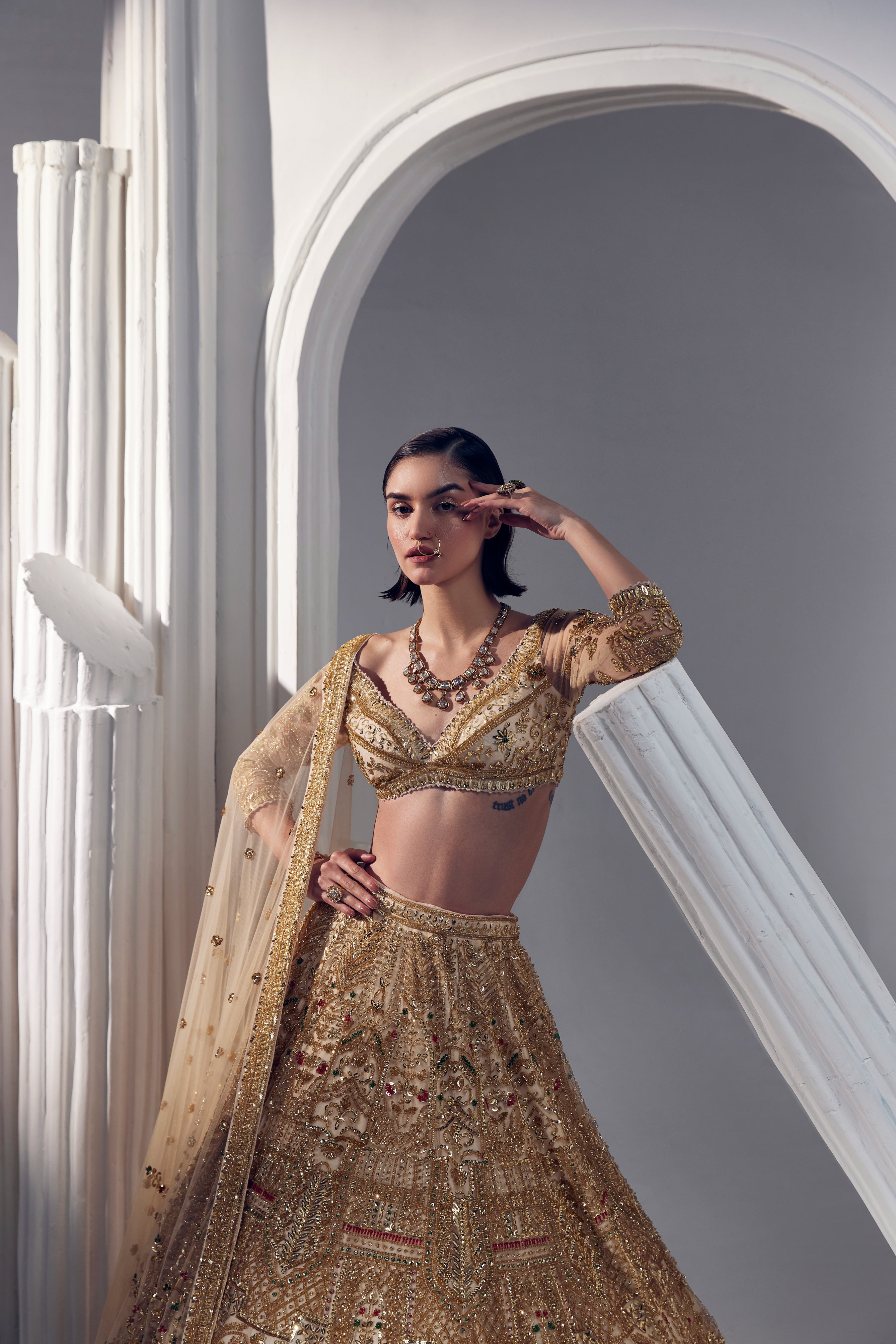 LIGHT GOLD LEHENGA SET FEATURING RUCHIKA HURRIA STATEMENT EMBROIDERY ELEMENTS ON NET BASE LINED WITH SILK. THE SET IS PAIRED WITH STATEMENT EMBROIDERED BLOUSE AND NET DUPPATTA WTIH CUTWORK BORDER ON ALL 4 SIDES, WITH SCATTERED SWAROSKI ELEMENTS SCATERED ON THE INSIDE.