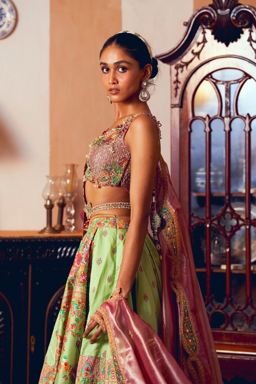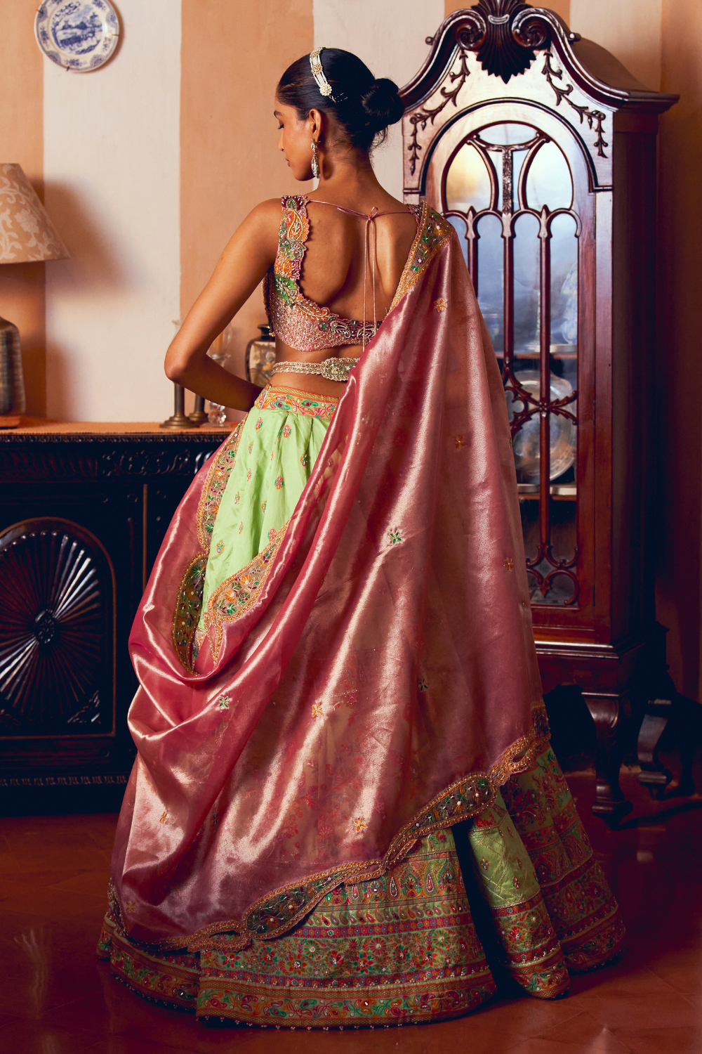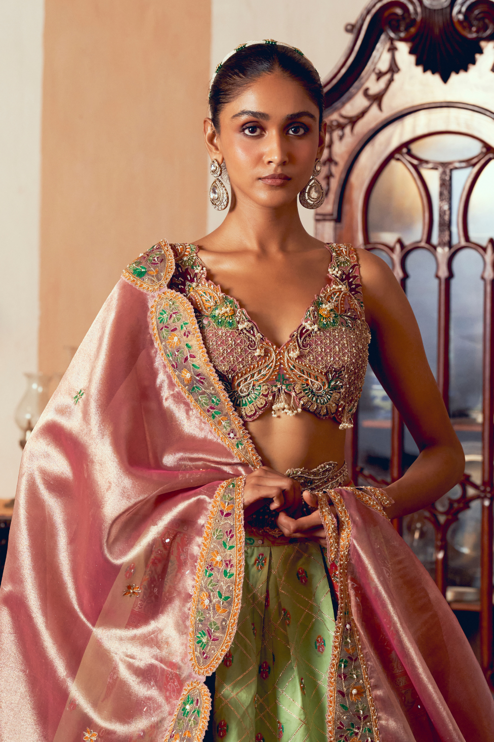 This Kalidar lehenga set in light green Jacquard Silk Banarasi features exquisite zari and zardosi embroidery. The ensemble is completed with a heavily embroidered blouse crafted from pastel pink tissue featuring floral embroidery pattern with a pastel pink silk zari tissue dupatta adorned with patchwork and floral boties, with a signature embellished belt creating a gracefully defined silhouette.