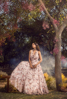Lilac organza lehenga with short peplum jacket lycra bustier heavily embroidered with 3-d flowers embellished with beads crystals and sequins