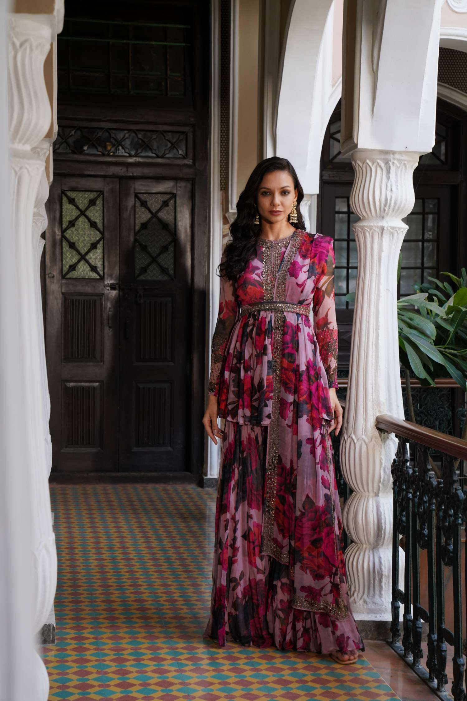 Featuring a Lilac Floral Peplum & Sharara Set in Chiffon.