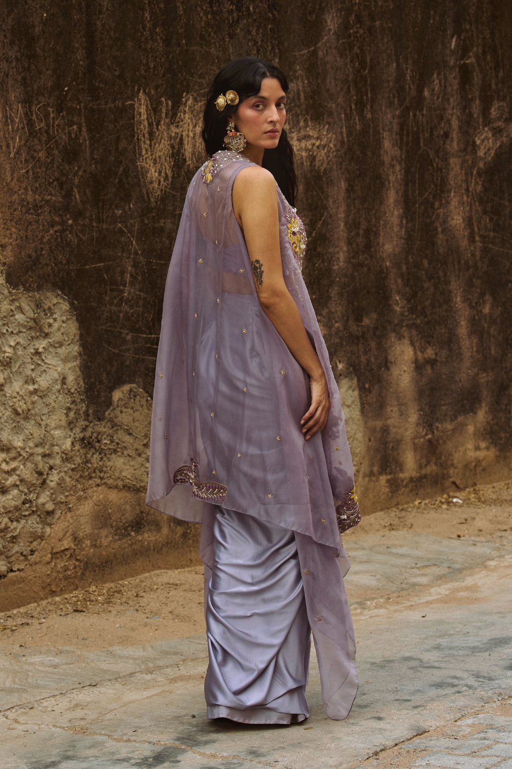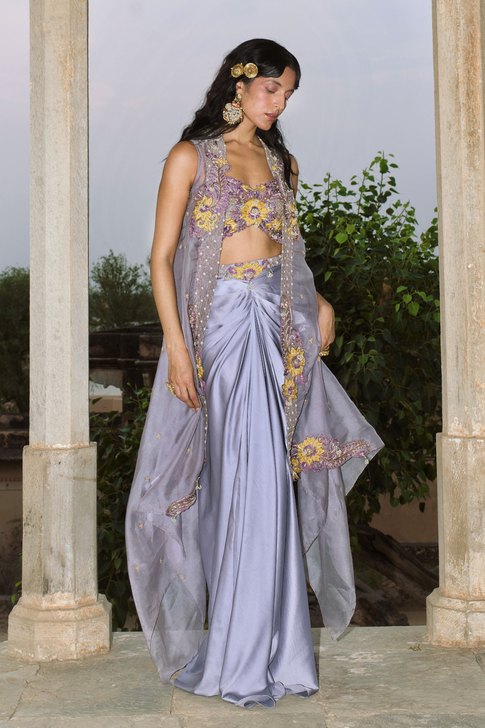 This soft lilac in Armani satin skirt showcases refined elegance with intricate detailing on the belt. It is paired with a finely embroidered blouse and cape, highlighted by vibrant yellow and purple florals, delicate yellow blooms, shimmering dori work, and subtle sequins - blending sophistication with graceful charm.