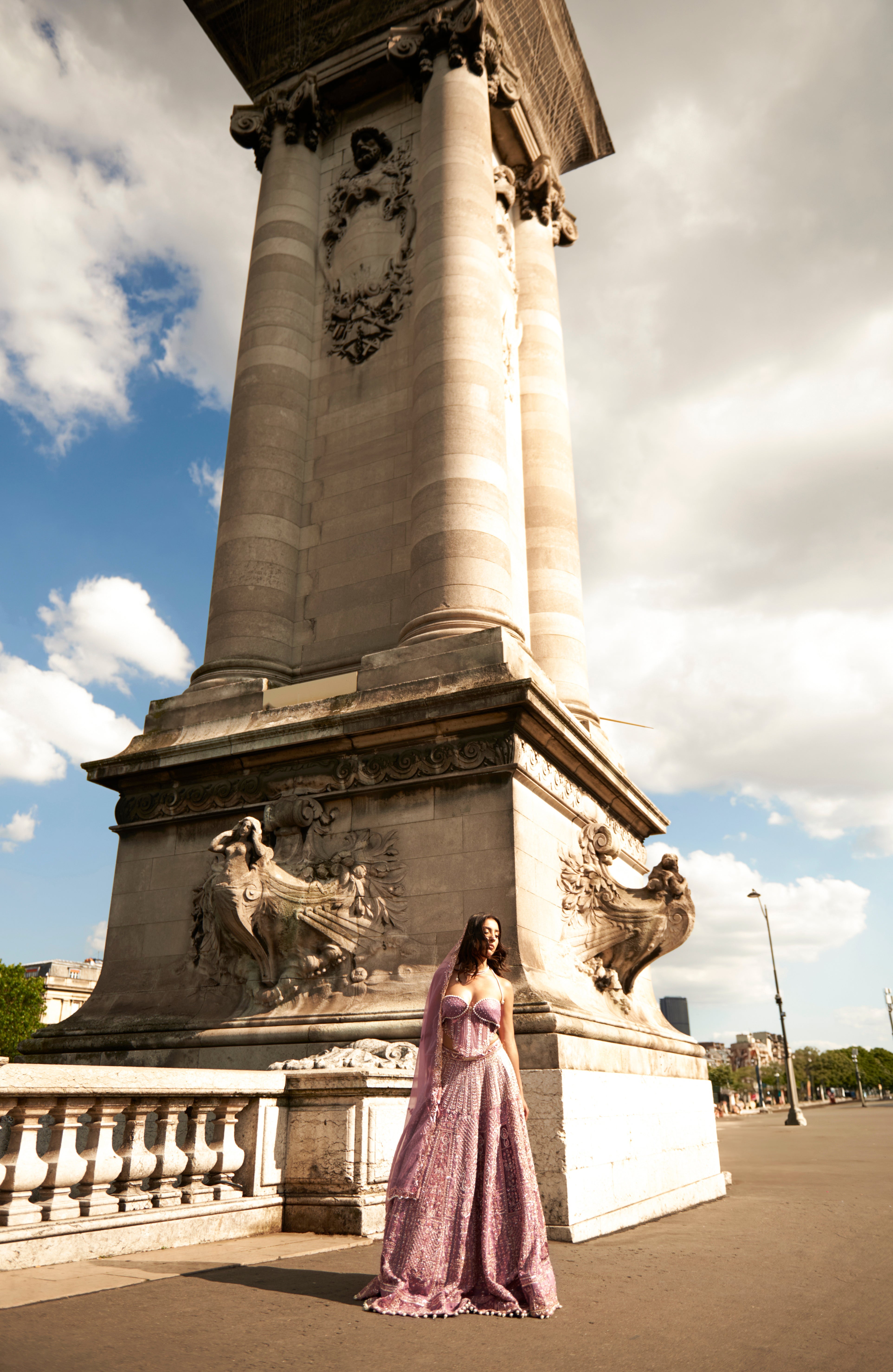 Lilac Raw Silk Lehenga Set, embellished with intricate handwork embroidery and delicate pearl details. The raw silk lehenga offers a luxurious feel, complemented by a net and raw silk blouse featuring a delicate corset and off-shoulder design. Complete with a matching net dupatta,