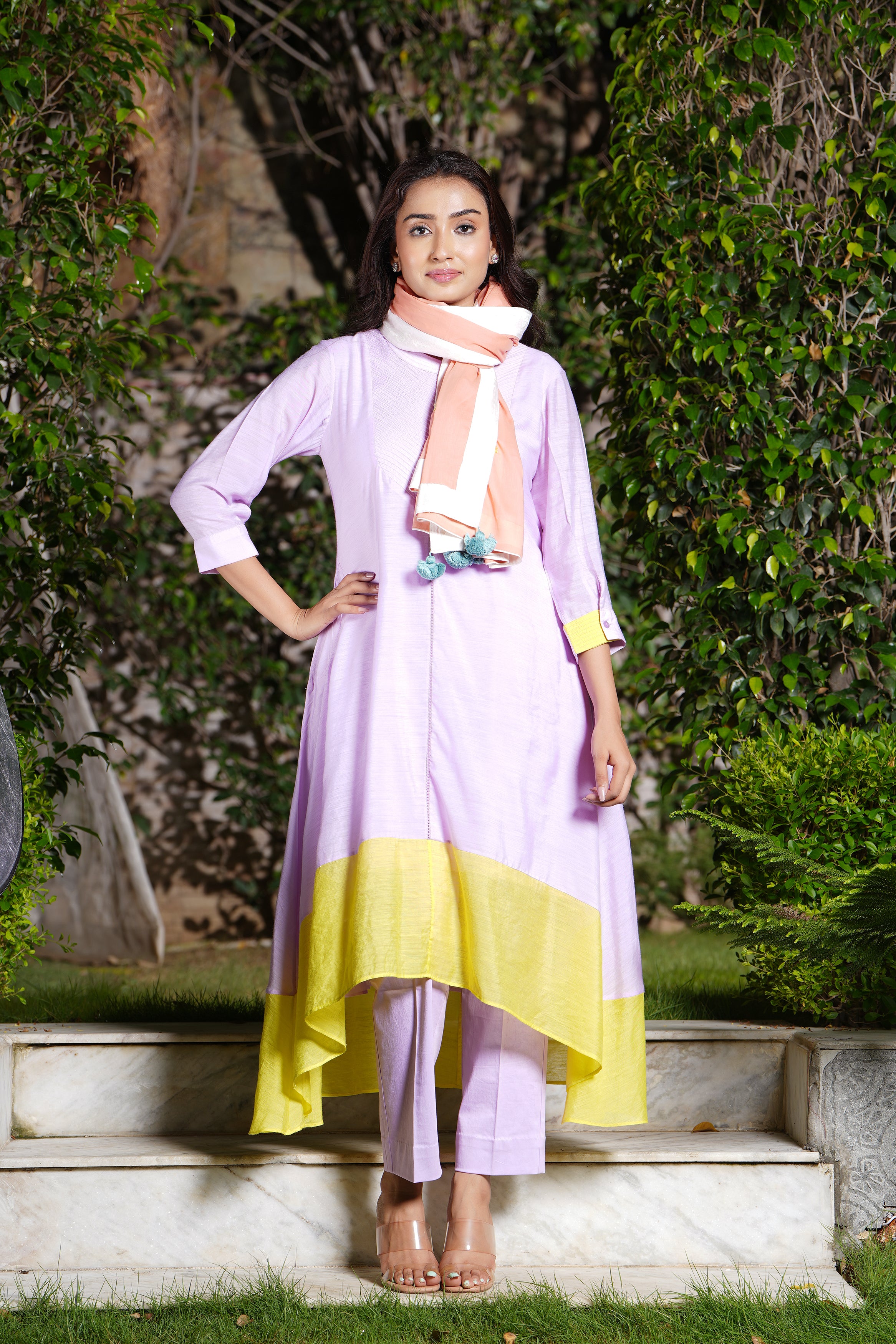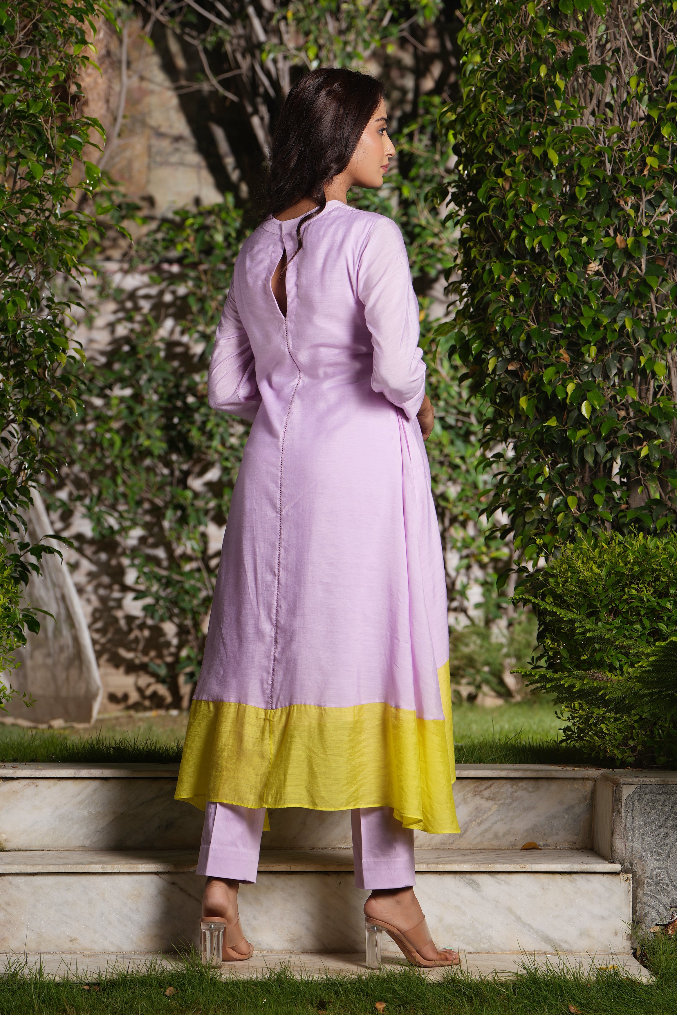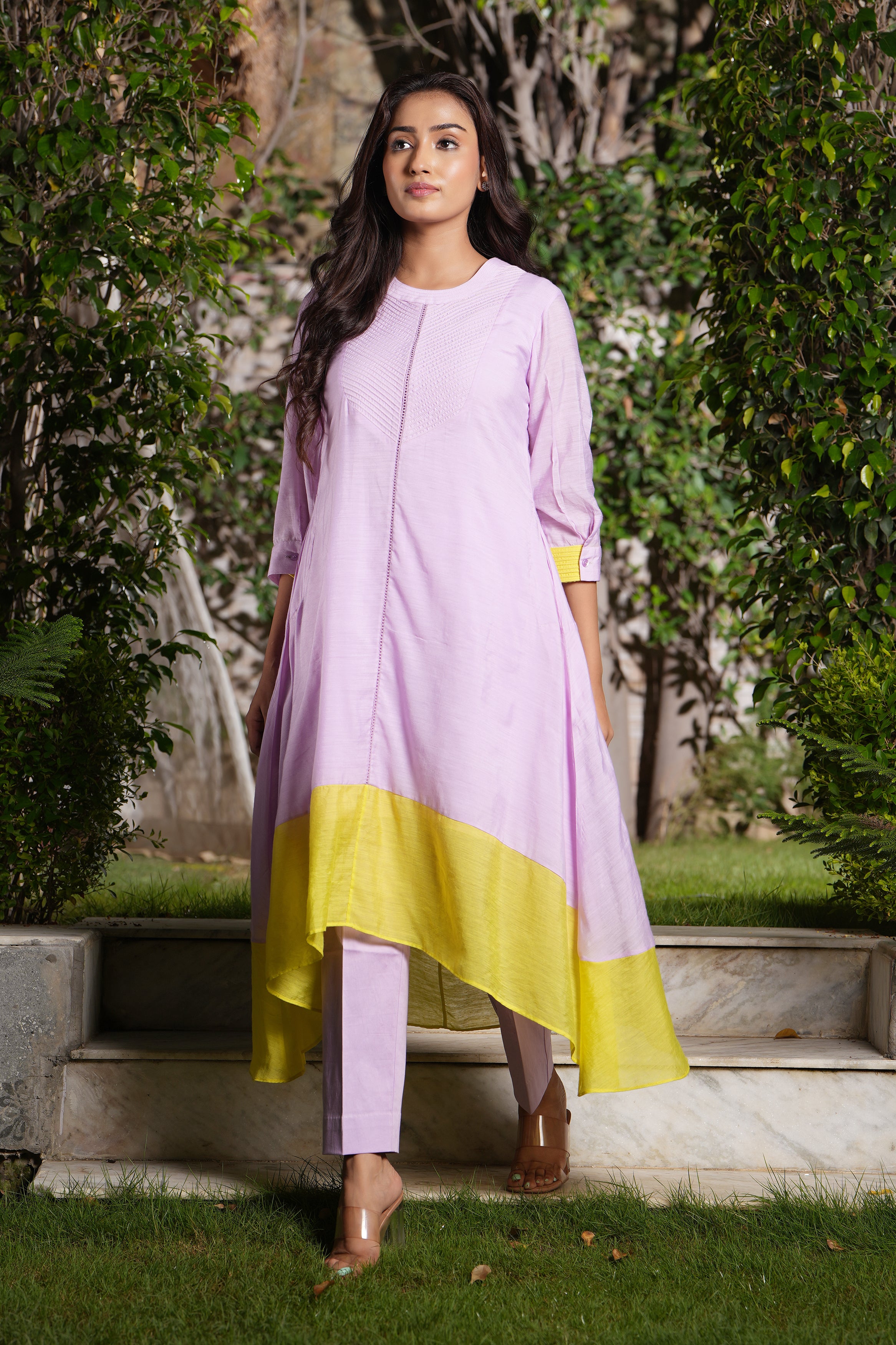 Quilted yoke with colour blocking A line asymmetrical kurta paired with self colour relaxed pants. Beading lace details, back opening.