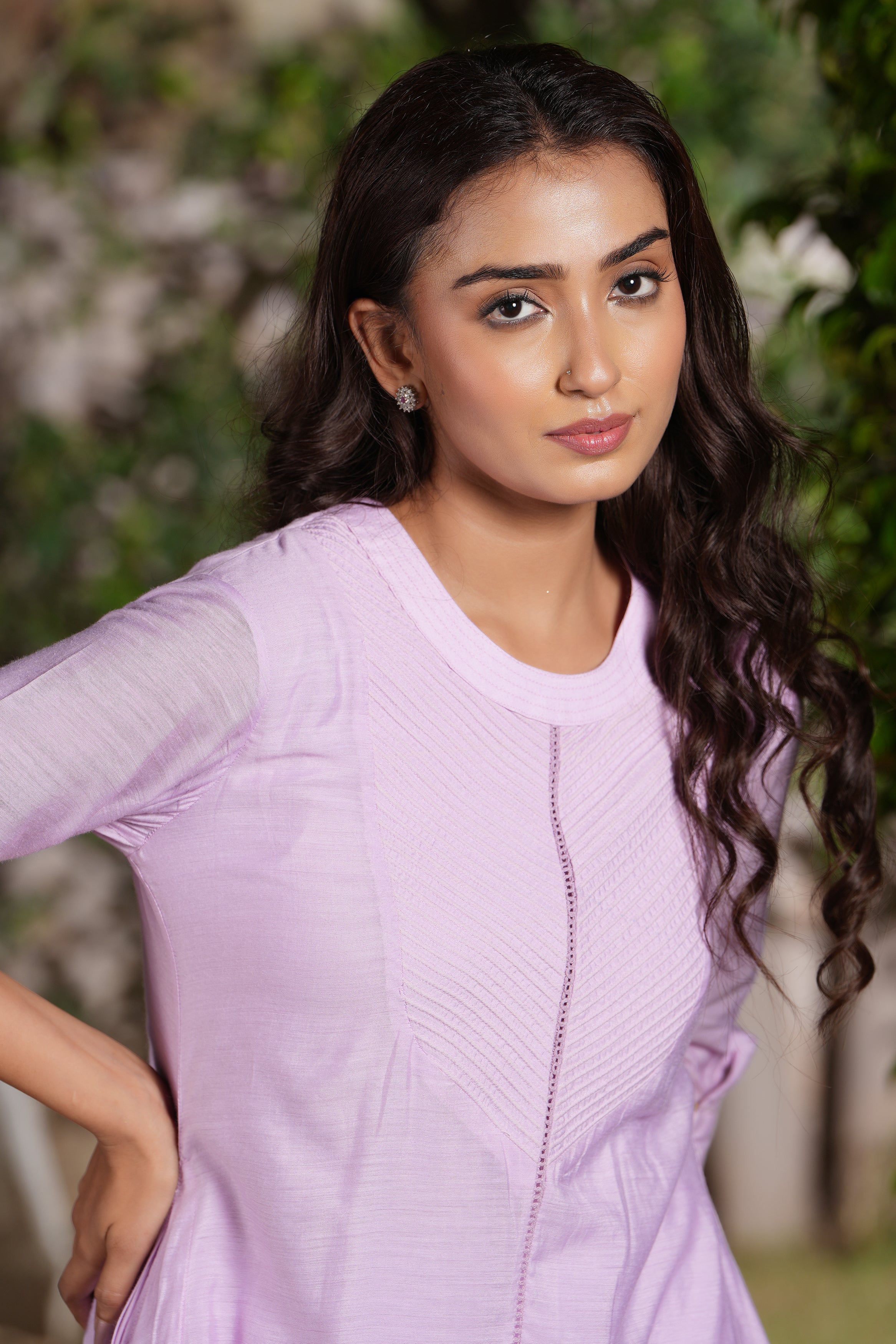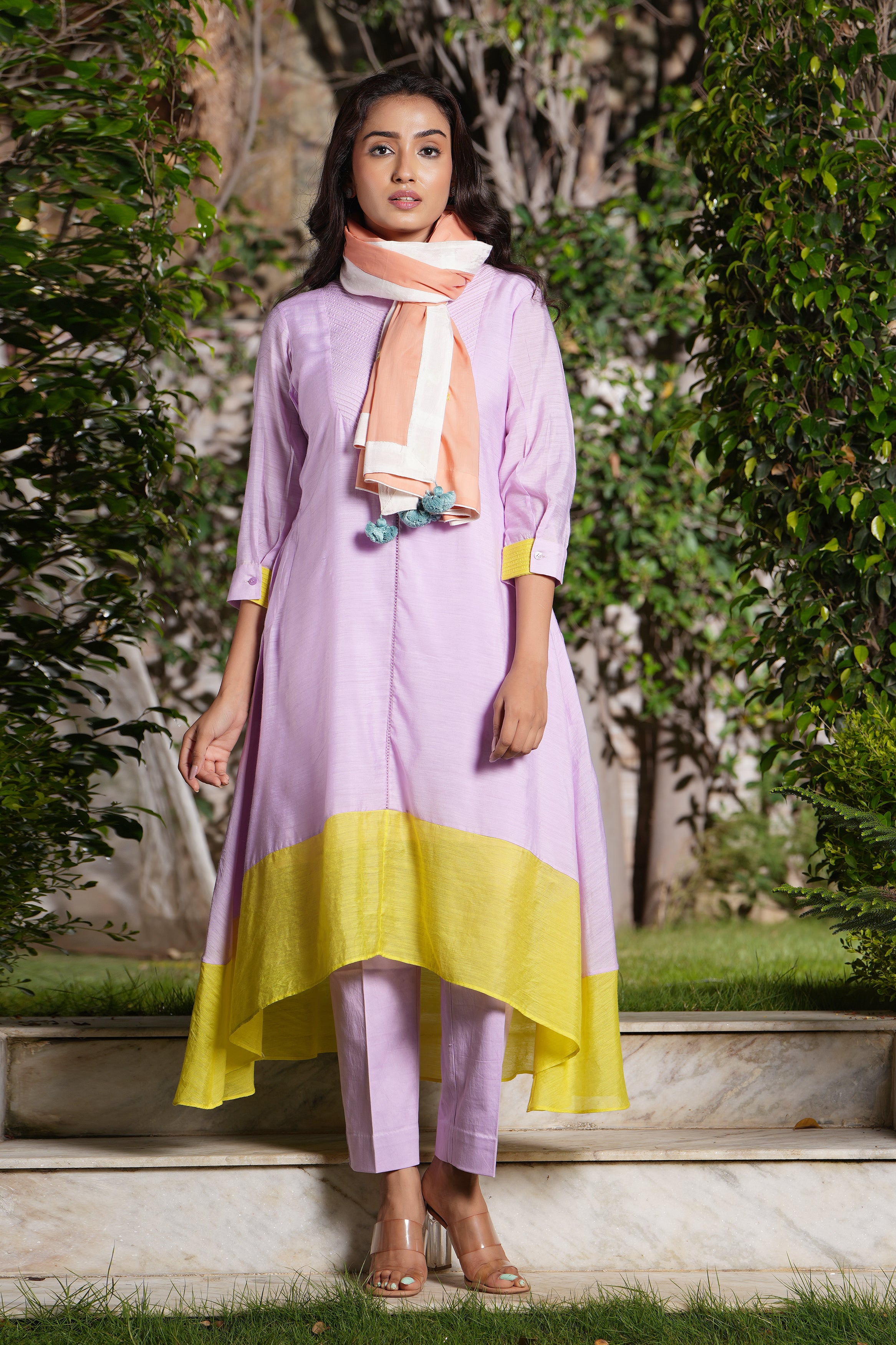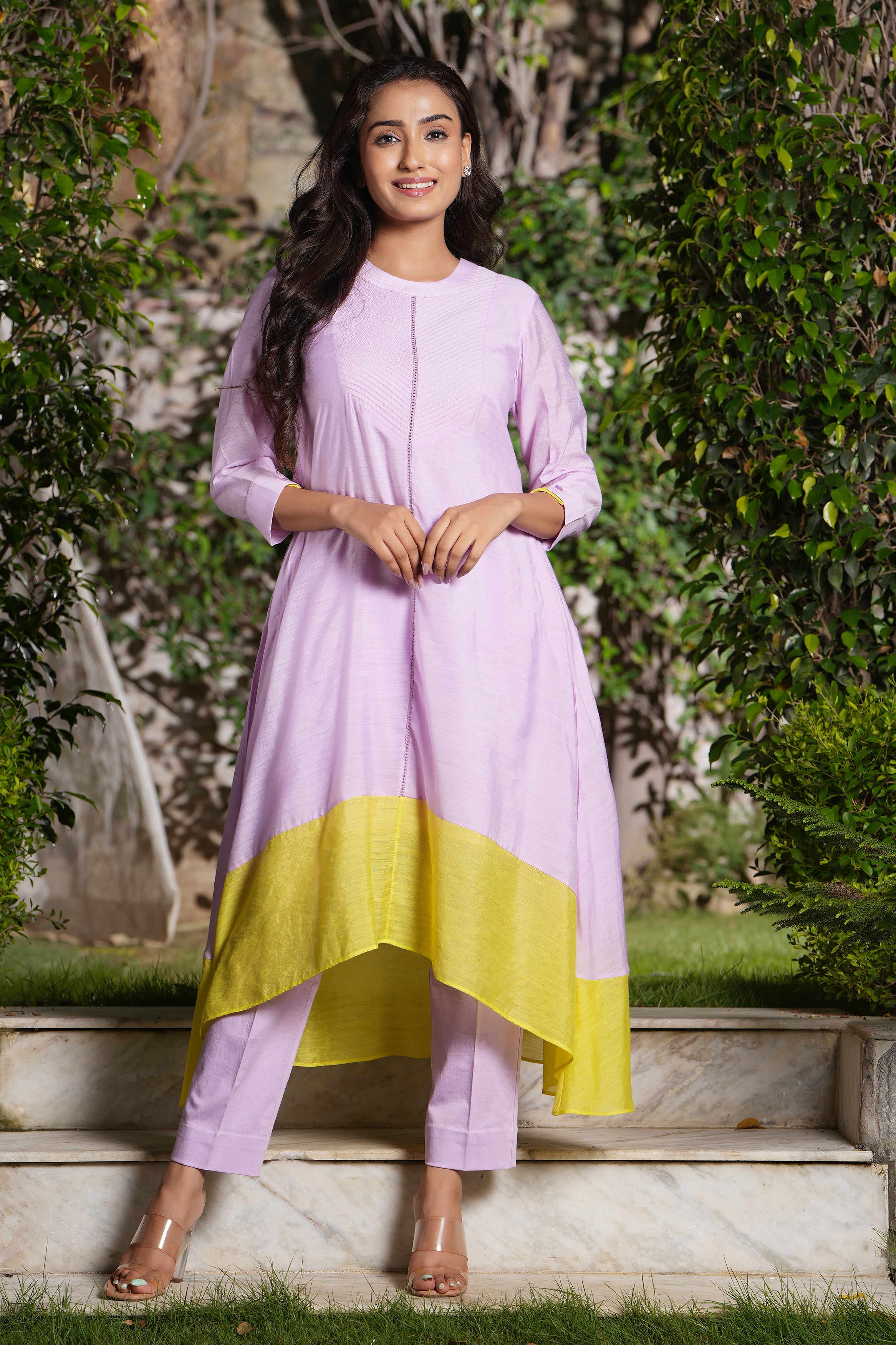 Quilted yoke with colour blocking A line asymmetrical kurta paired with self colour relaxed pants. Beading lace details, back opening.