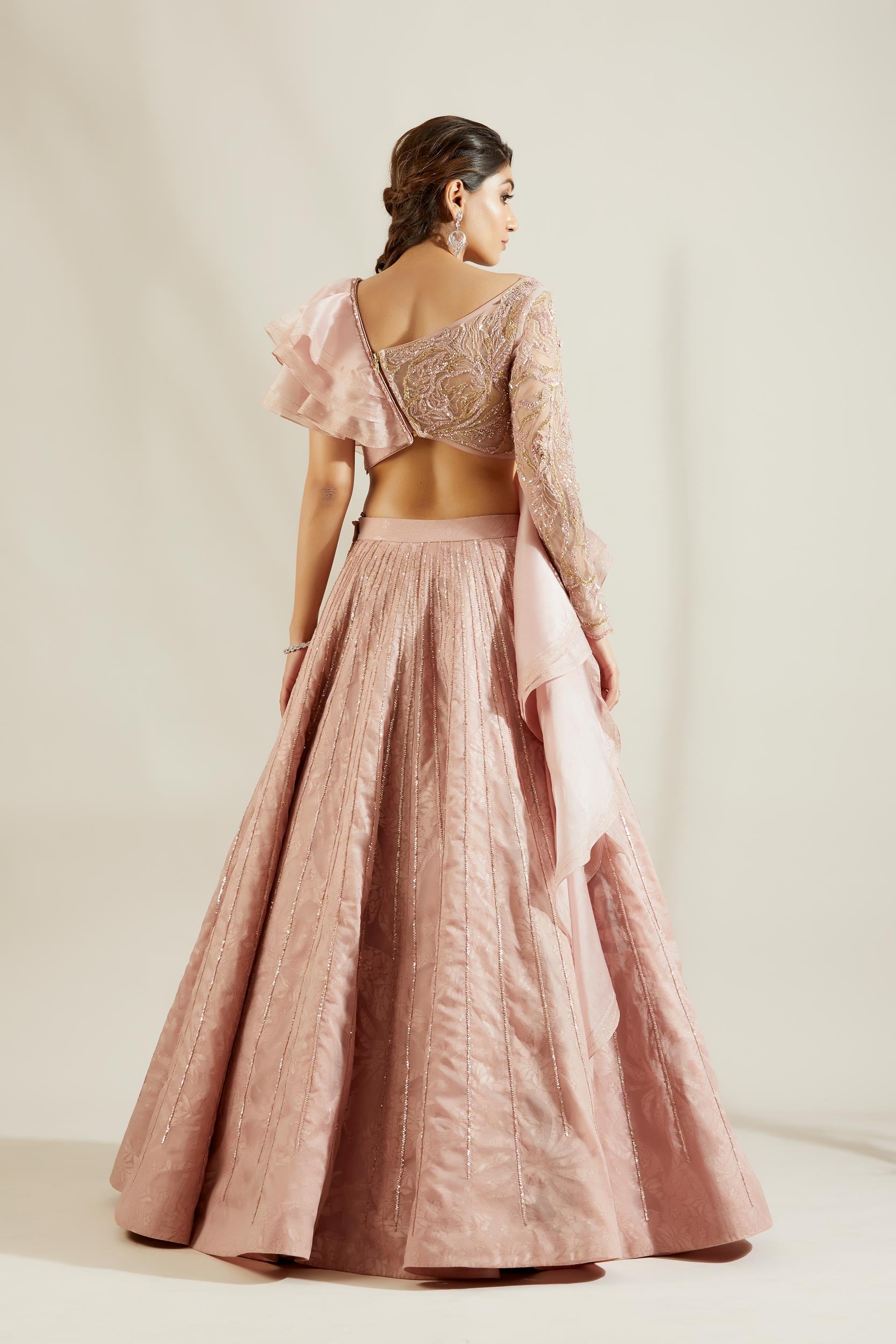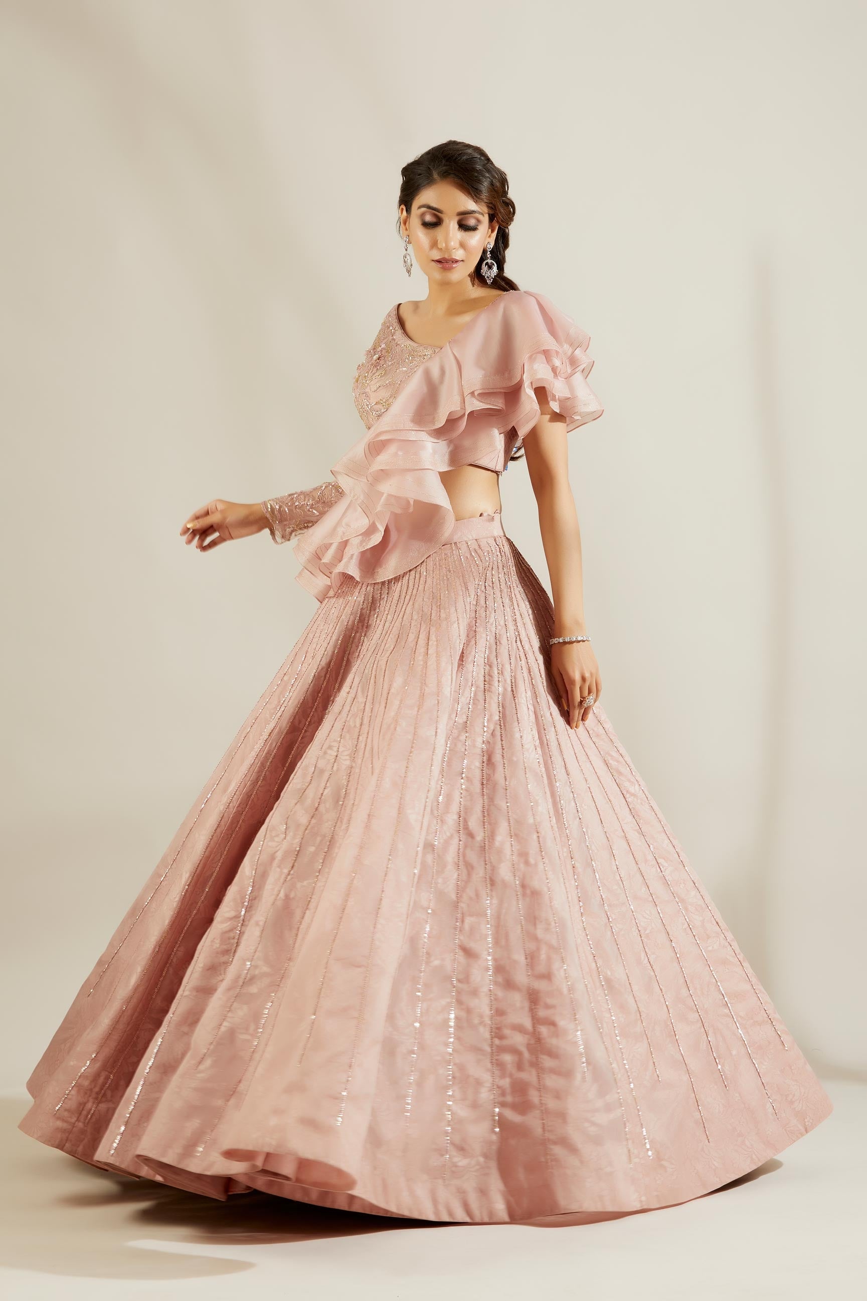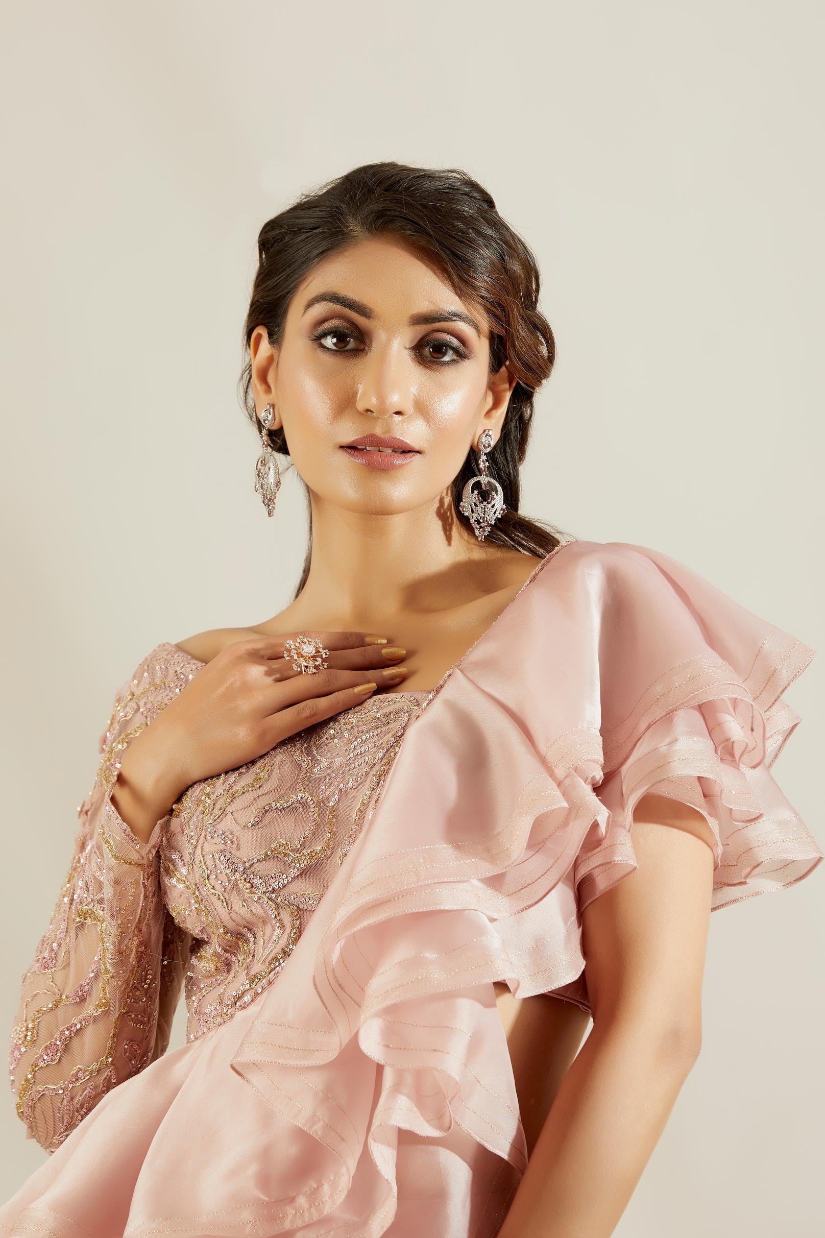 lavender one shoulder ruffle top with placement brush stroke embellishment comes with big flower skirt
