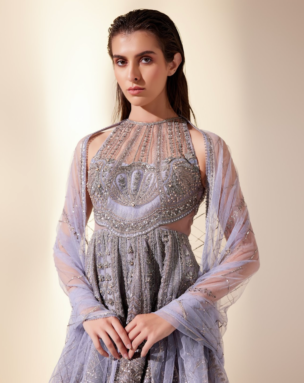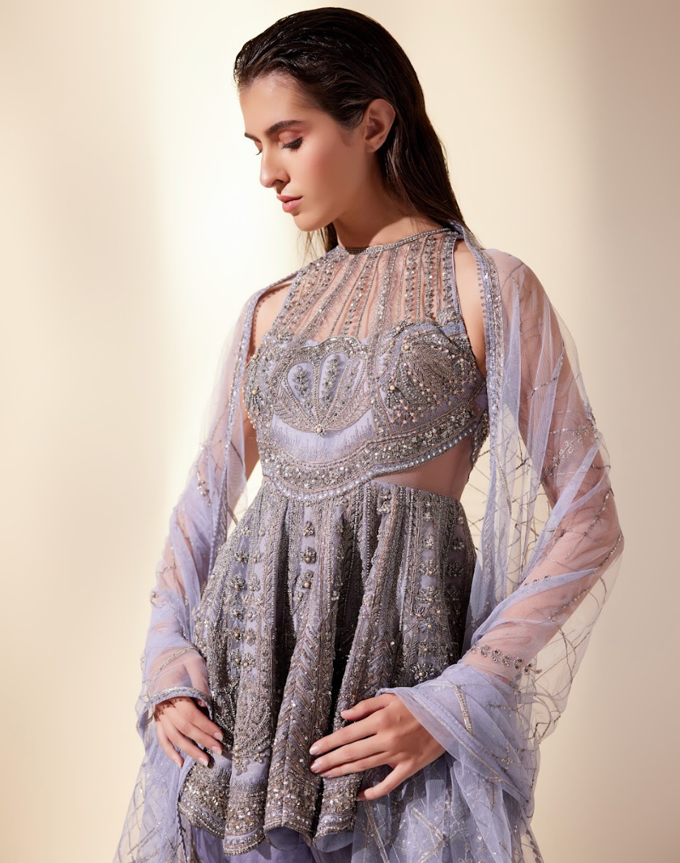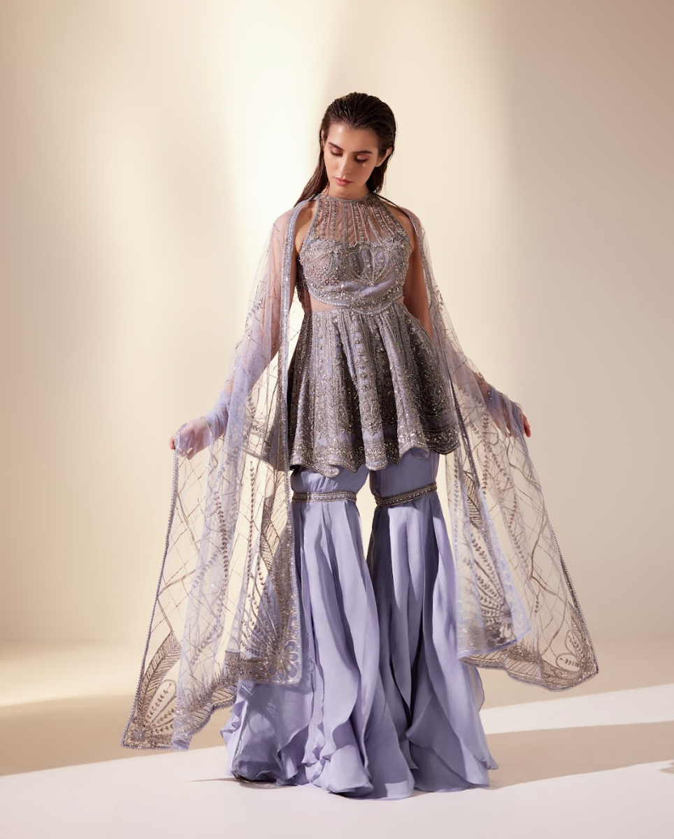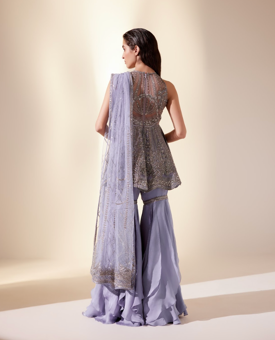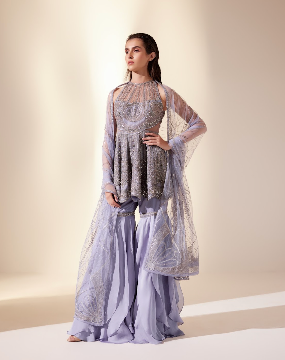 crafted in a lilac hue embroidered kurta paired with swirl pattern sharara
