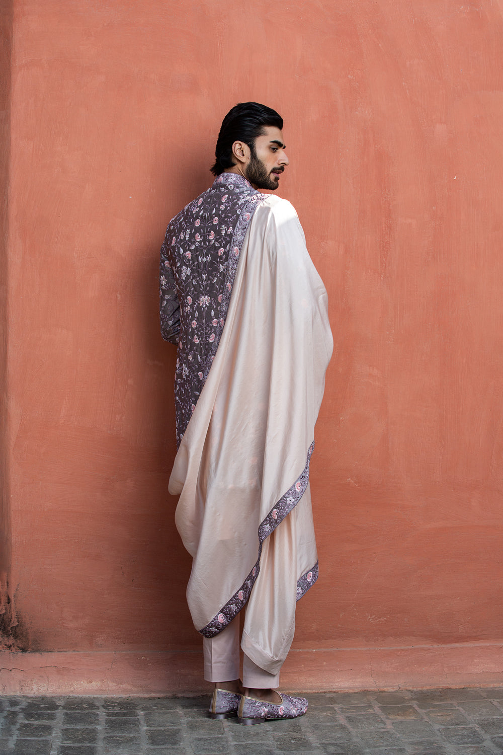 Lilac Taffeta achkan all over embroidered in a floral resham jaal with french knots, mirrors, and beadwork paired with a nude tussar silk kurta and cotton lycra trousers.