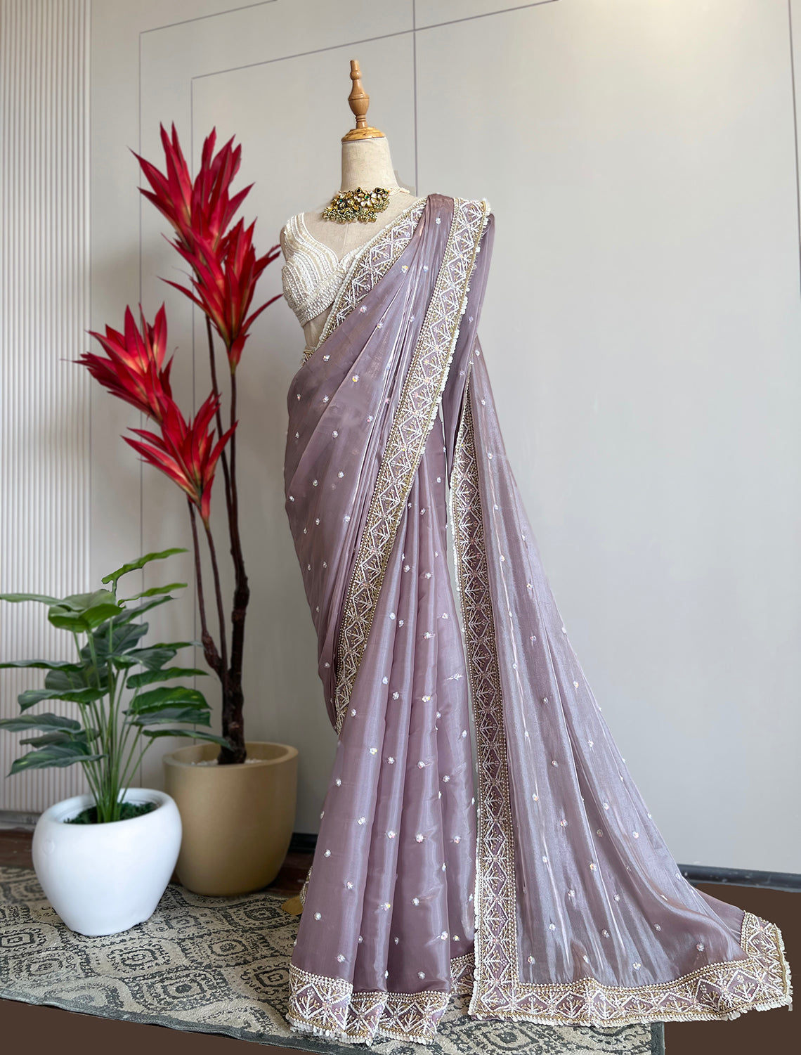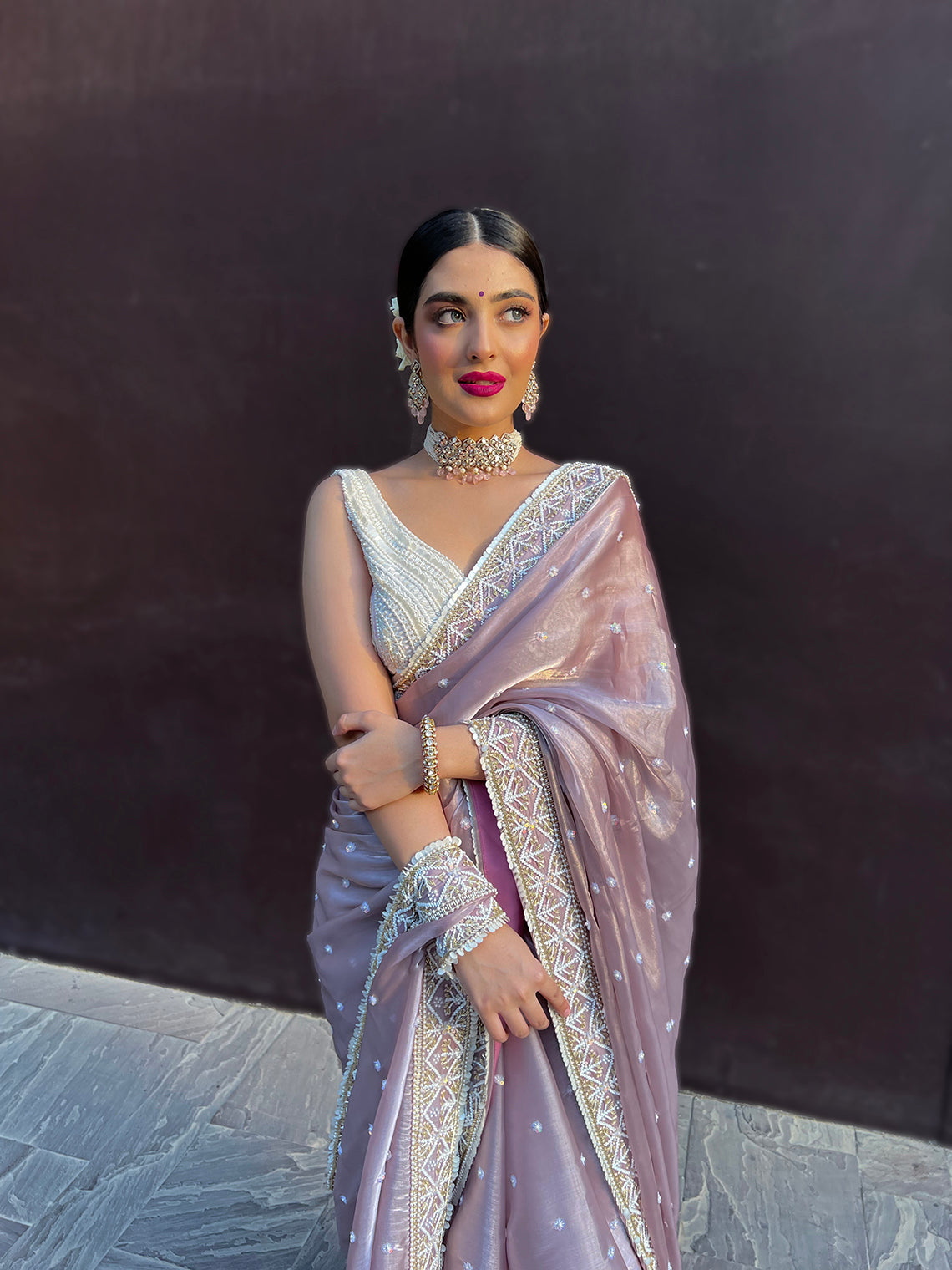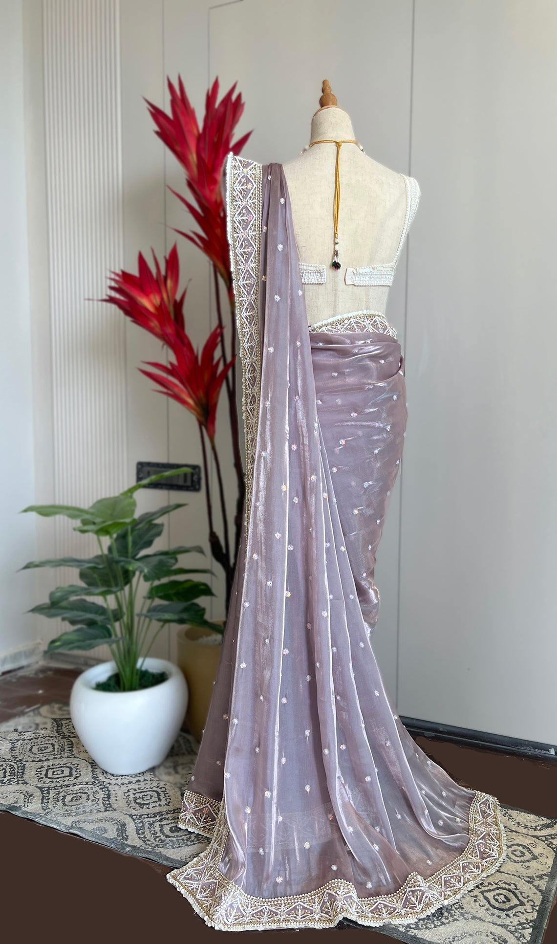 Custom Lilian saree set is a beautiful Tissue Organza Saree set. This 6 yard tissue organza saree set comes with an intricate pearl detailed border. It’s a perfect representation of beauty.