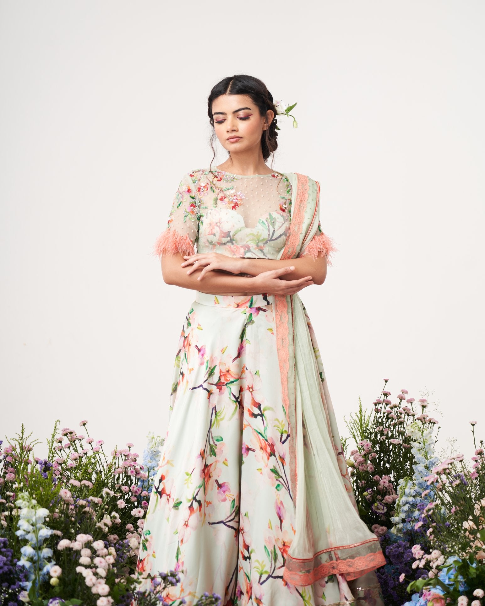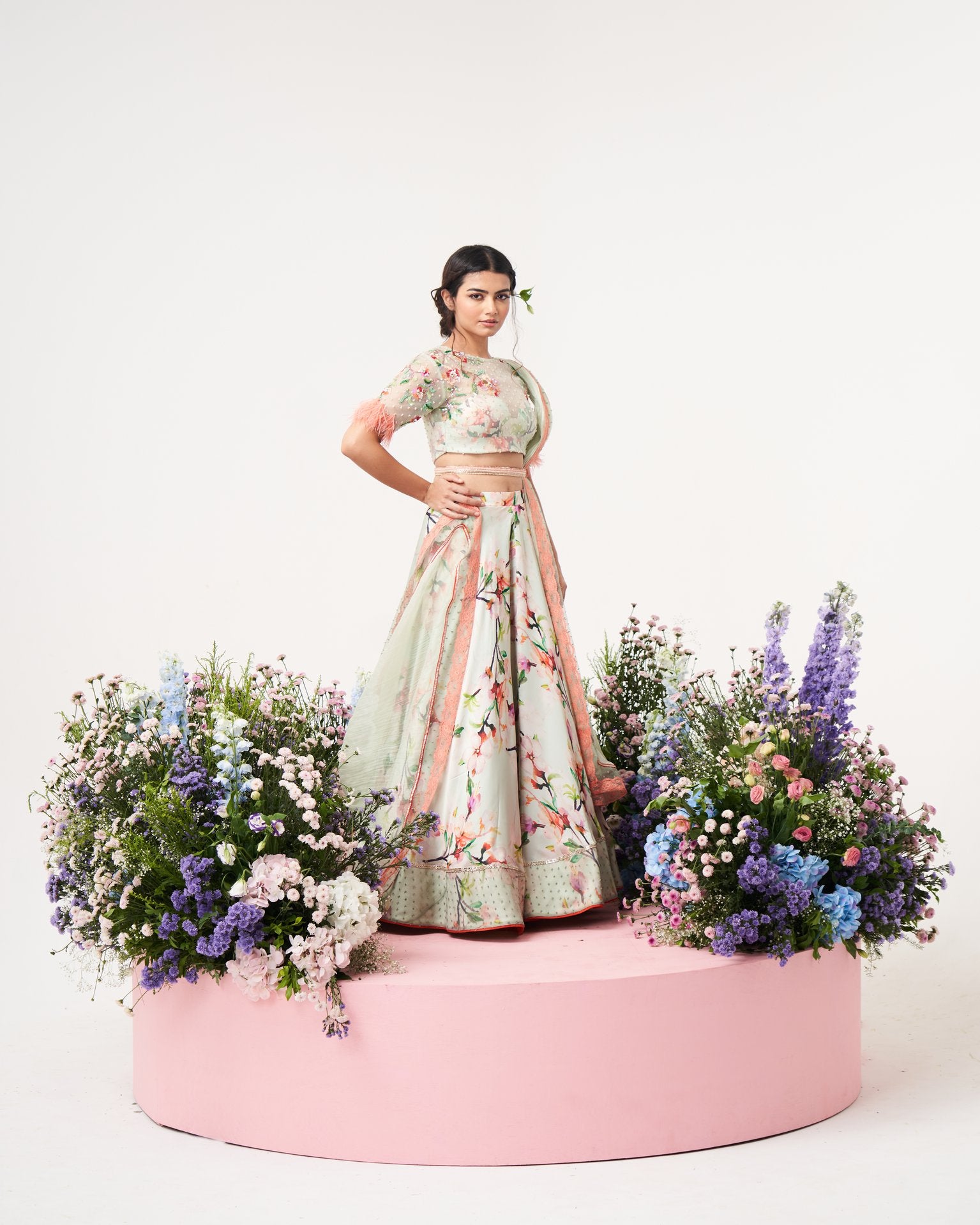 The Lilium Crème de Mint Lehenga Set is a breathtaking ensemble that exudes ethereal beauty. The mint-colored lehenga features intricate lilium motifs, while the matching blouse adds glamour. Perfect for weddings and festive events, this set combines elegance and grace in a captivating design.