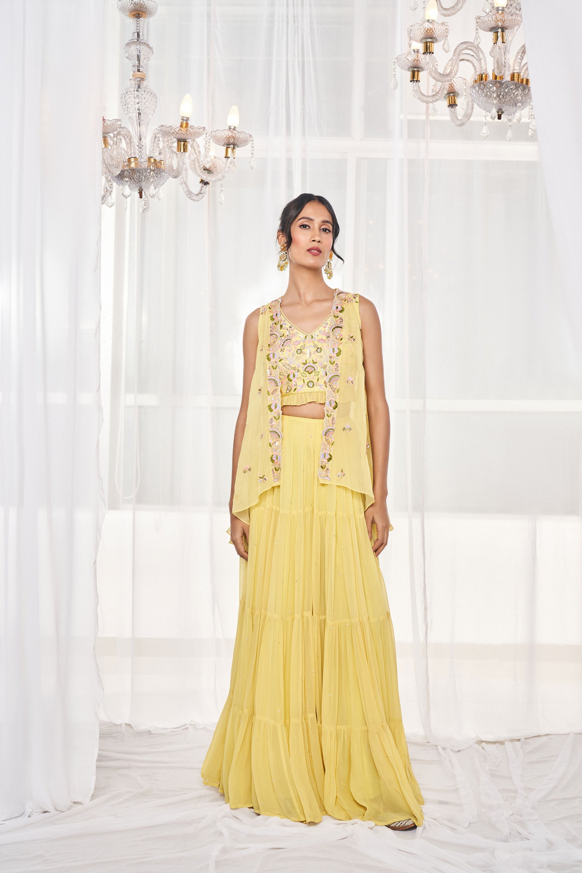 Featuring a Lime Green blouse in silk base along with a flared jacket in soft organza base embellished with multicolor thread and sequin embroidery. It is paired with a matching sharara in georgette base with pearl and sequin sprinklers.