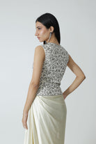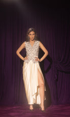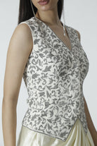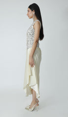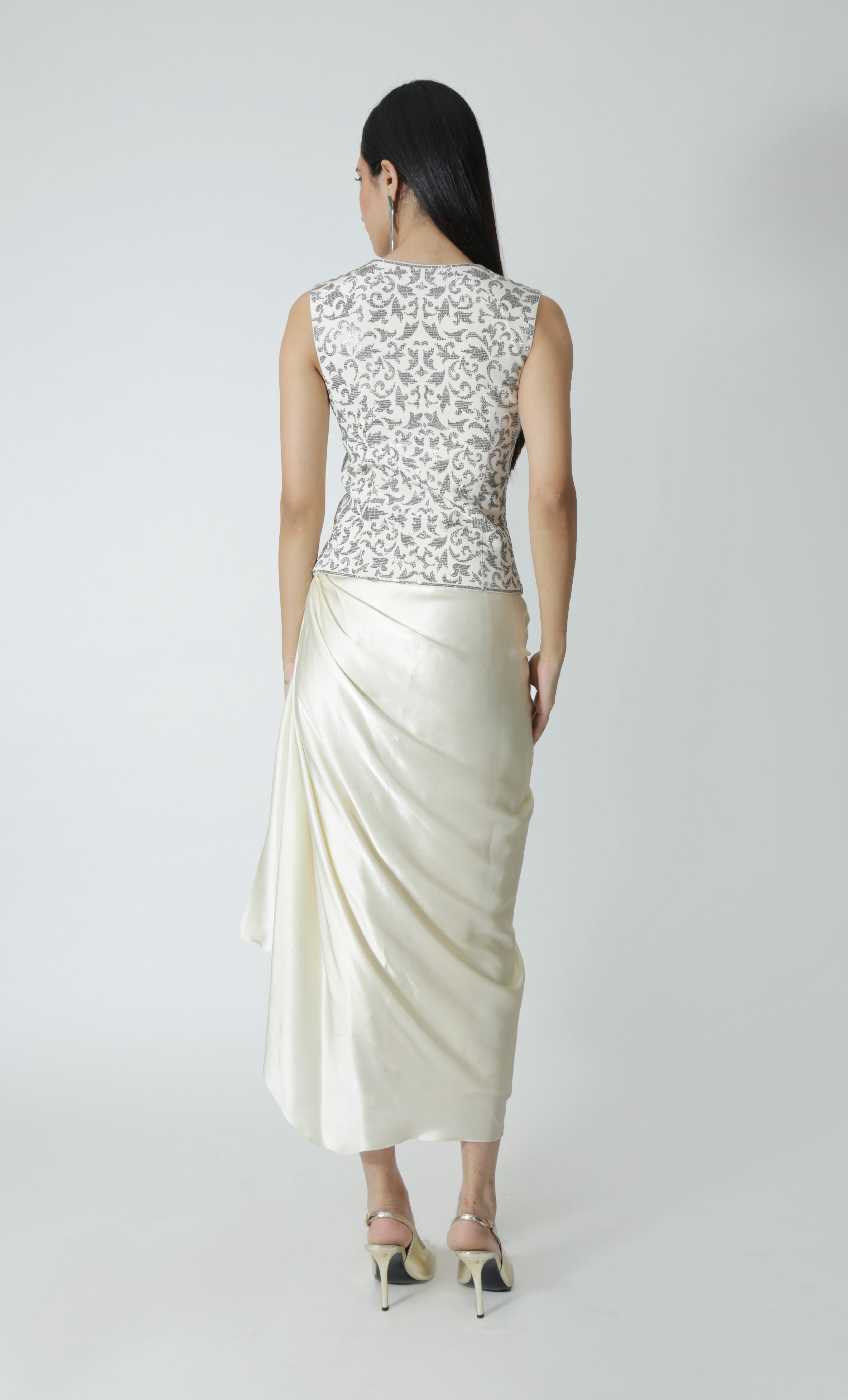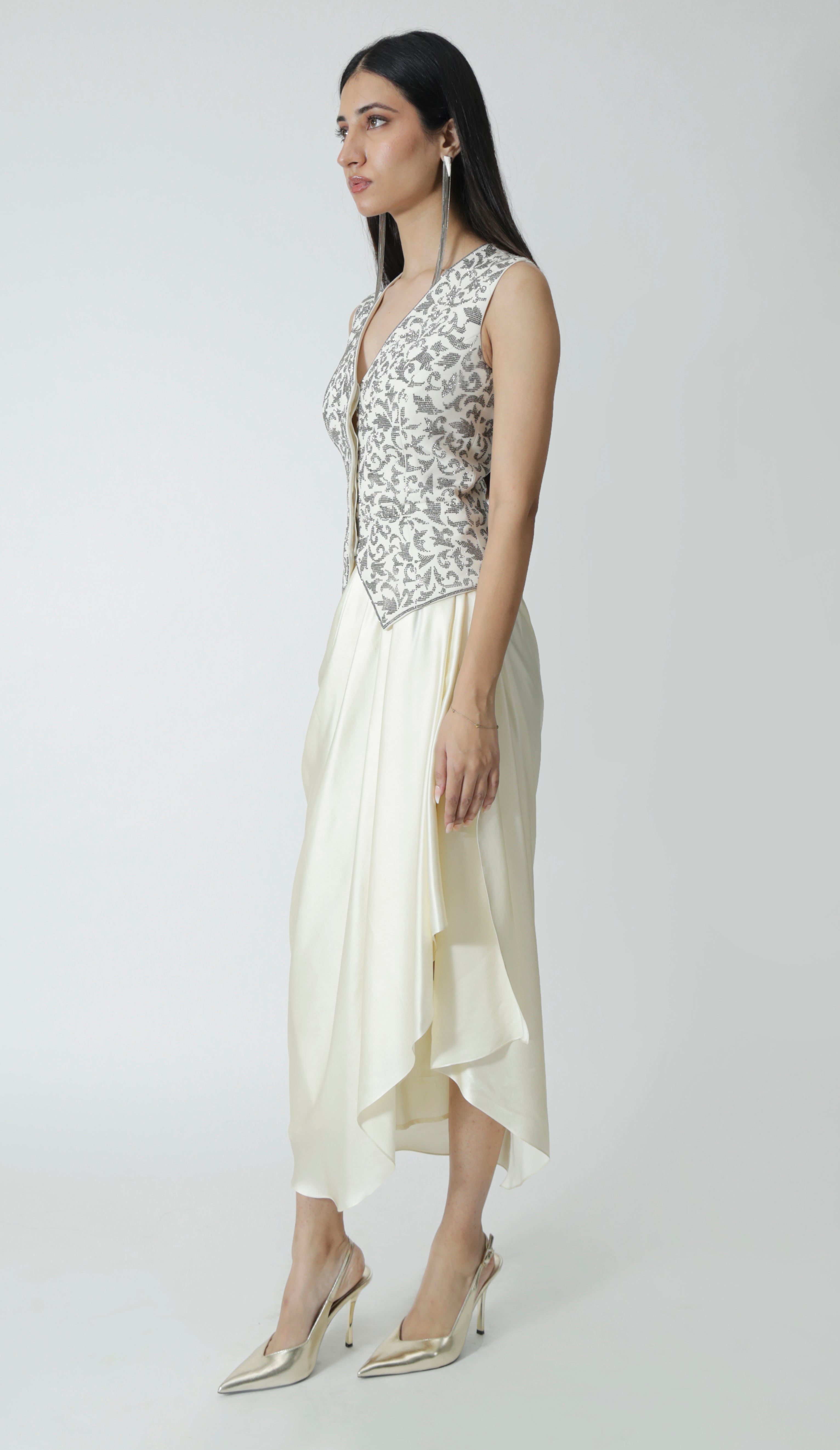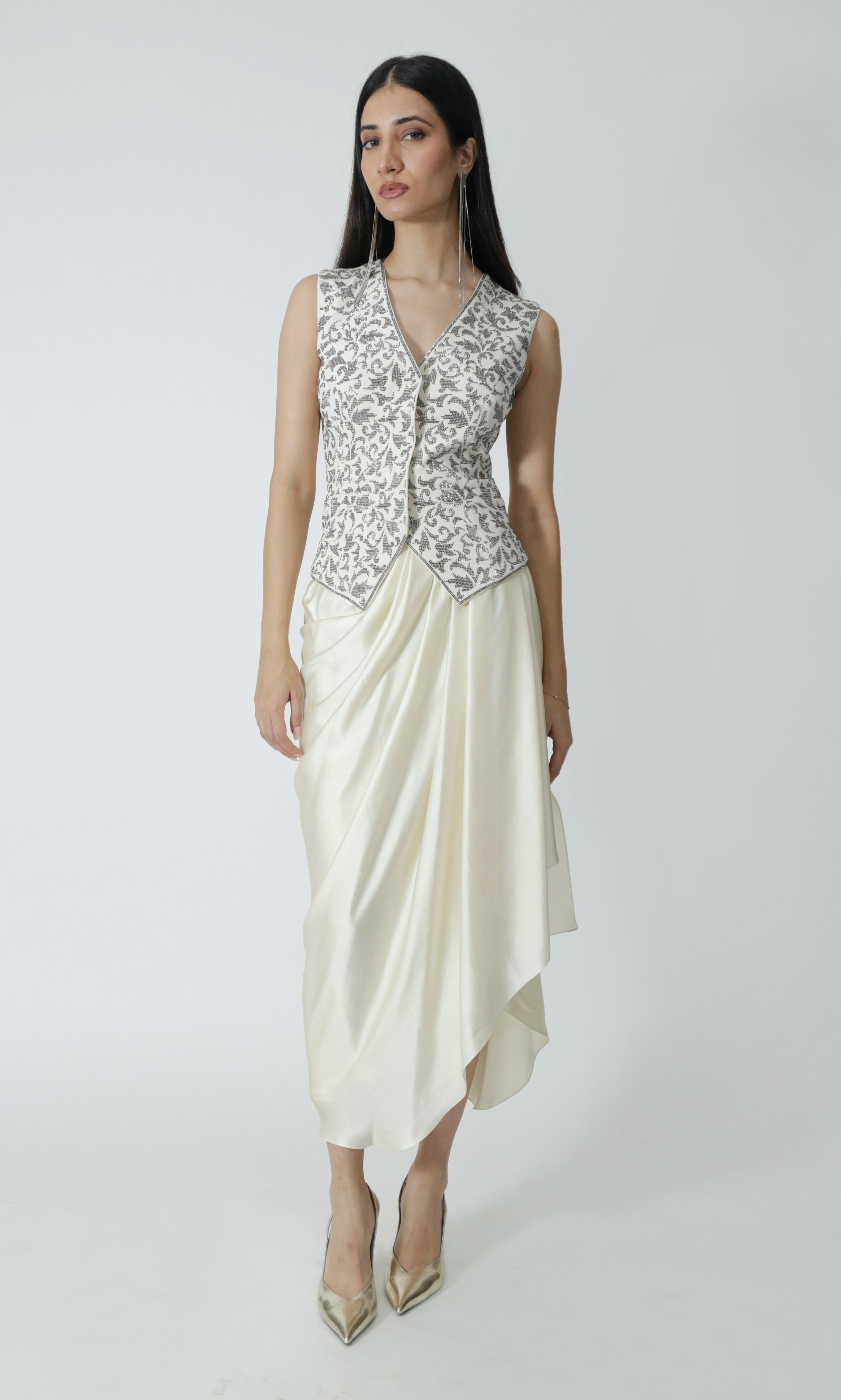 An Ivory heavy silk crepe waistcoat and silk satin skirt, adorned with shimmering rhinestones.