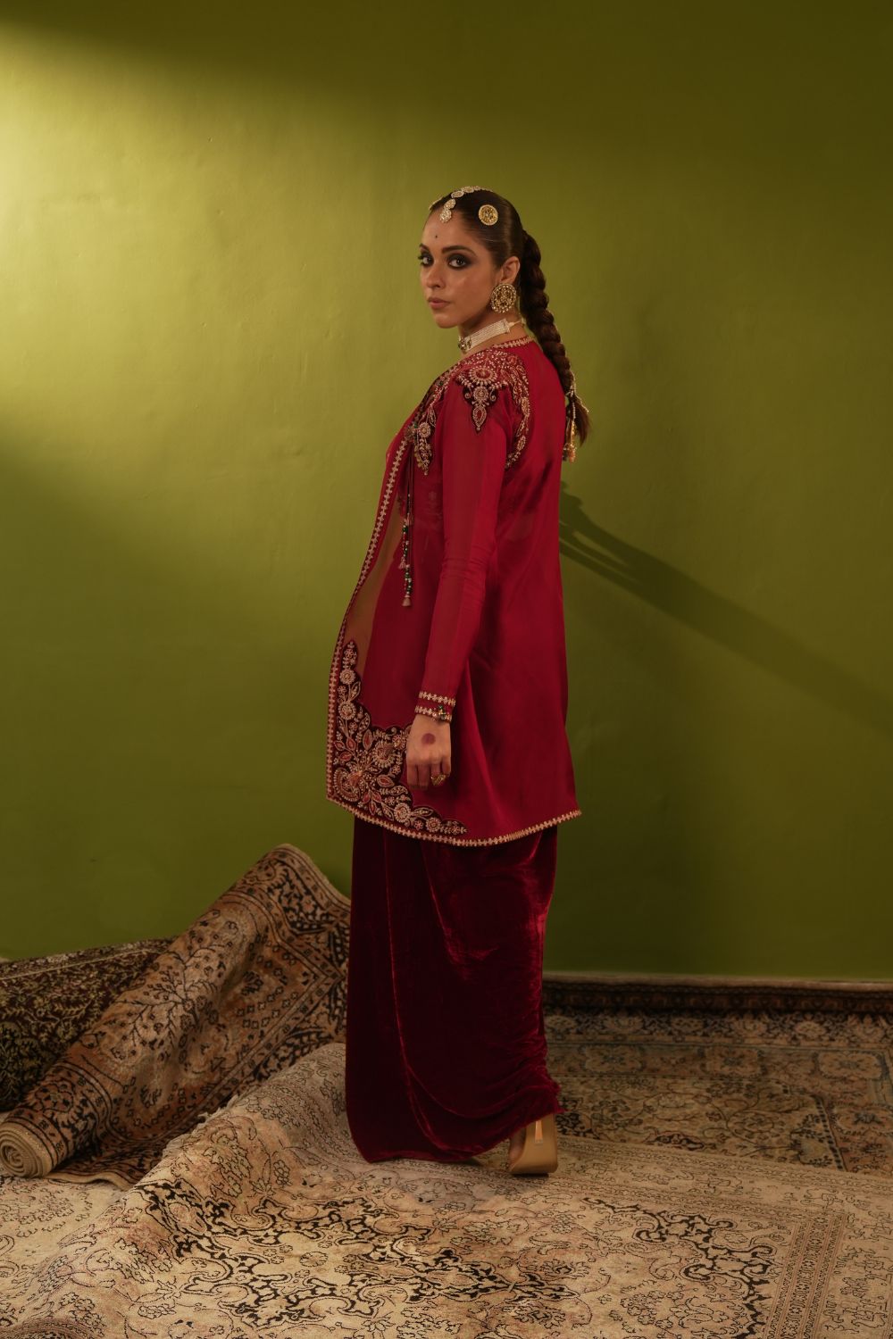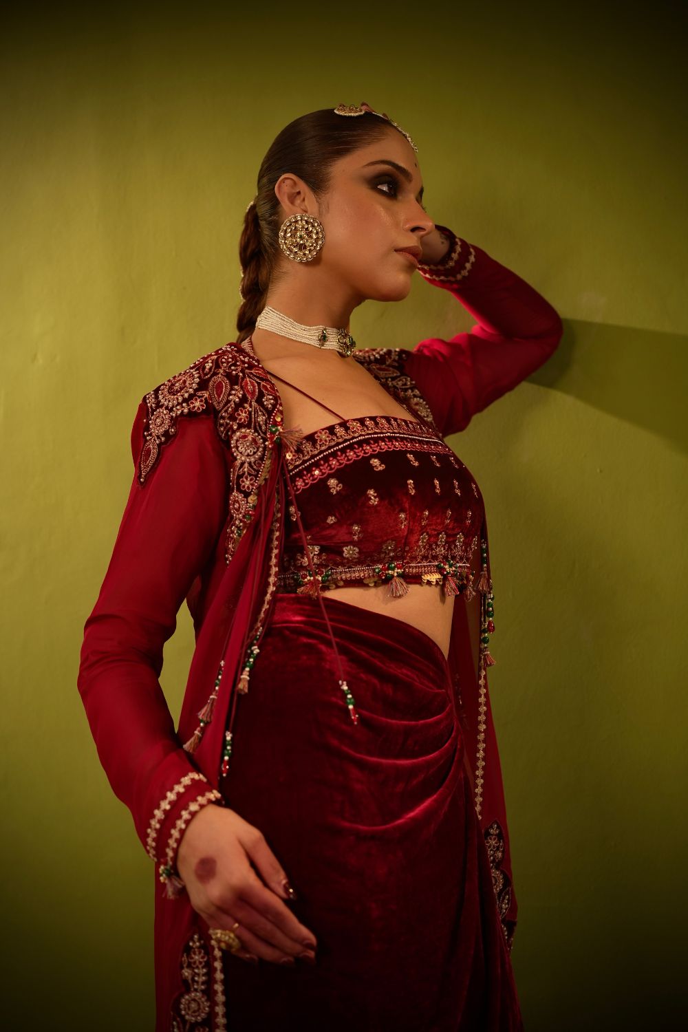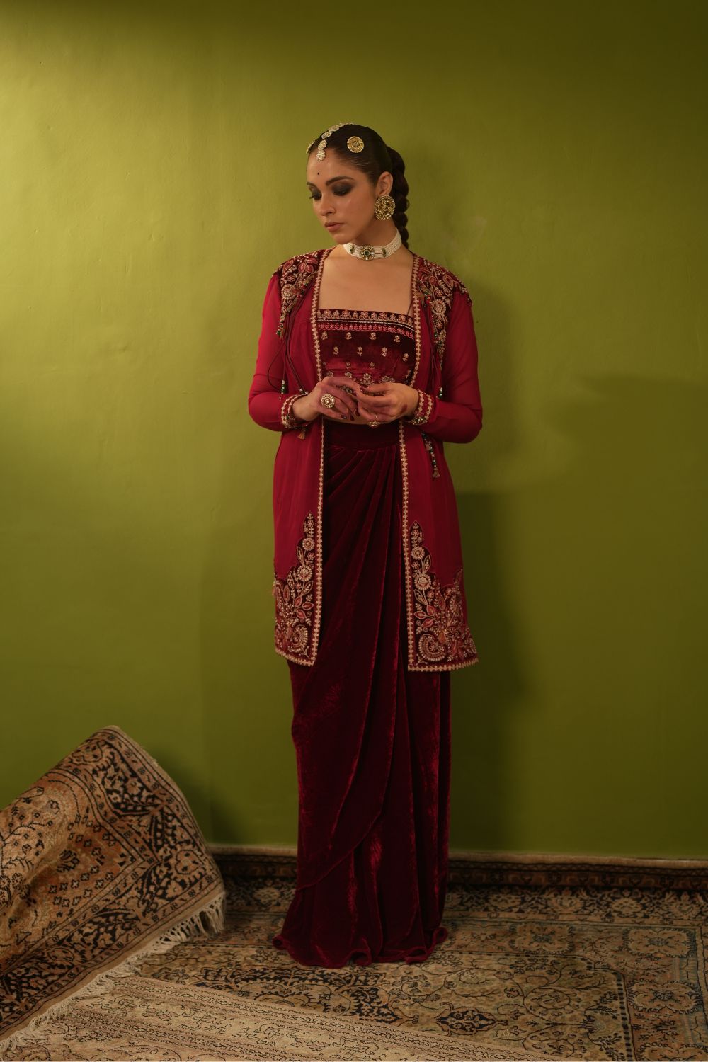 The long red georgette jacket set, paired with a draped velvet skirt and a tube top adorned with embroidery and fringes on the jacket, showcases a refined and contemporary aesthetic. The meticulous sequin, pearl, and zardozi handwork contribute intricate detailing, resulting in a luxurious and is a beautiful fusion of elegance and modern style. Inclusive of bag.