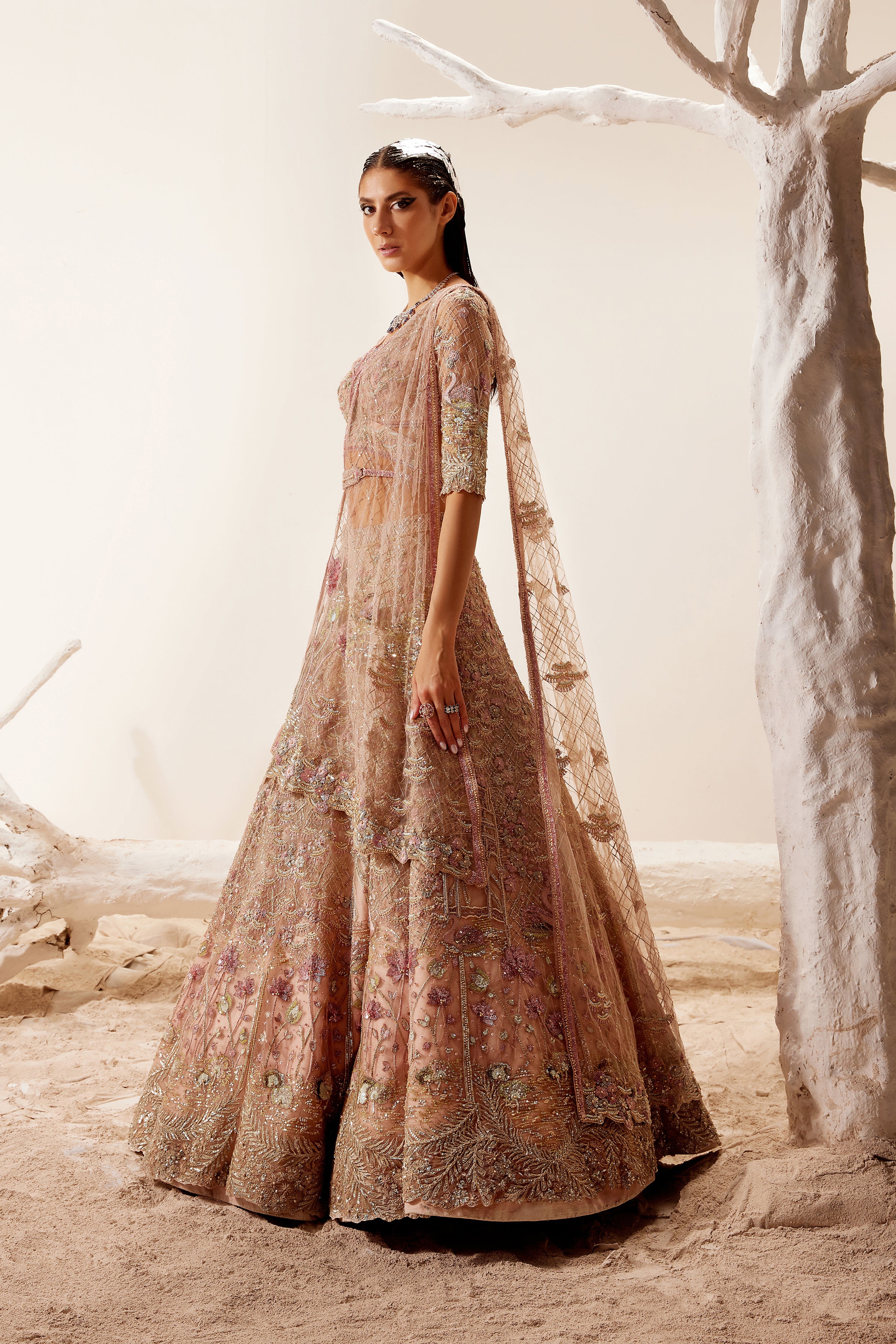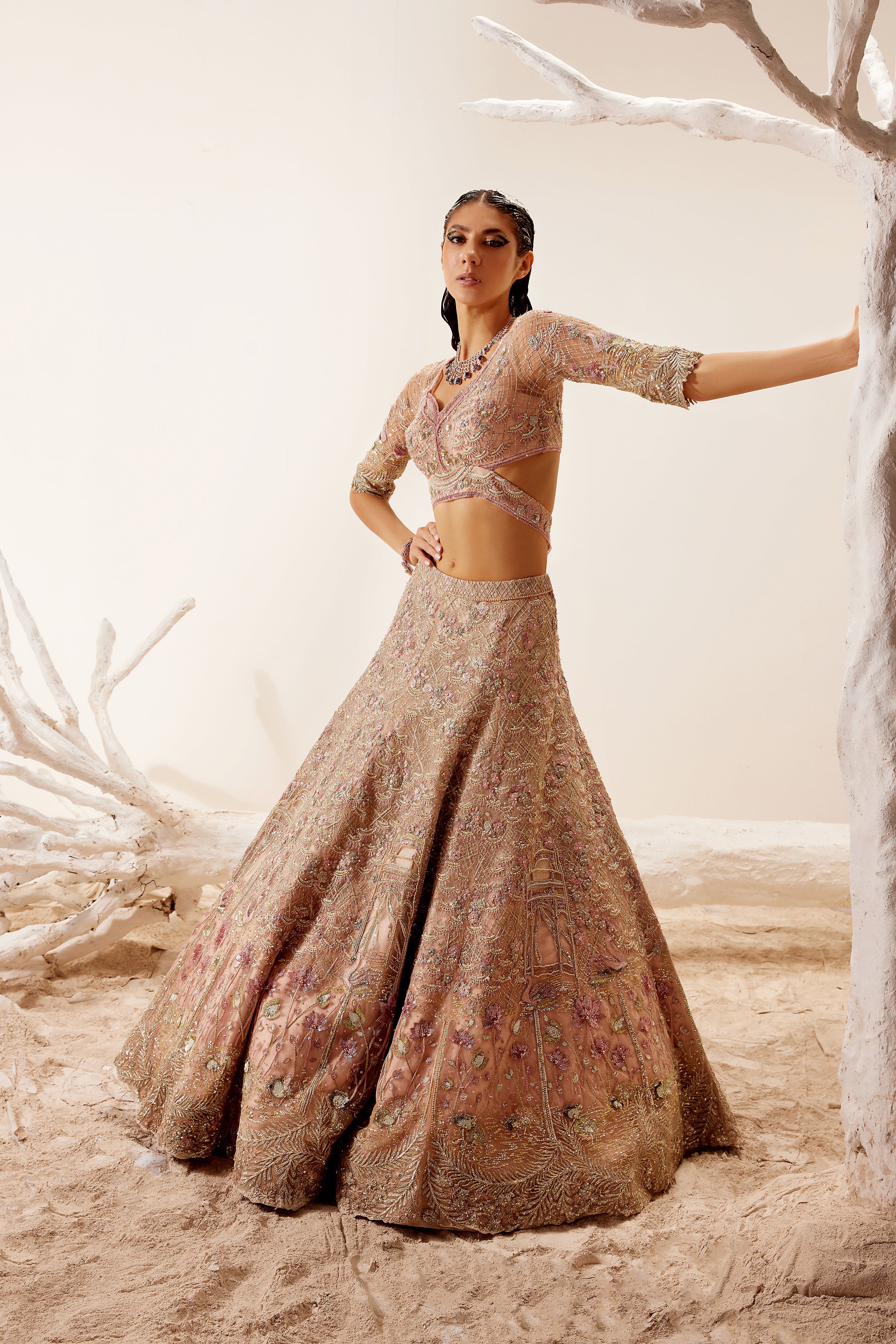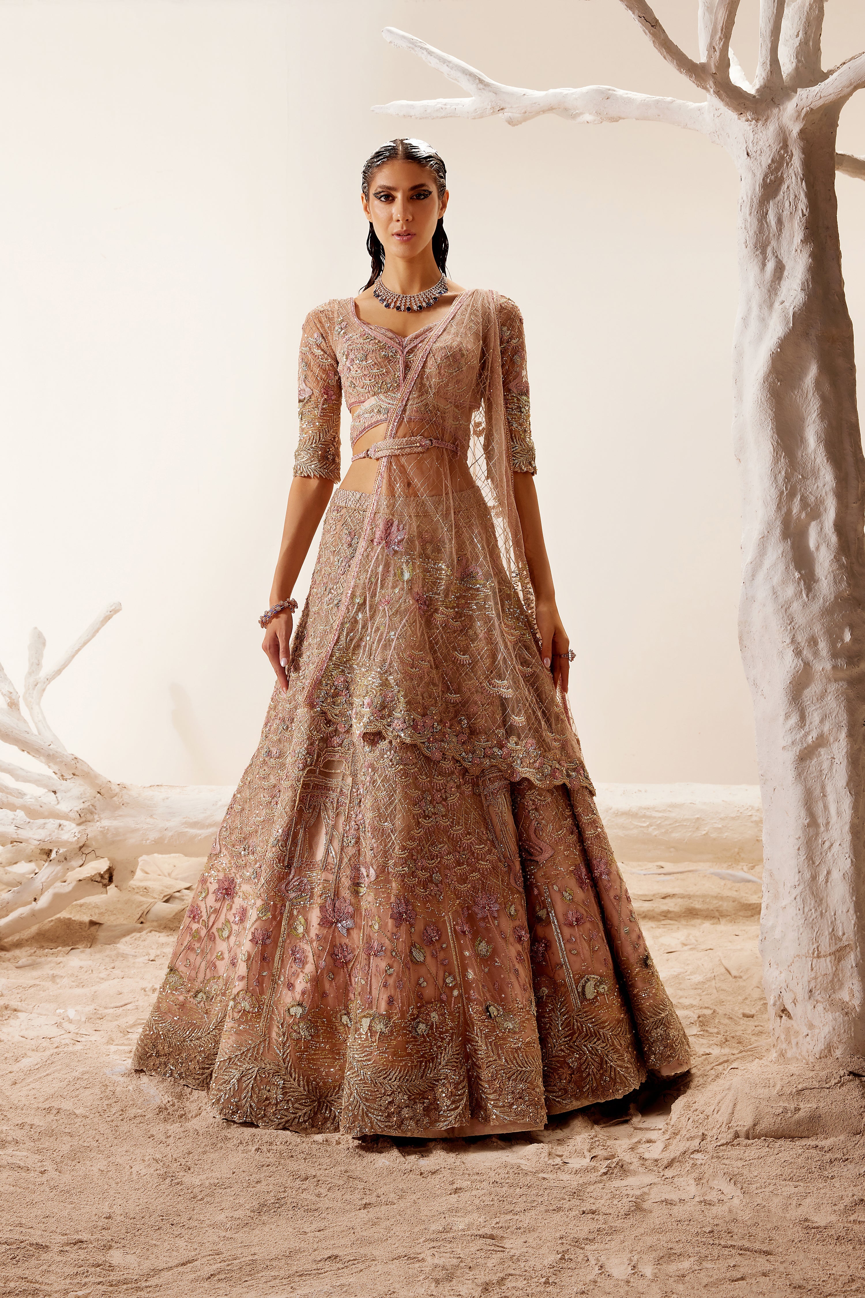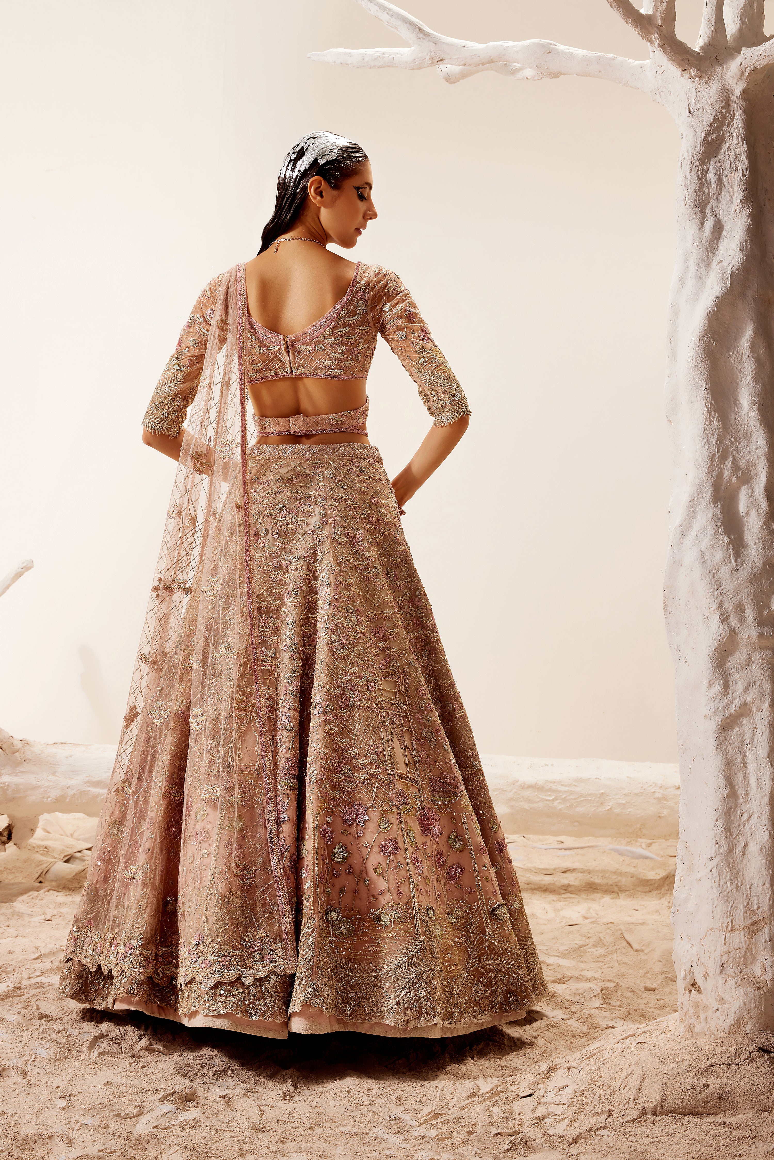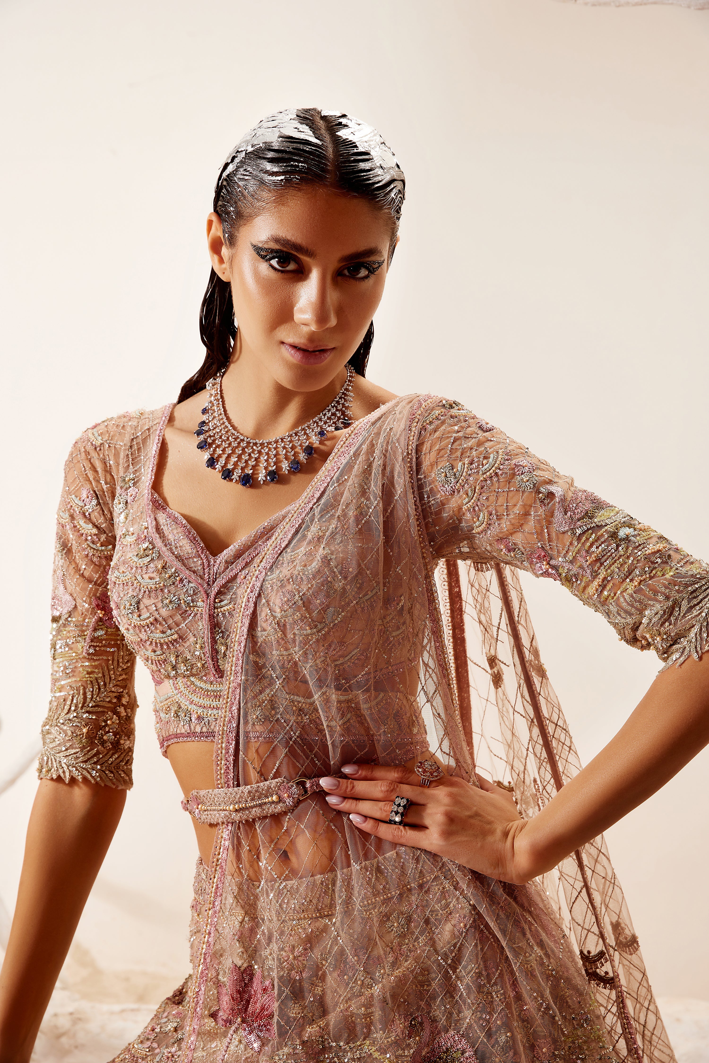Lotus lake embroidery lehenga with embellished blouse ,dupatta and belt.