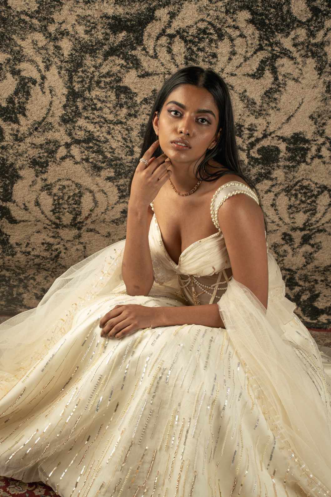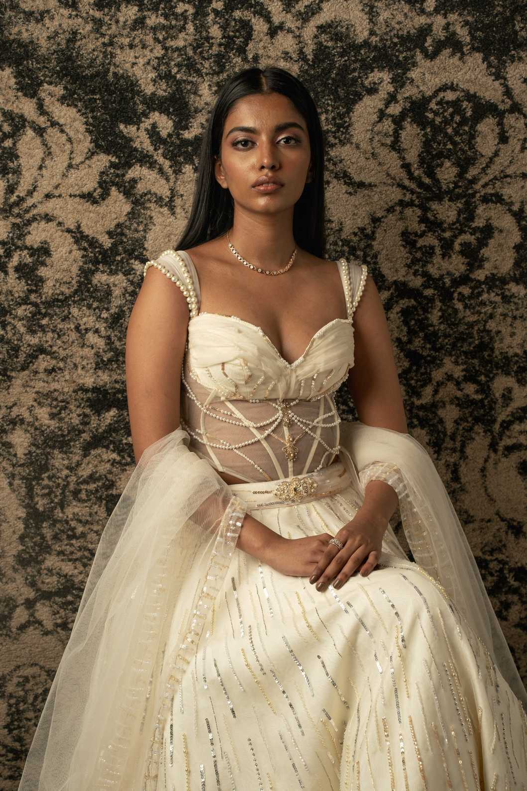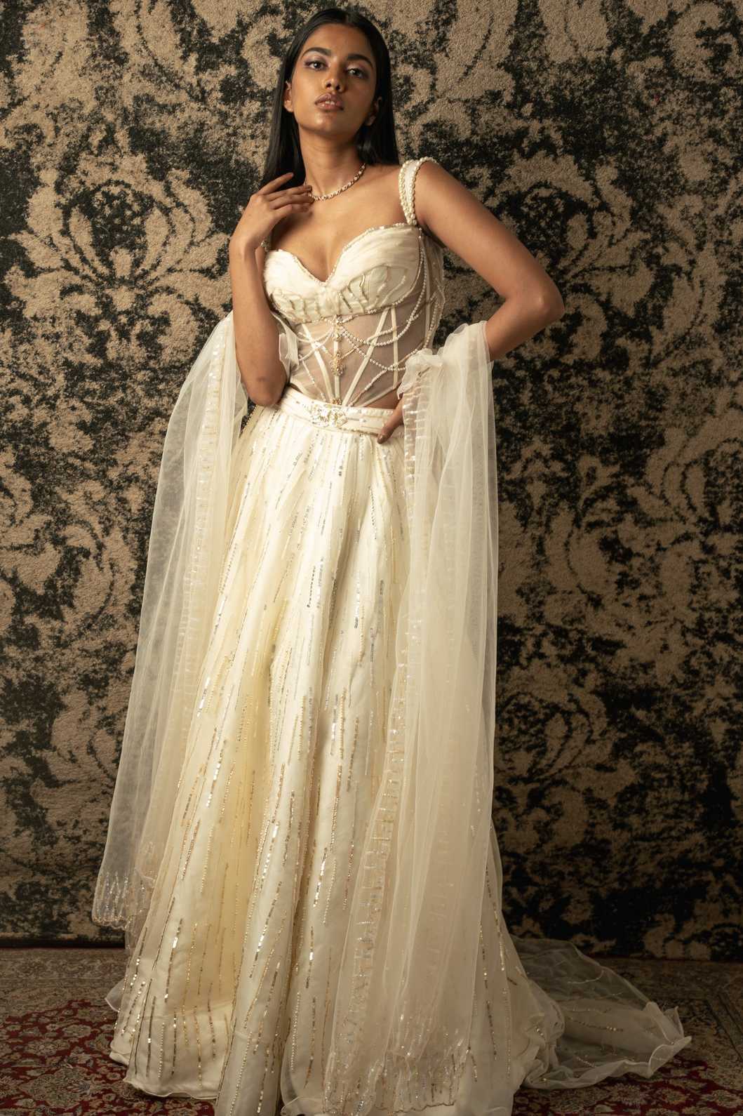 This exquisite lehenga set embodies sheer grace and sophistication. The skirt, crafted from silk organza with a luxurious Habutai silk lining, cascades elegantly, enhancing every movement with its ethereal charm. The blouse, delicately adorned with organza and net, adds a touch of subtle allure and shimmer to the ensemble. Completing the look is a graceful cape crafted from lightweight net fabric, enveloping the wearer in an aura of timeless elegance. Together, these elements form a stunning ensemble that epitomizes grace and refinement, perfect for any special occasion.