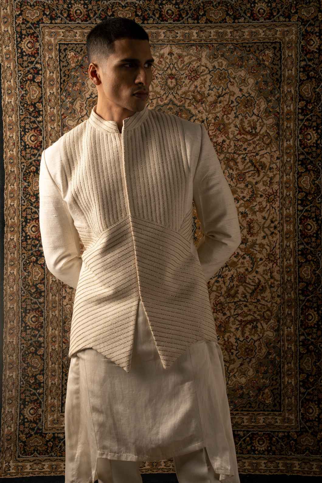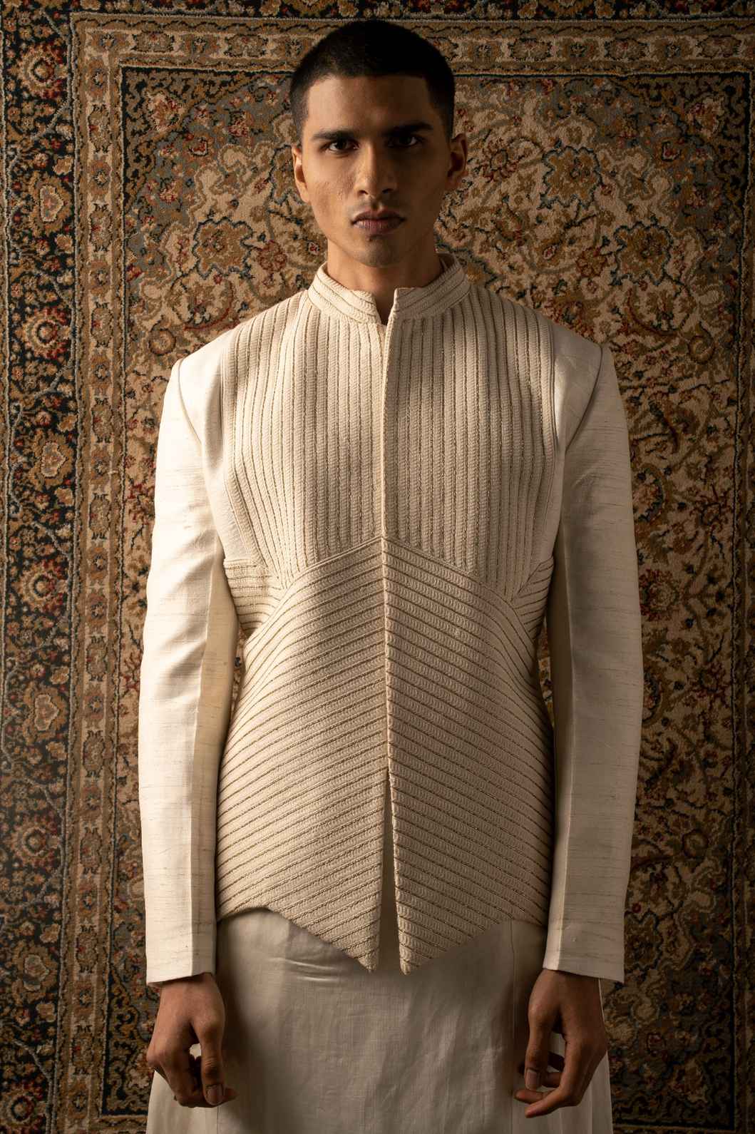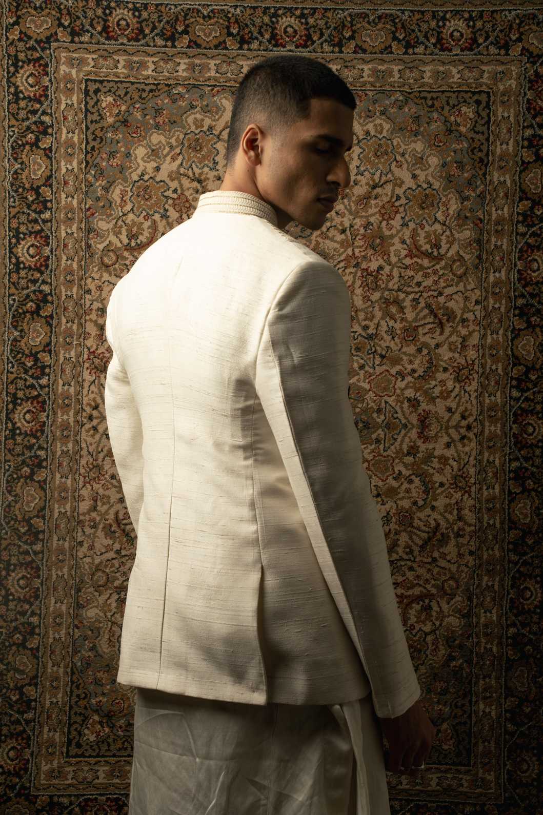 An ivory layered ensemble, crafted on raw silk, features intricate textured tonal embroidery, elevating any man's look to one of sharp sophistication, embodying the essence of a modern Indian gentleman.