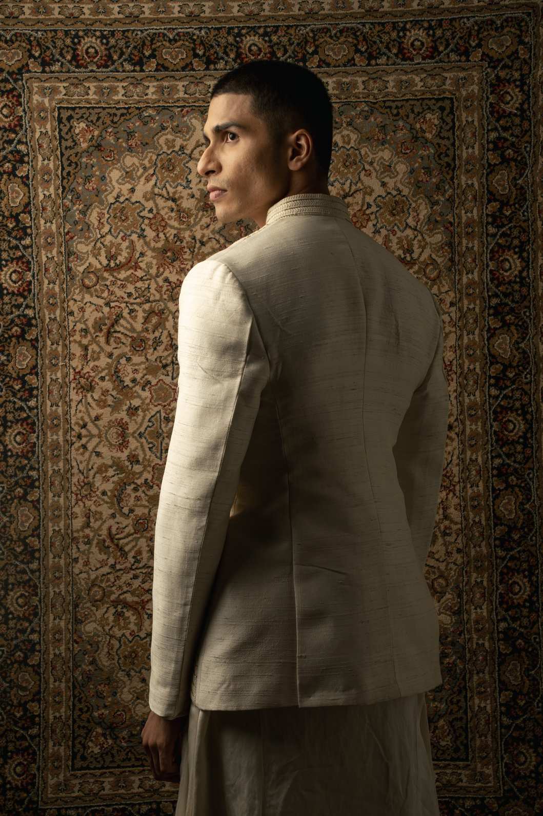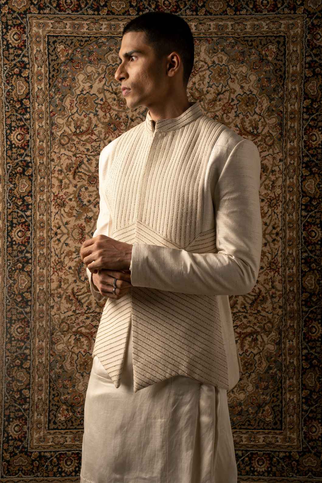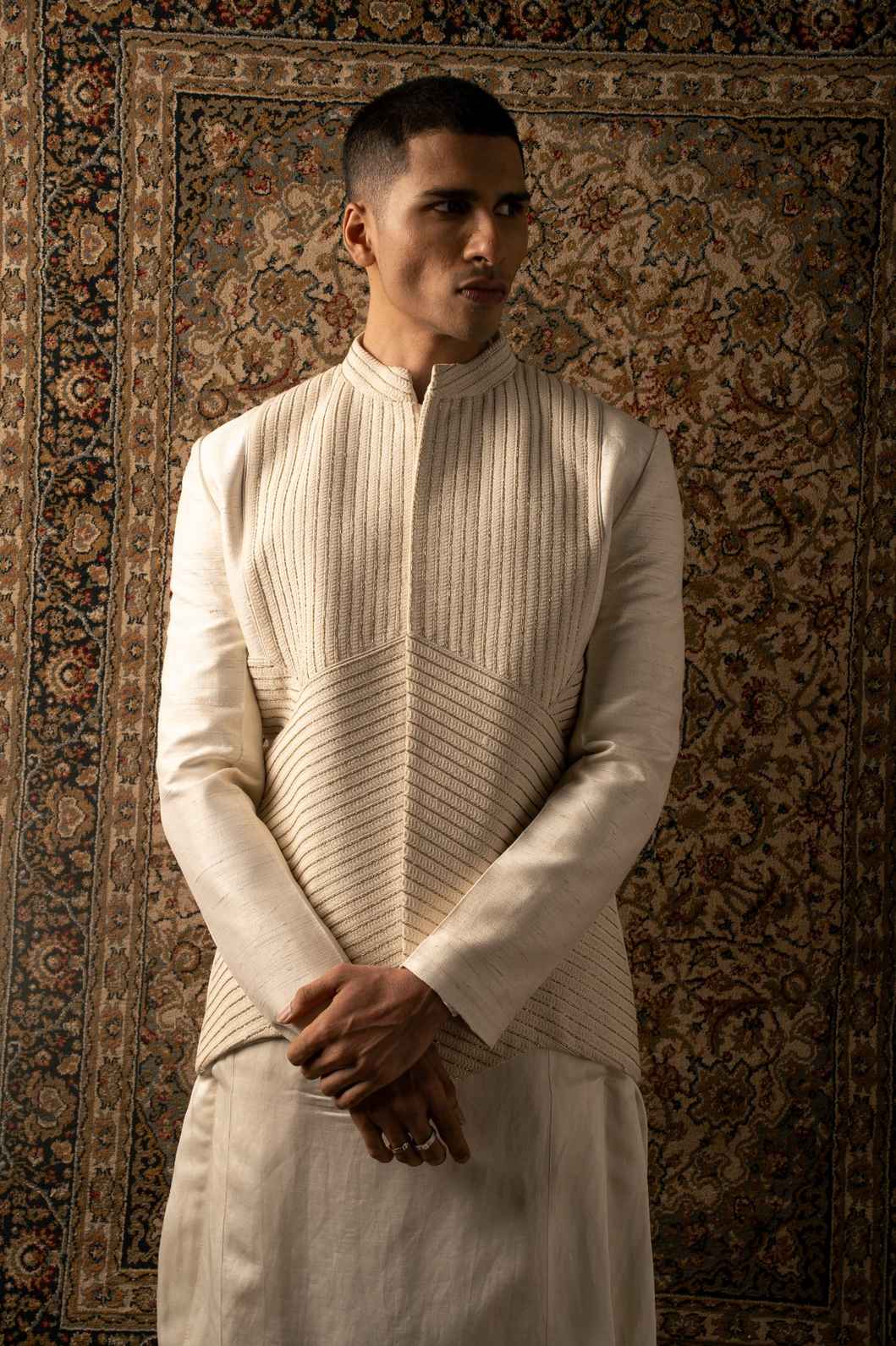 An ivory layered ensemble, crafted on raw silk, features intricate textured tonal embroidery, elevating any man's look to one of sharp sophistication, embodying the essence of a modern Indian gentleman.
