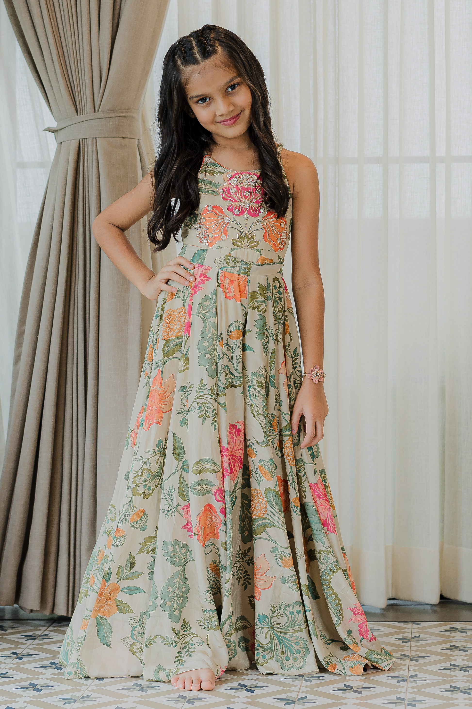 A signature floral printed jumpsuit, embellished with zardosi embroidery.