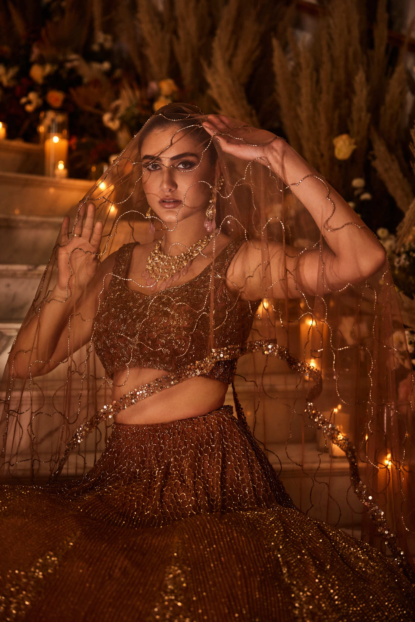Featuring a blue lehenga, meticulously hand-embroidered on tulle fabric with dabka, cutdana and sequin work detailing. Paired with a tulle dupatta with jal embroidery.