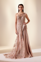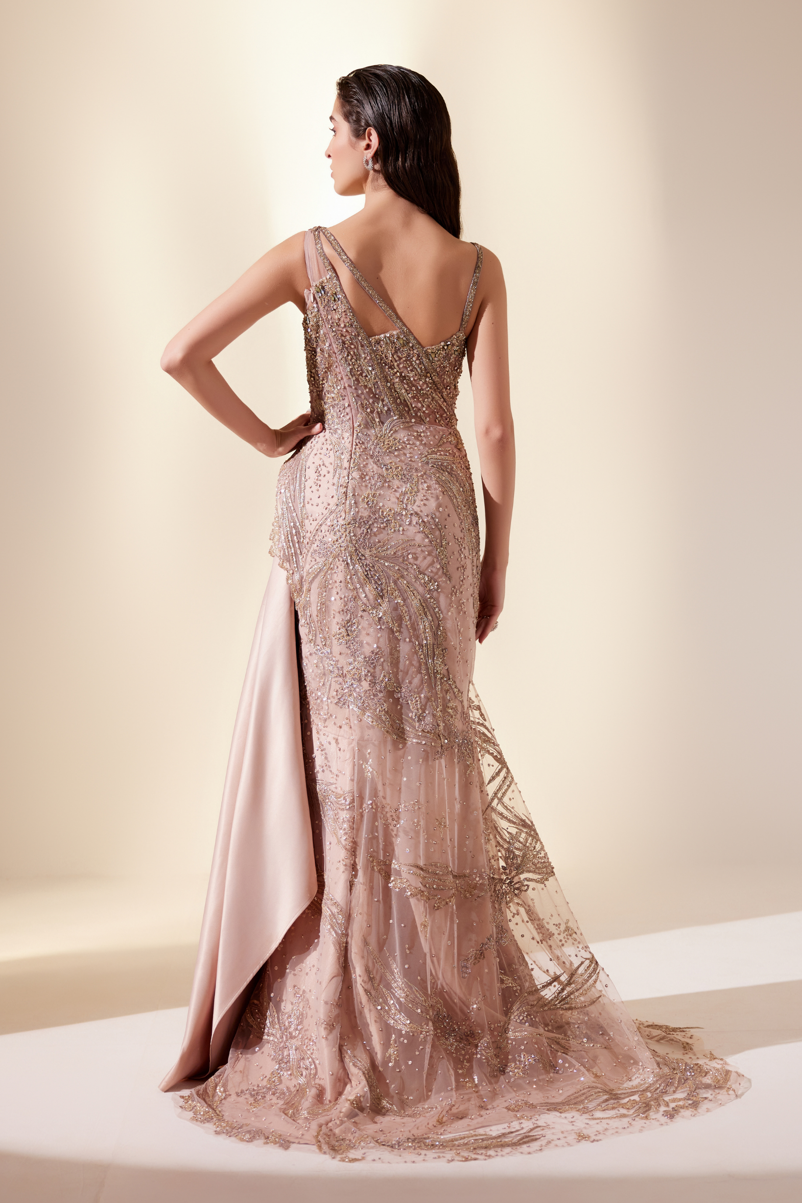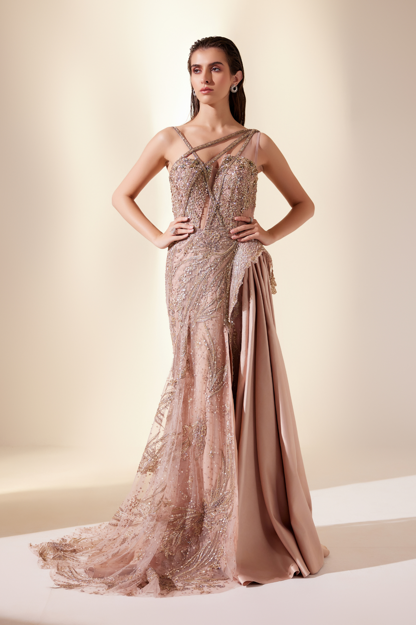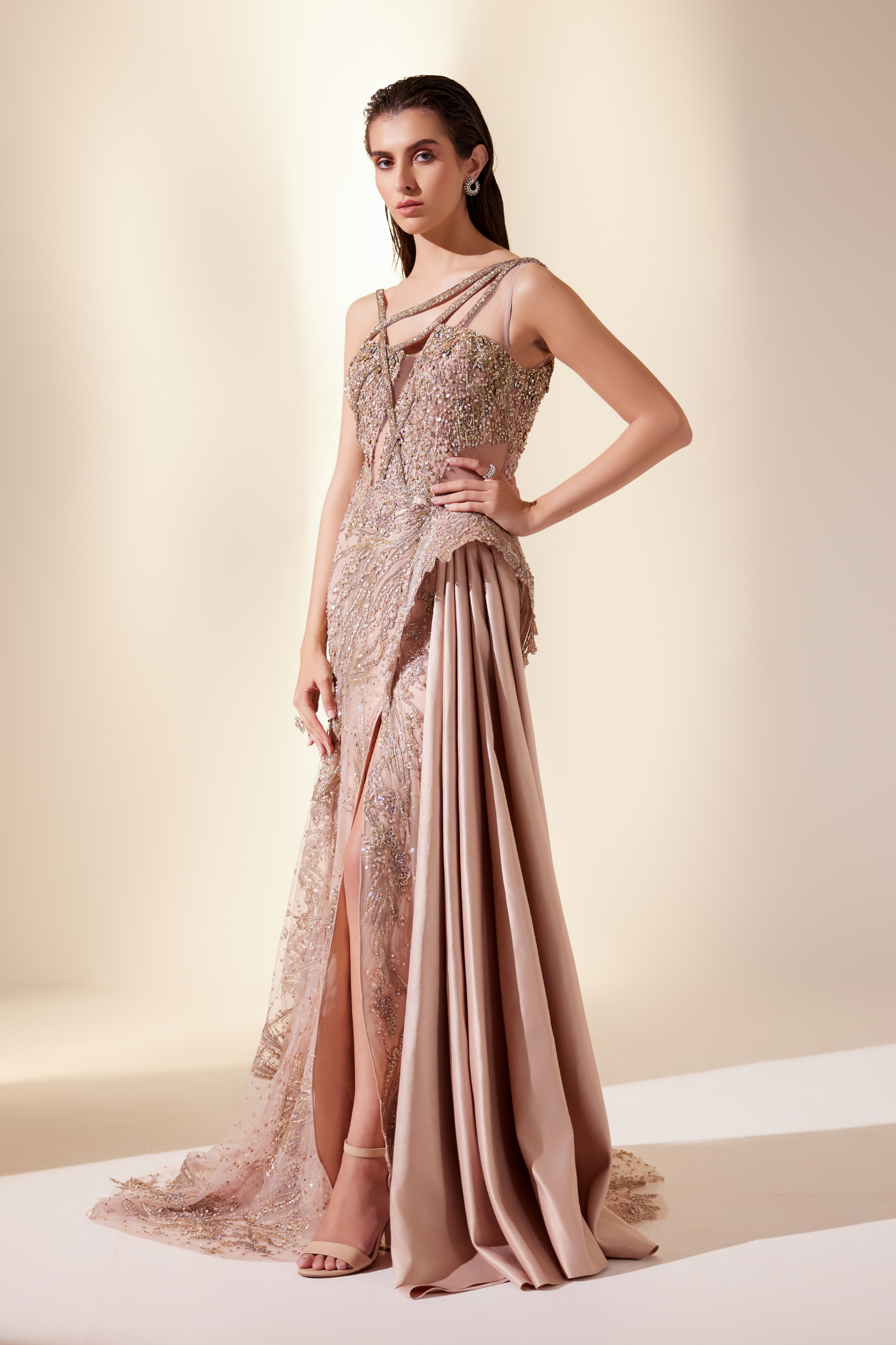 This gown exudes elegance and sophistication with its flattering body fit and enchanting flare.