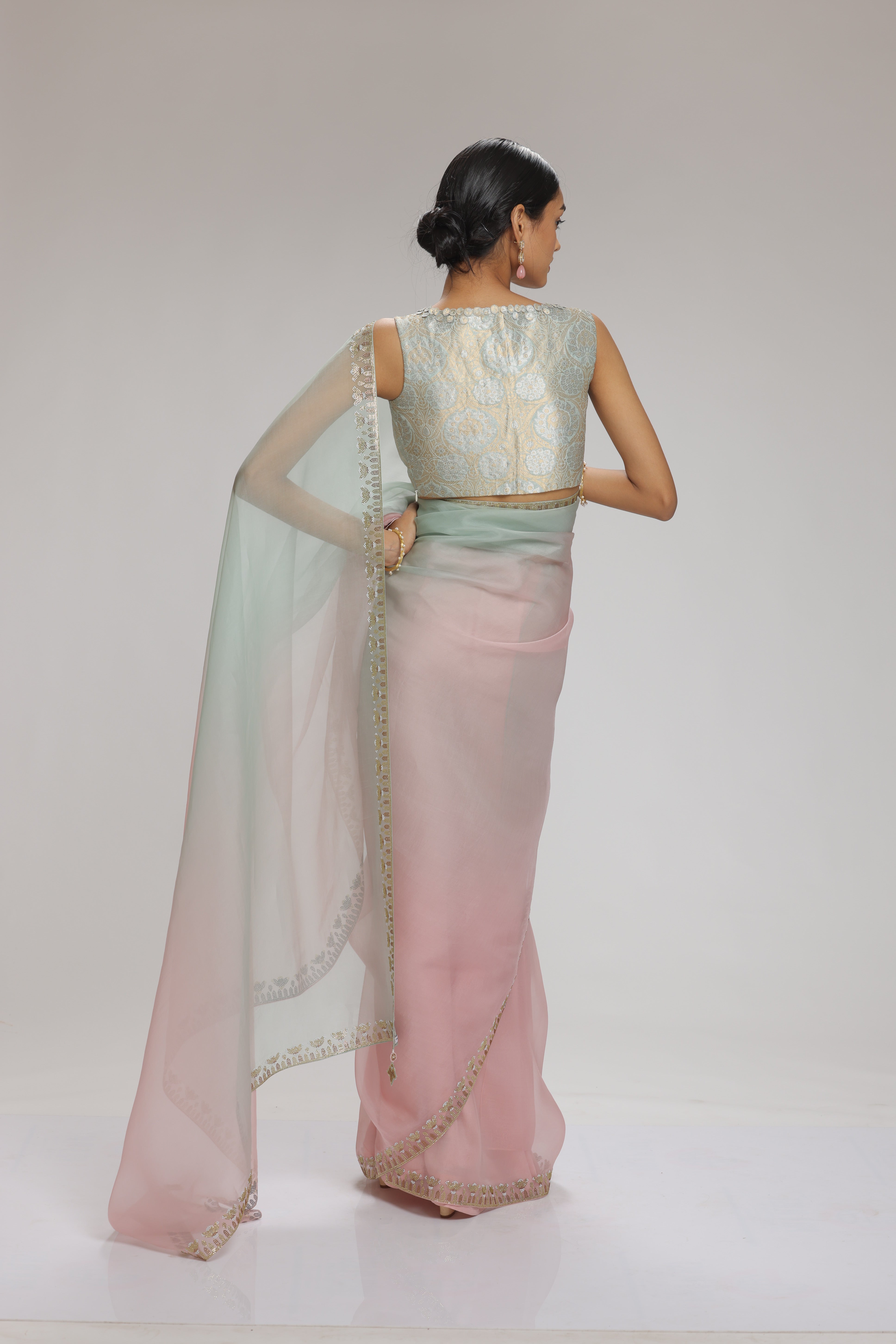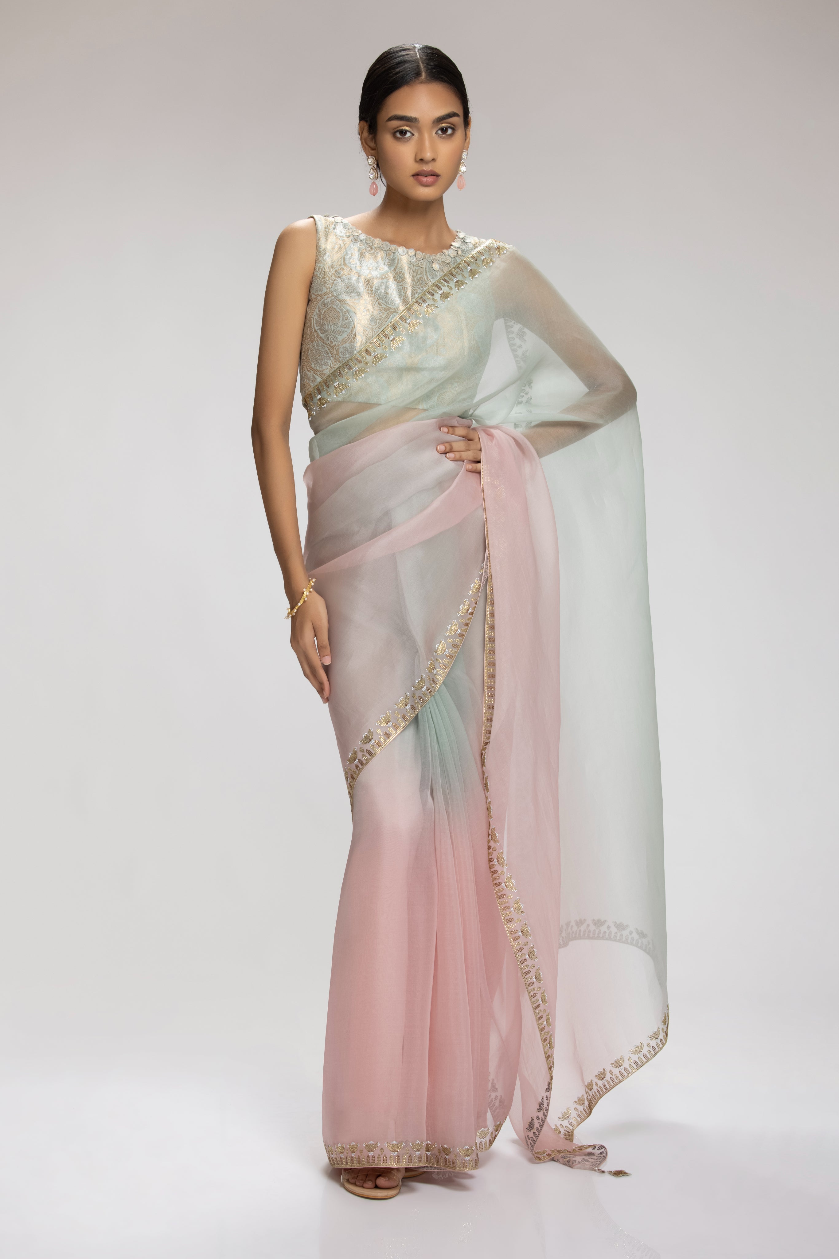 A pink and mint ombre organza saree, gracefully adorned with rhinestone accents along its hem. Perfectly harmonizing with this is a sleeveless banarasi brocade blouse, featuring delicate applique details on its neckline. This ensemble seamlessly blends textures and embellishments, creating a captivating and sophisticated look.