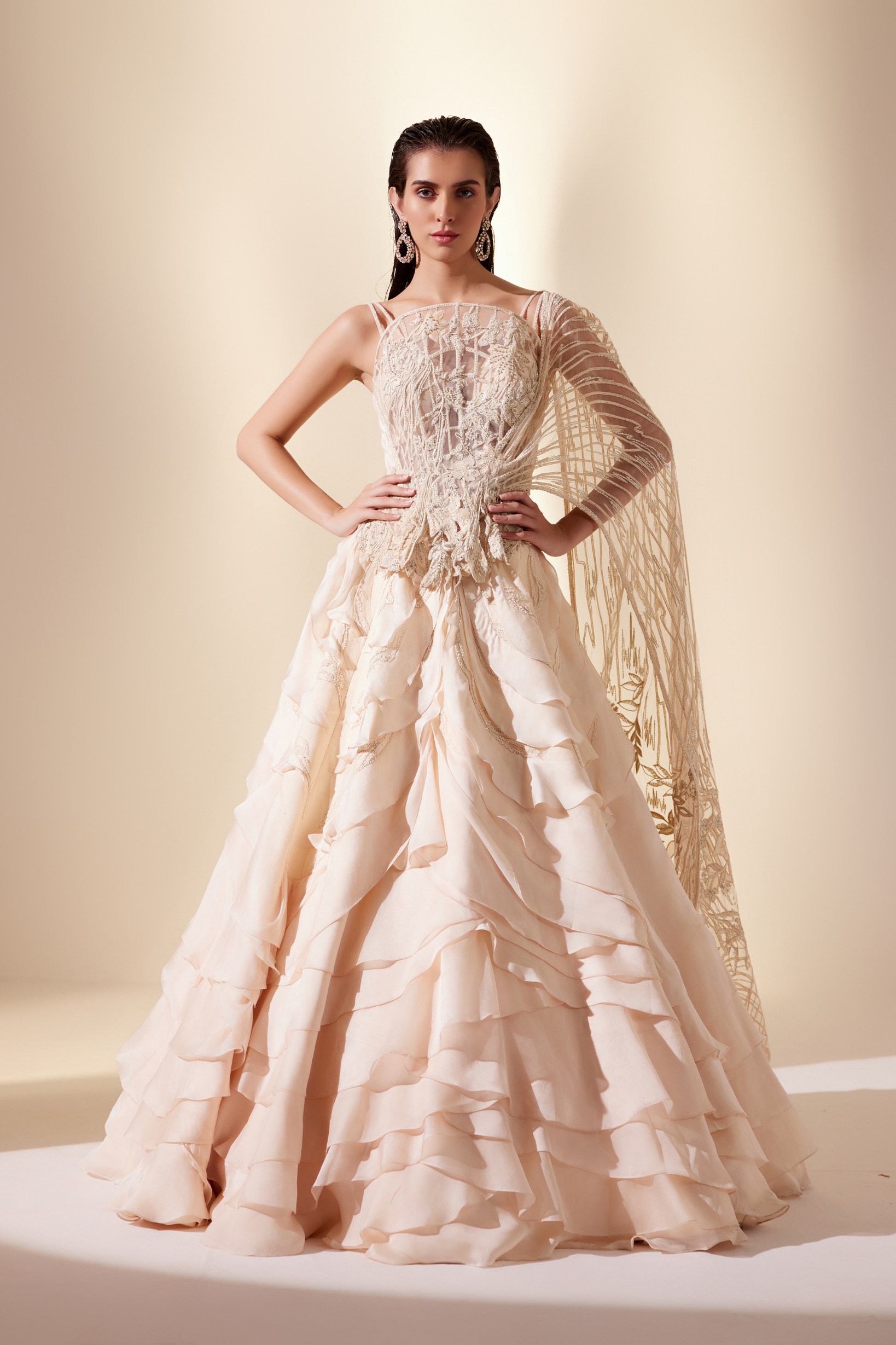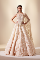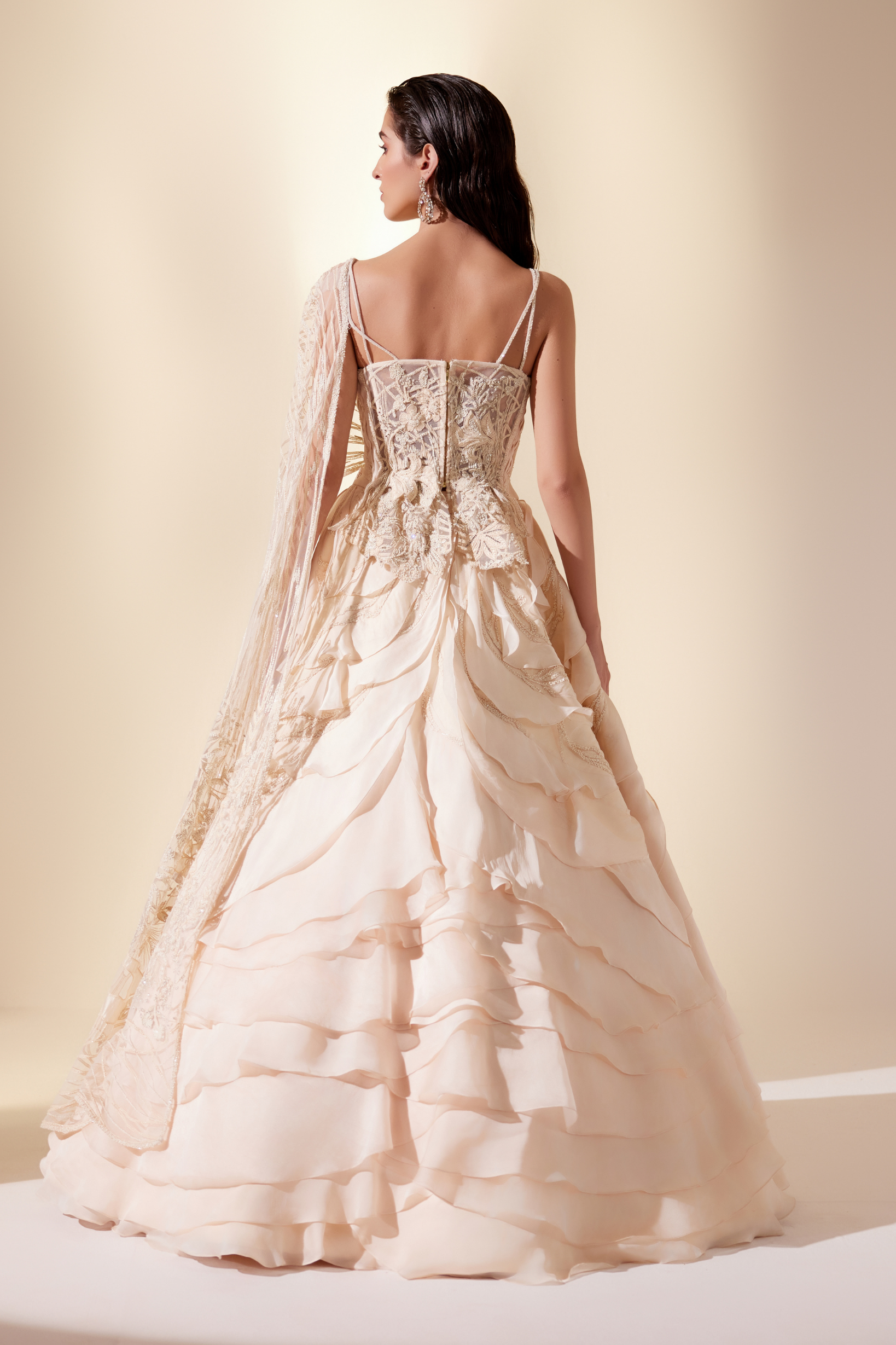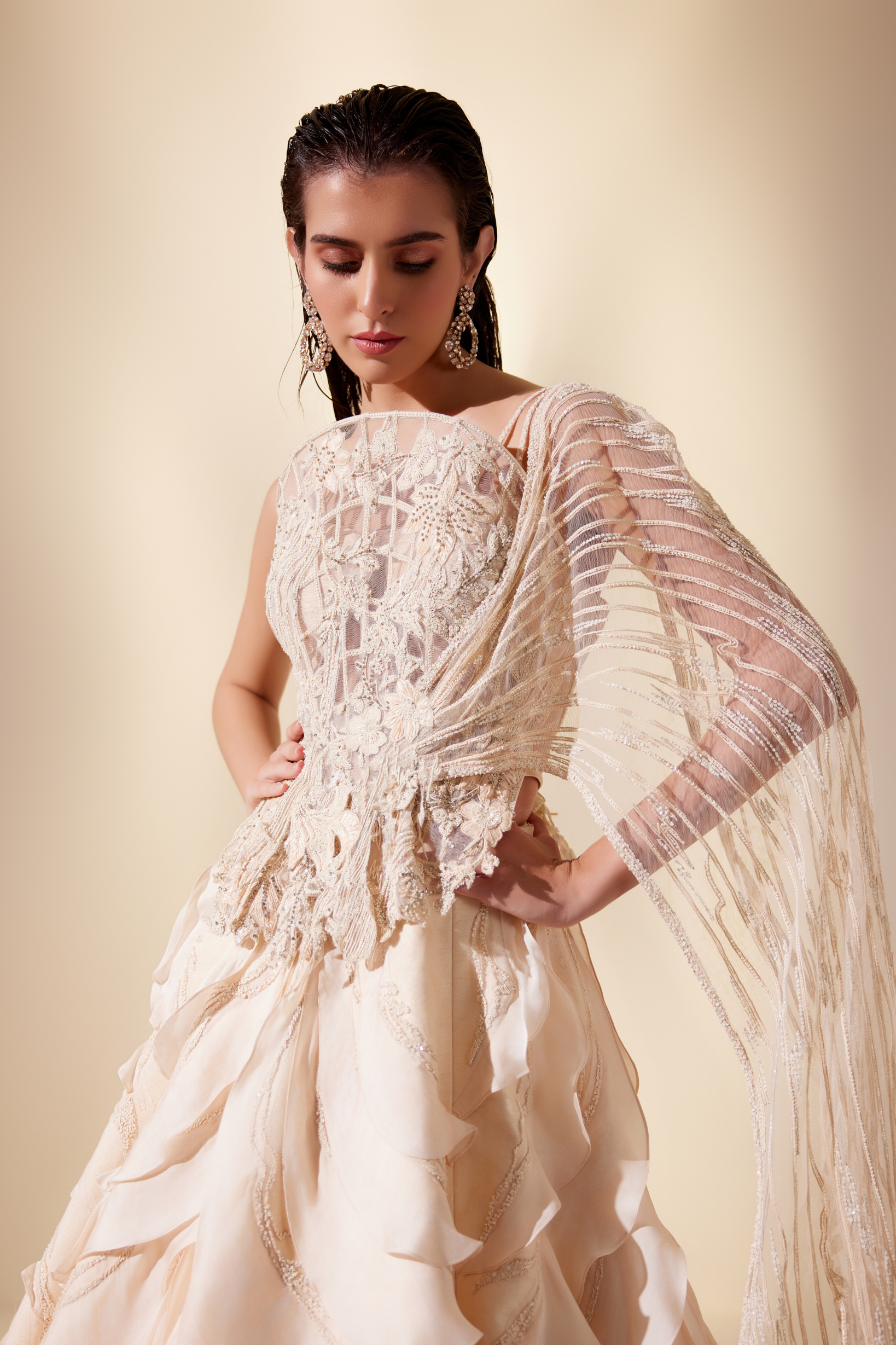This lehenga set features corset top with attached duppatta in a lustrous ivory fabric that gleams like the gentle radiance of moonlight.