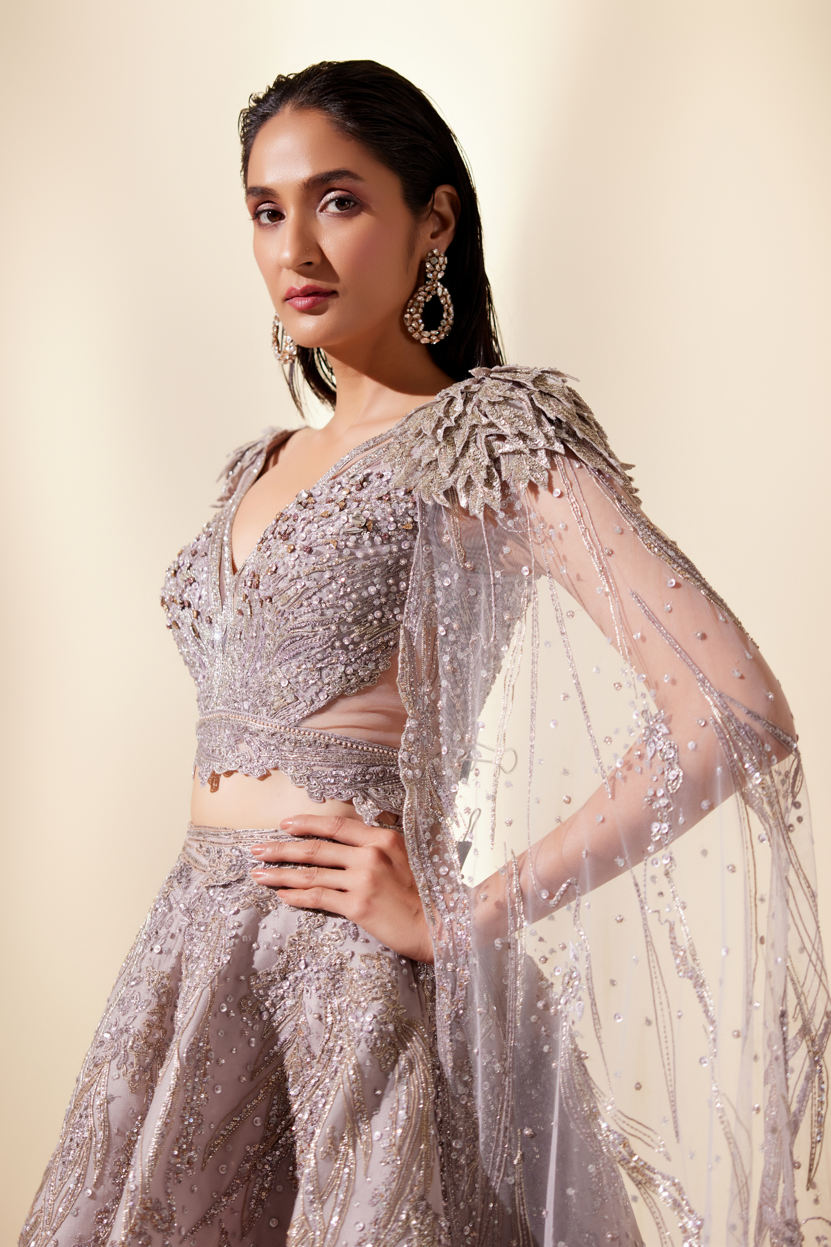Inspired by the shimmering glow of stardust, this set features a lehenga set with intricate embroidered details.