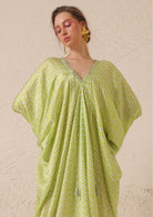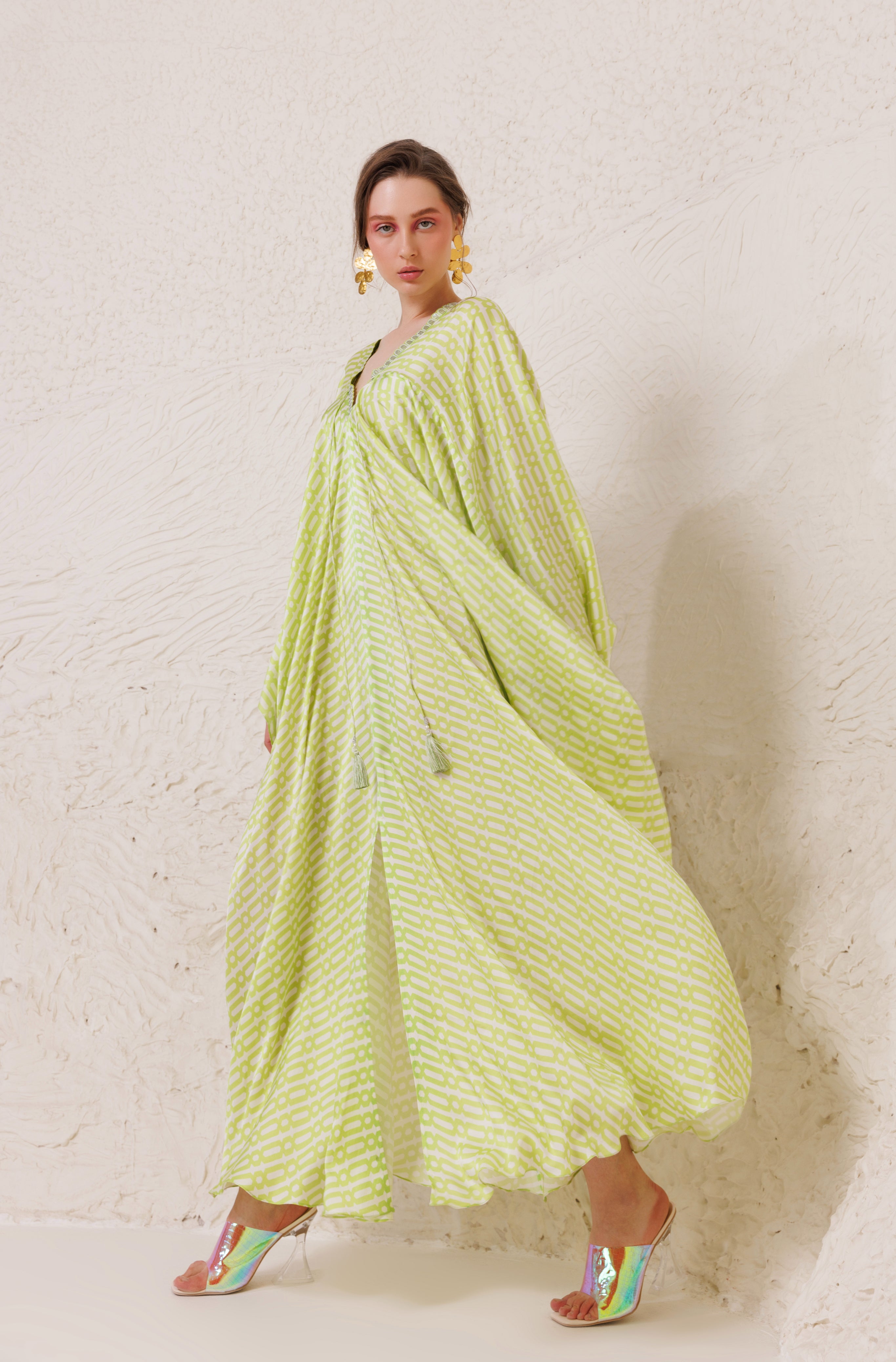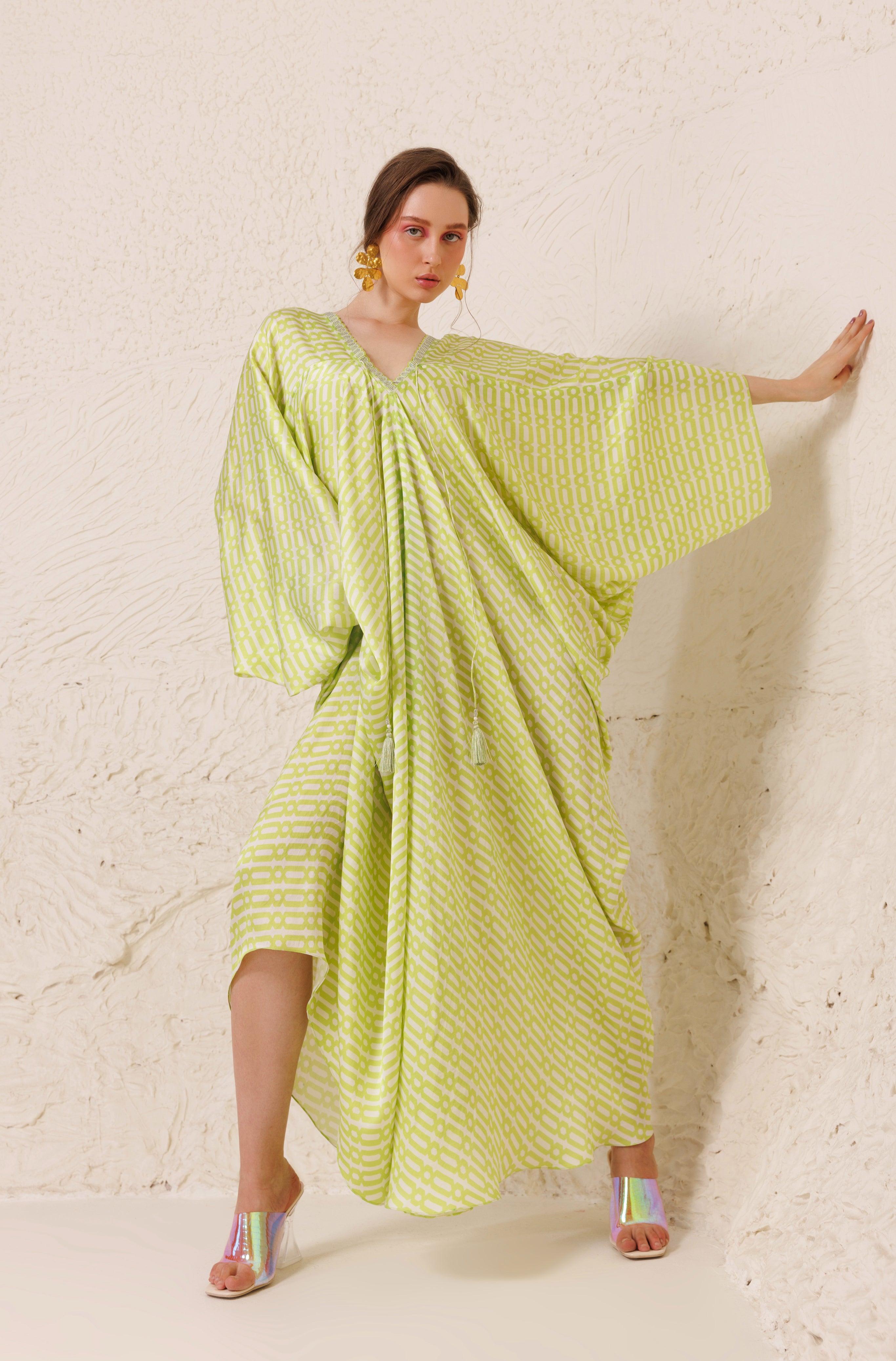 A lime green printed silk satin kaftan, featuring a geometrical pattern, and elevated by an embellished rhinestone neckline. This ensemble effortlessly combines vibrant aesthetics with subtle opulence, resulting in a captivating and sophisticated look that exudes modern elegance.