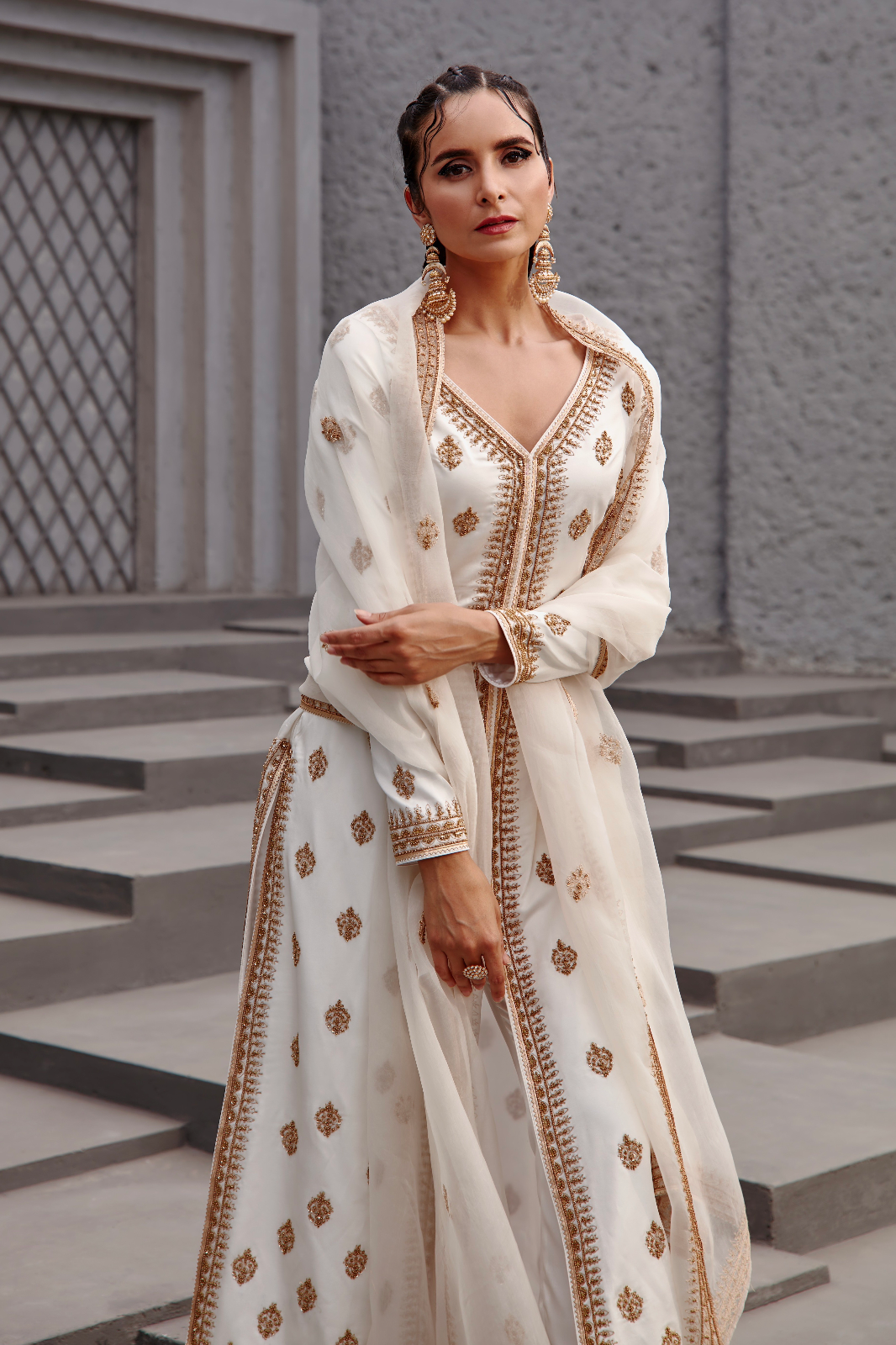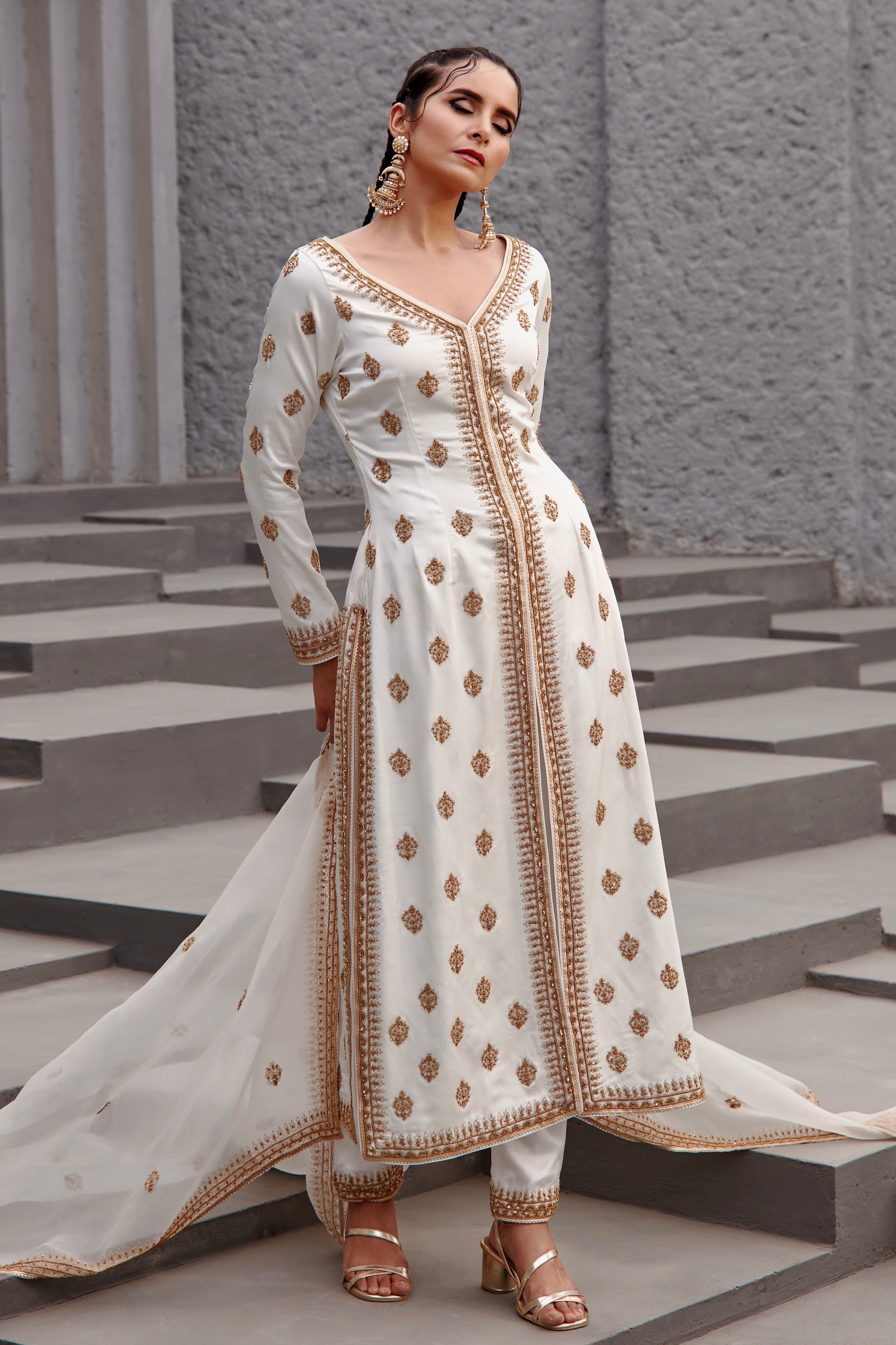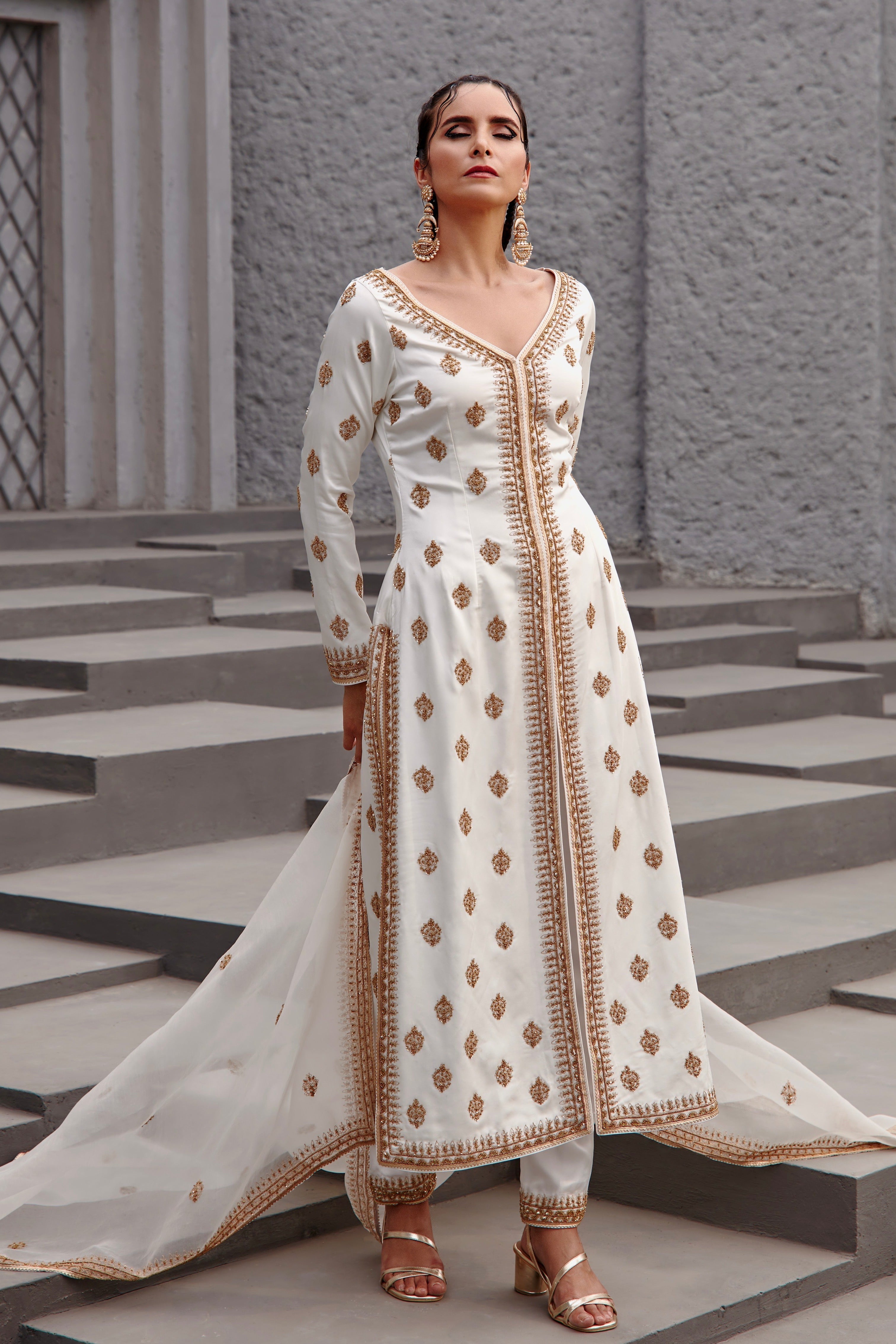 Featuring a pearl white dupian silk straight jacket pant set paired with an organza dupatta with gold dori and aari