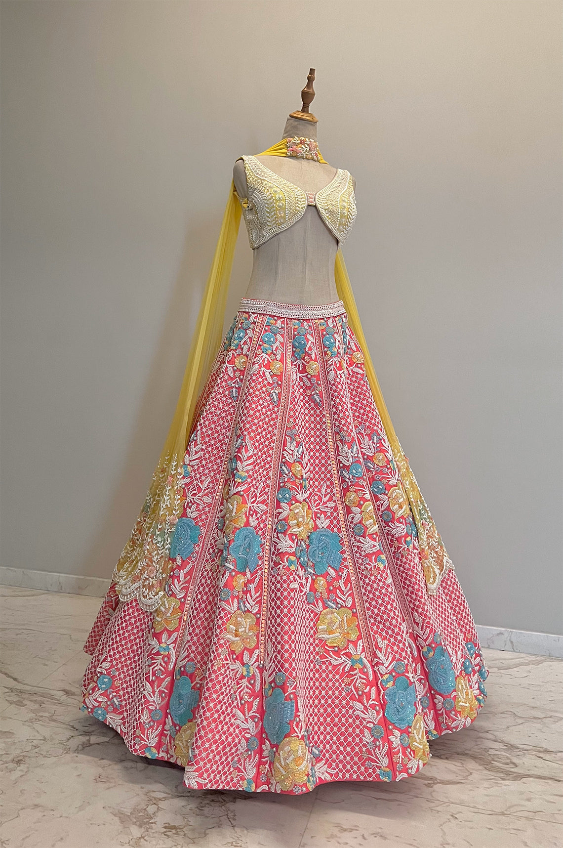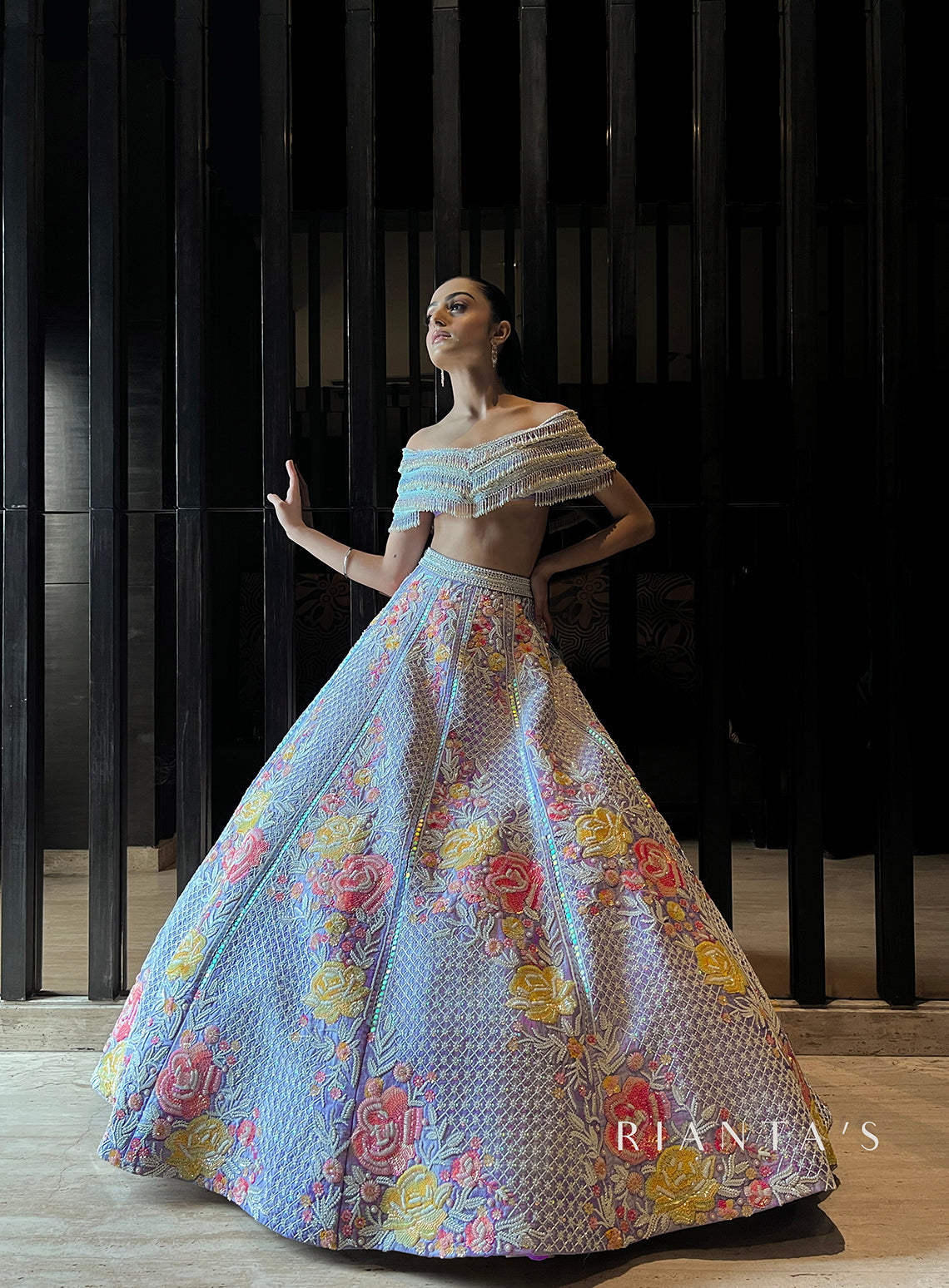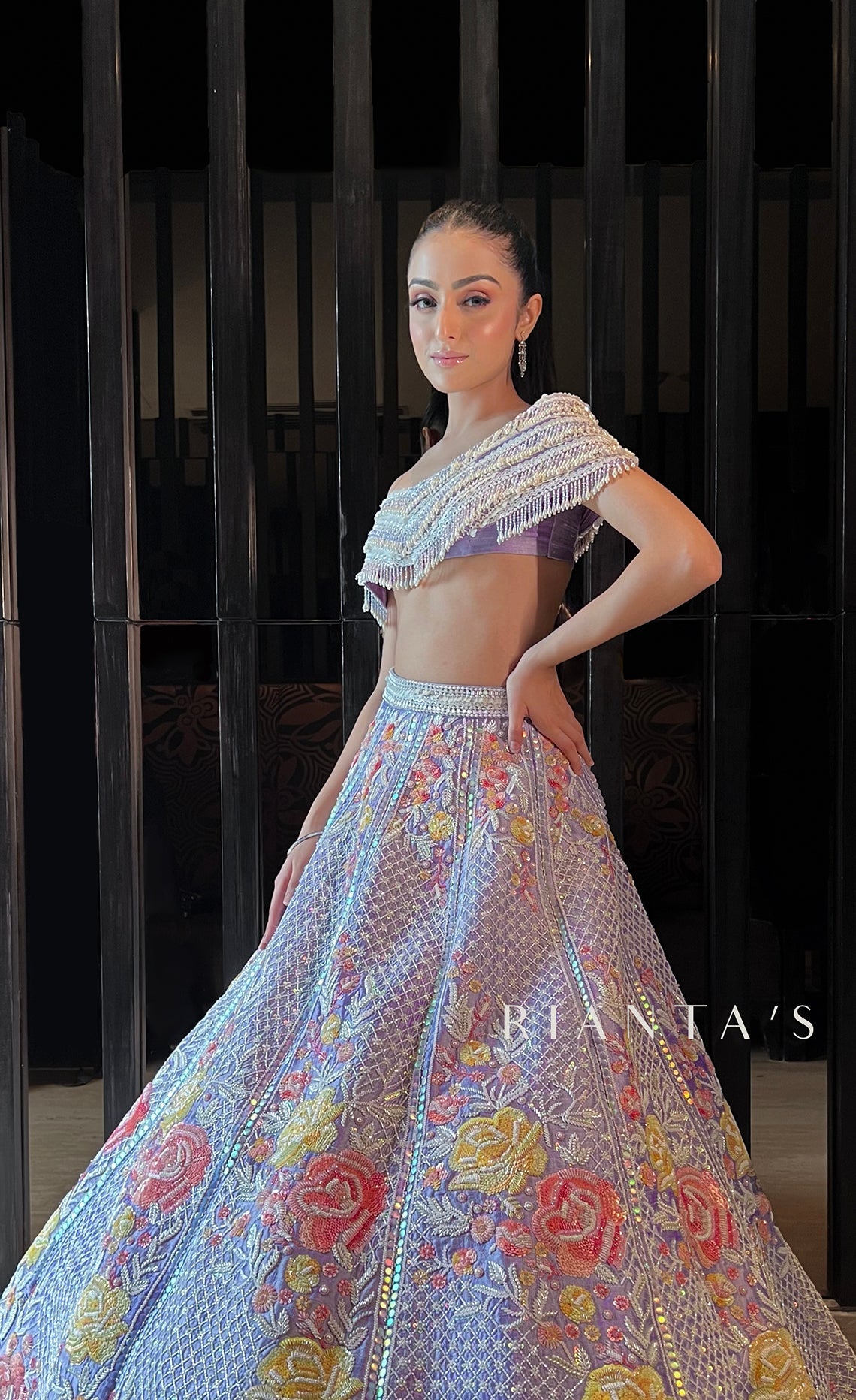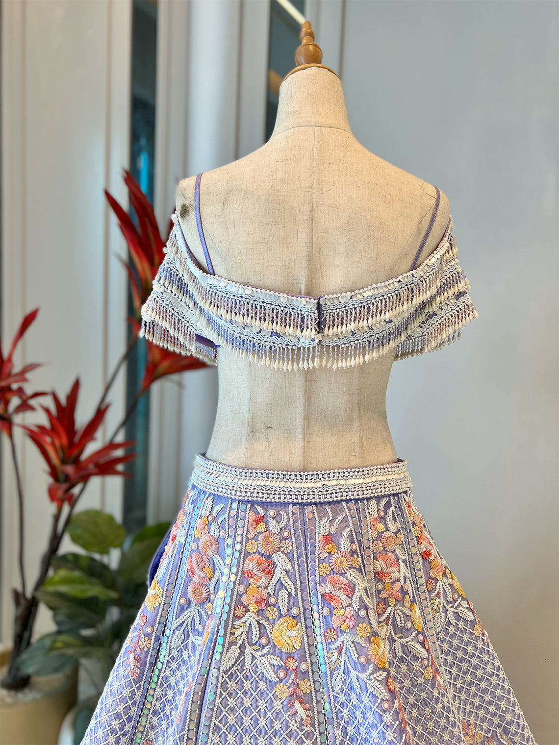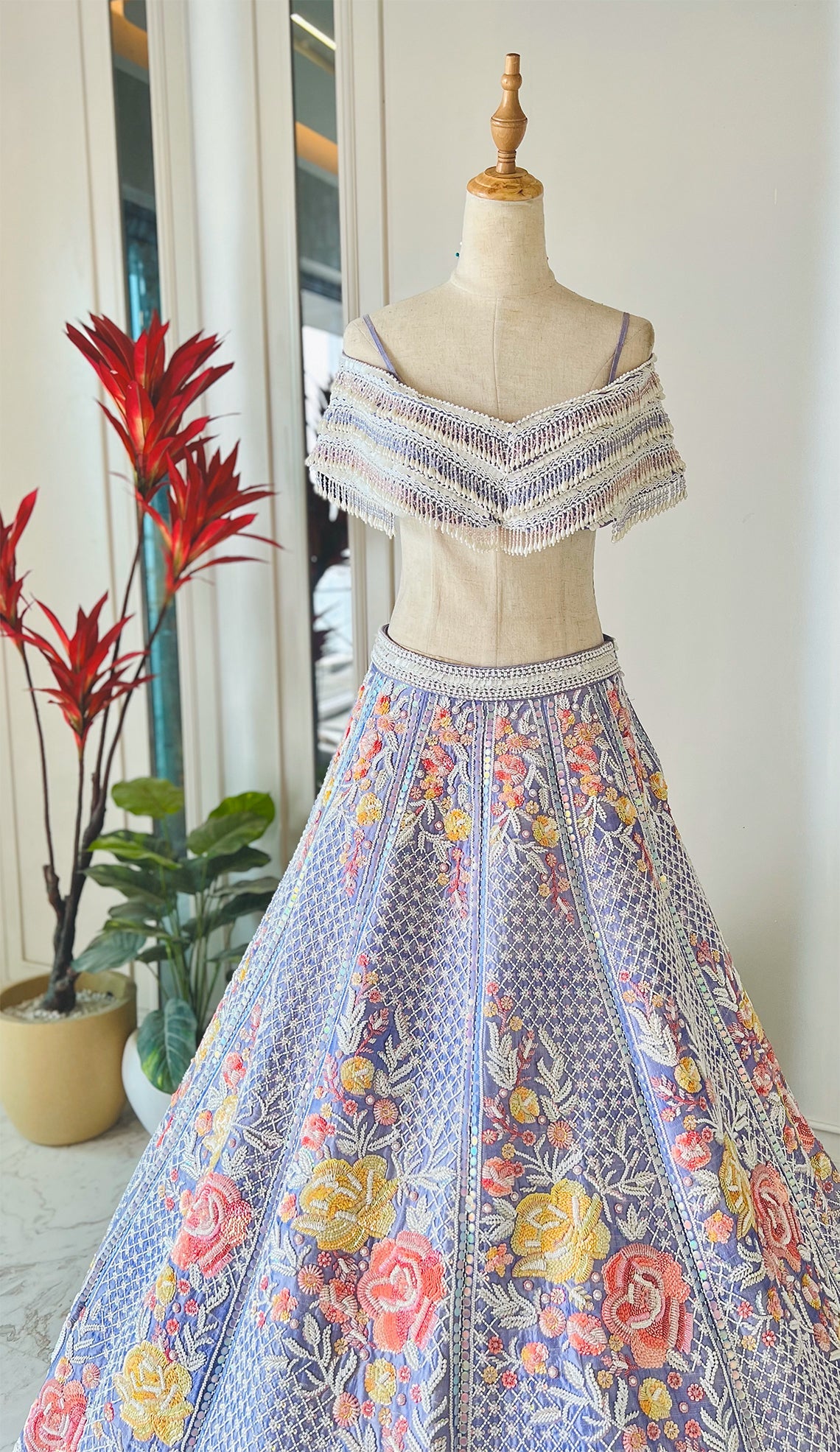 The Magnolia set is a embroidered raw silk lavender Lehenga set with Jali work and hand embroidered flowers enhance the overall look of the skirt. The top is a off shoulder top with Tassels. It comes with a yellow dupatta with minimal embroidery.