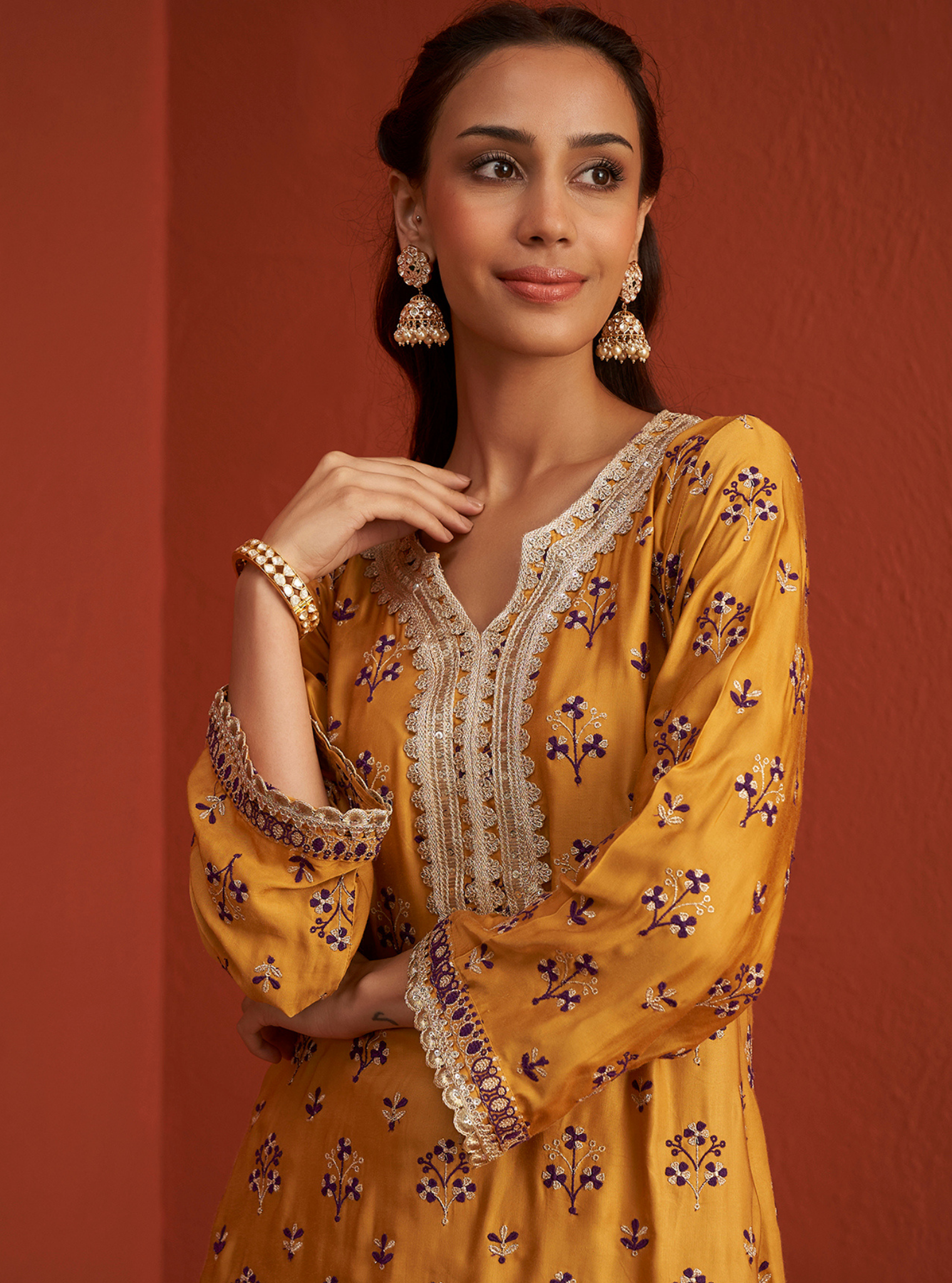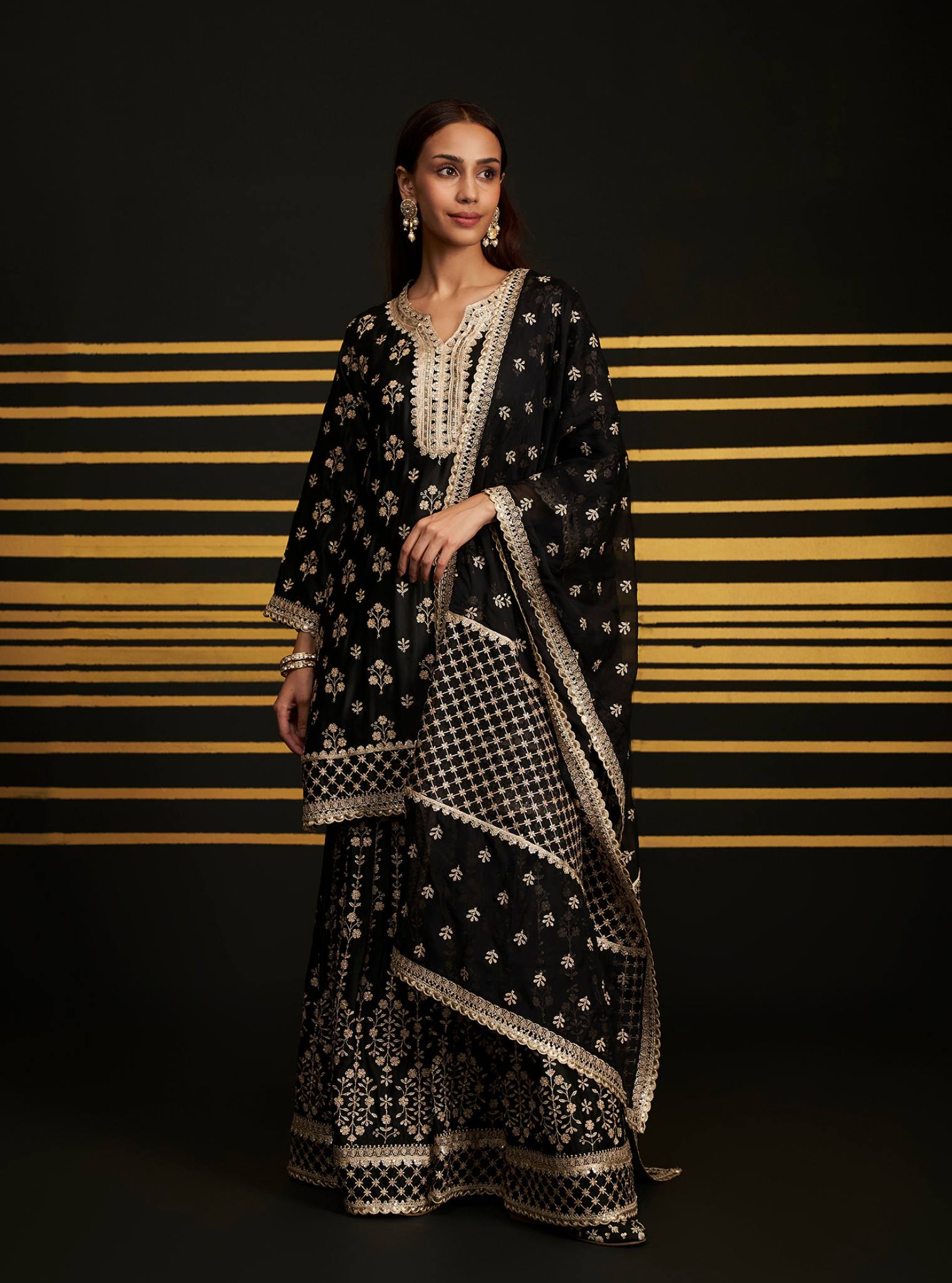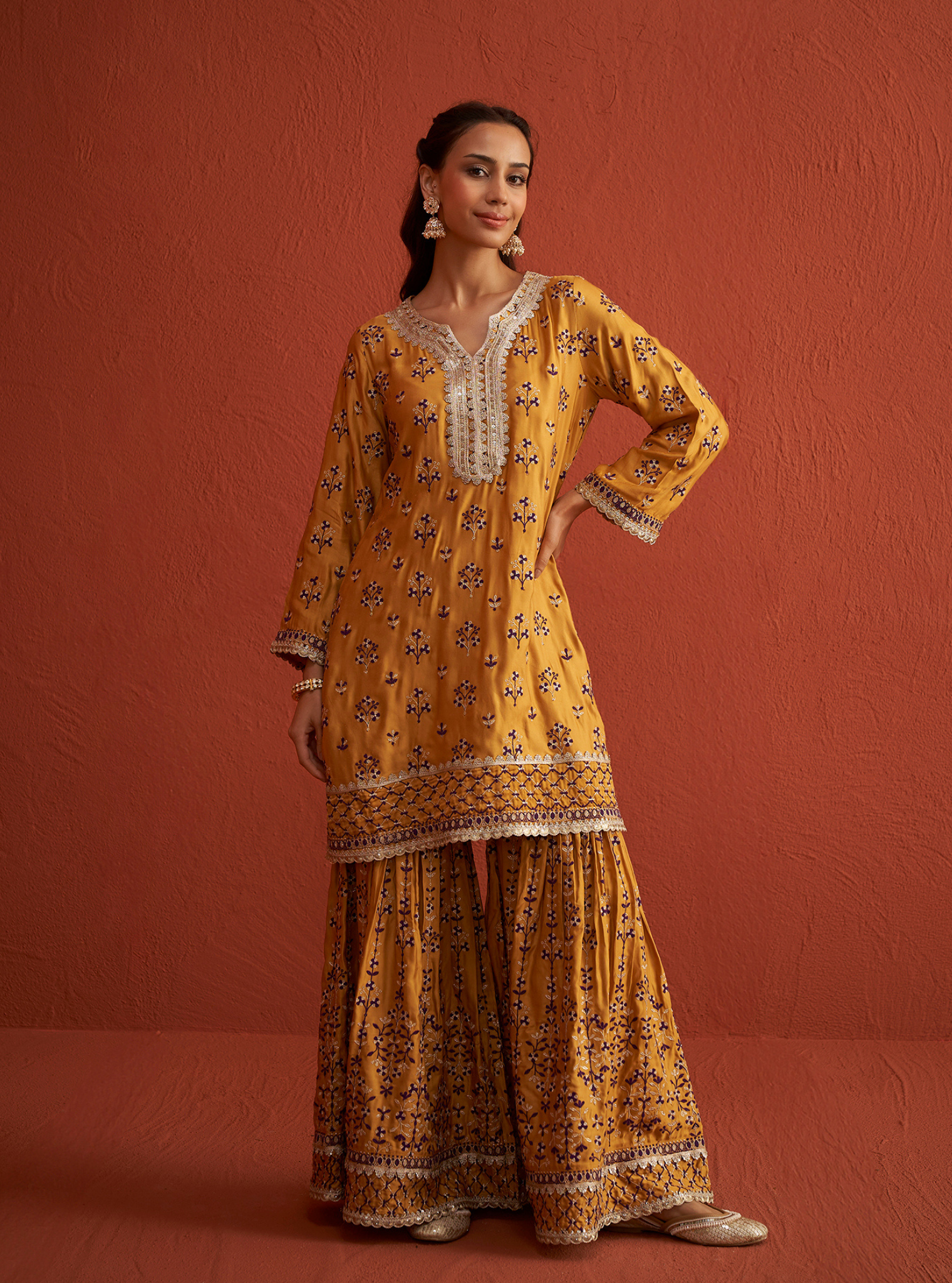 This exquisite mustard yellow Mustard/Black kurta set is designed to make you shine at any shaadi event. The set features a stunning kurta adorned with delicate floral embroidery that exudes timeless elegance. The regal gotta detailing along the neckline and hem adds a touch of sophistication, while the flowy sharara pants enhance the overall regal appeal. Paired with a matching embroidered dupatta, this ensemble is perfect for the modern desi in you, who seeks to blend traditional charm with contemporary style. Accessorize with statement earrings and juttis to complete the look, making it an unforgettable choice for the celebrations.