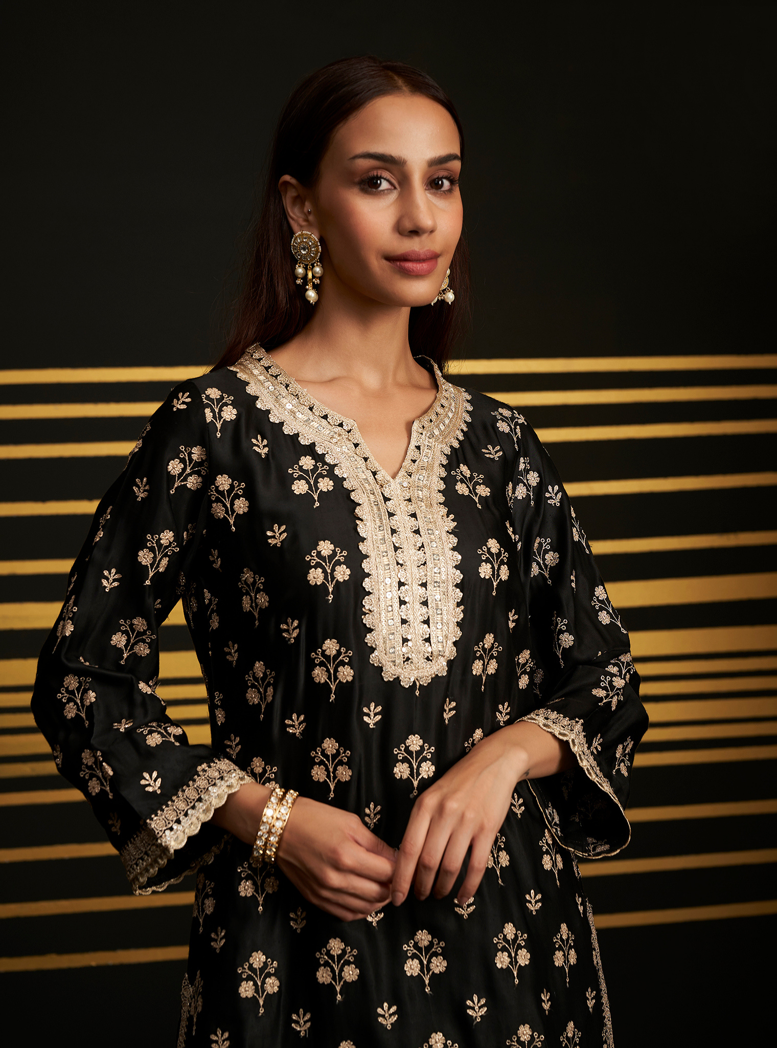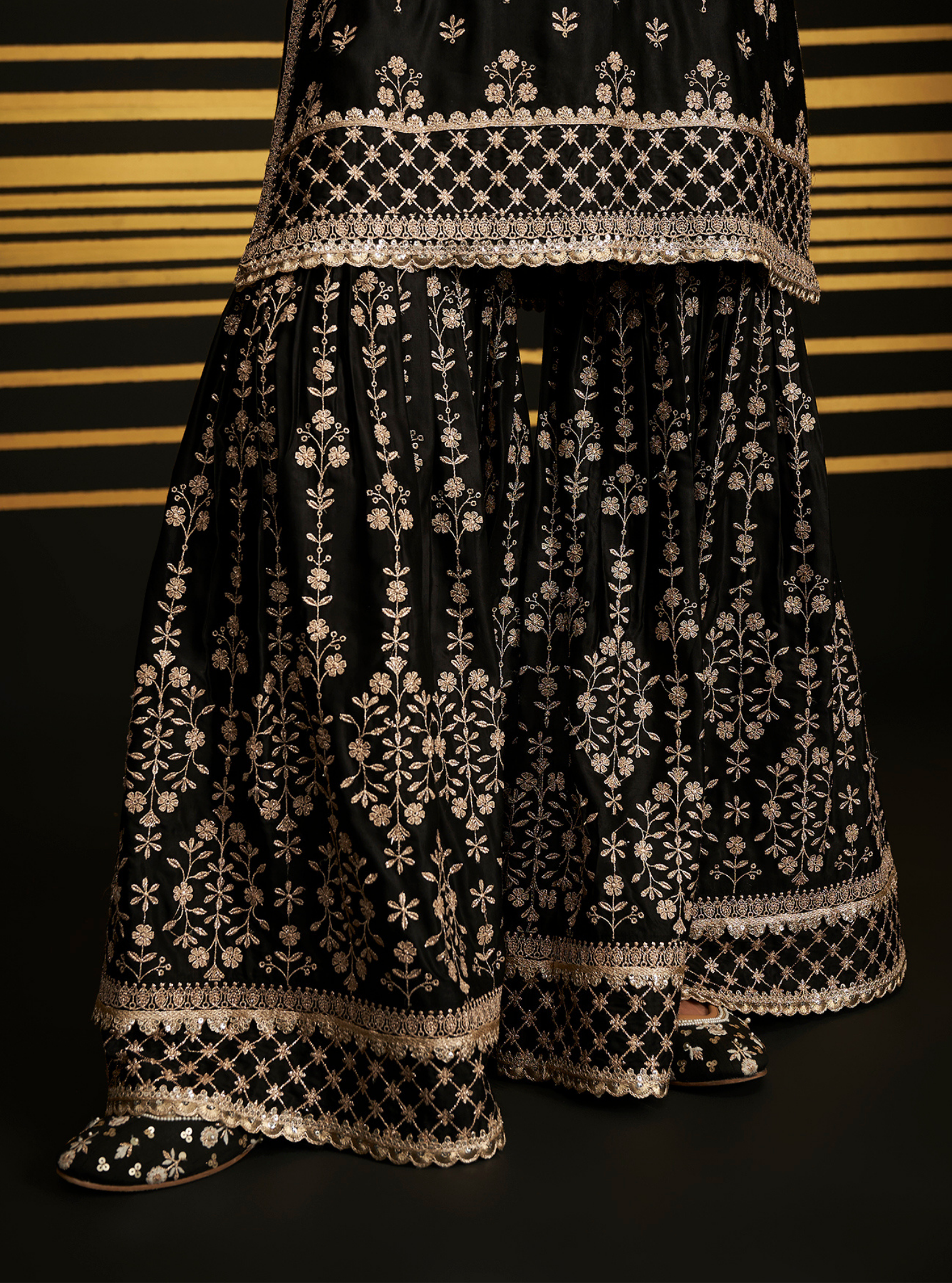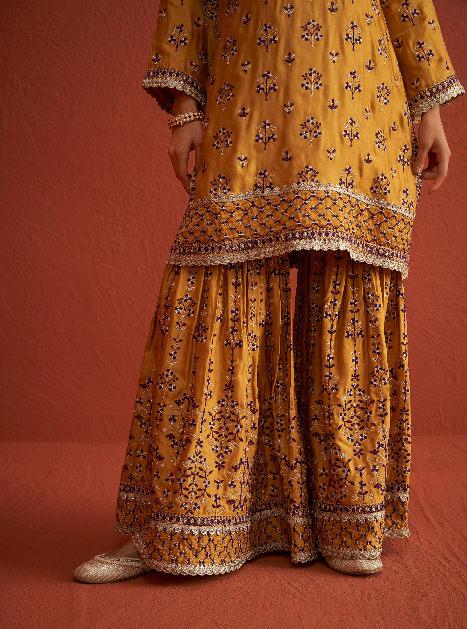This exquisite mustard yellow Mustard/Black kurta set is designed to make you shine at any shaadi event. The set features a stunning kurta adorned with delicate floral embroidery that exudes timeless elegance. The regal gotta detailing along the neckline and hem adds a touch of sophistication, while the flowy sharara pants enhance the overall regal appeal. Paired with a matching embroidered dupatta, this ensemble is perfect for the modern desi in you, who seeks to blend traditional charm with contemporary style. Accessorize with statement earrings and juttis to complete the look, making it an unforgettable choice for the celebrations.