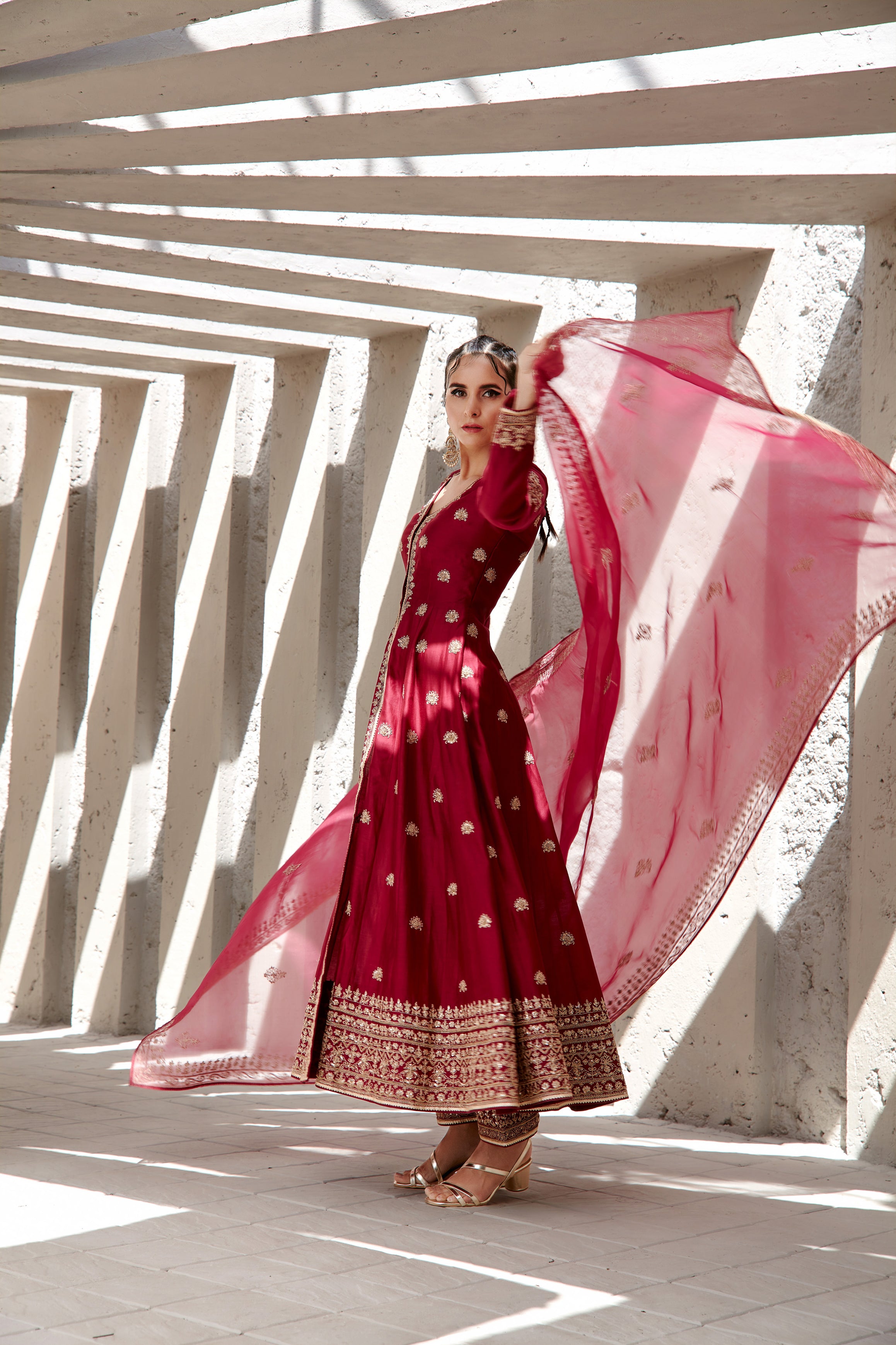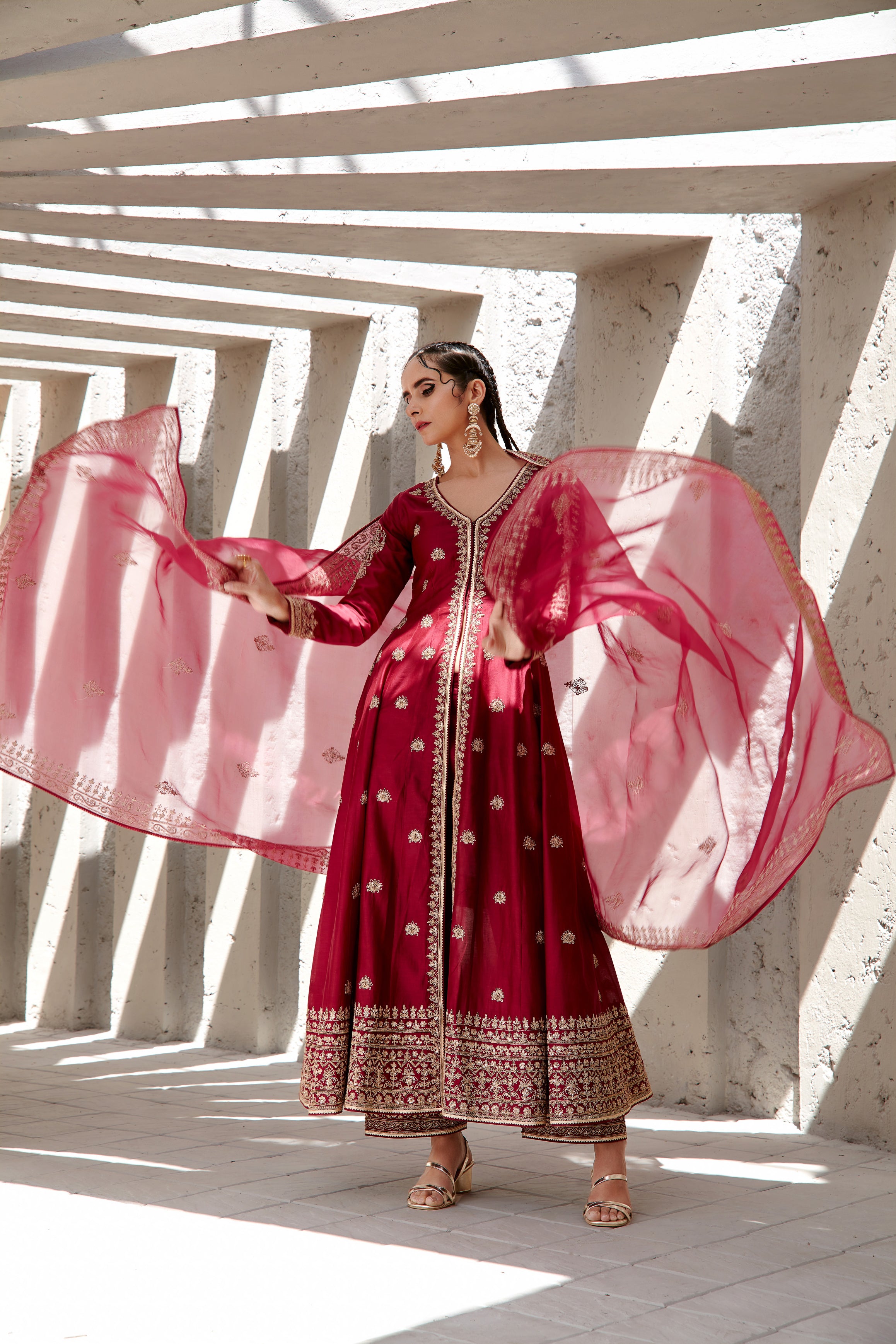 Featuring a wine jacket in Chanderi base with work of dori and sequins embroidery. It is paired with matching embroidered pants and an organza base dupatta.