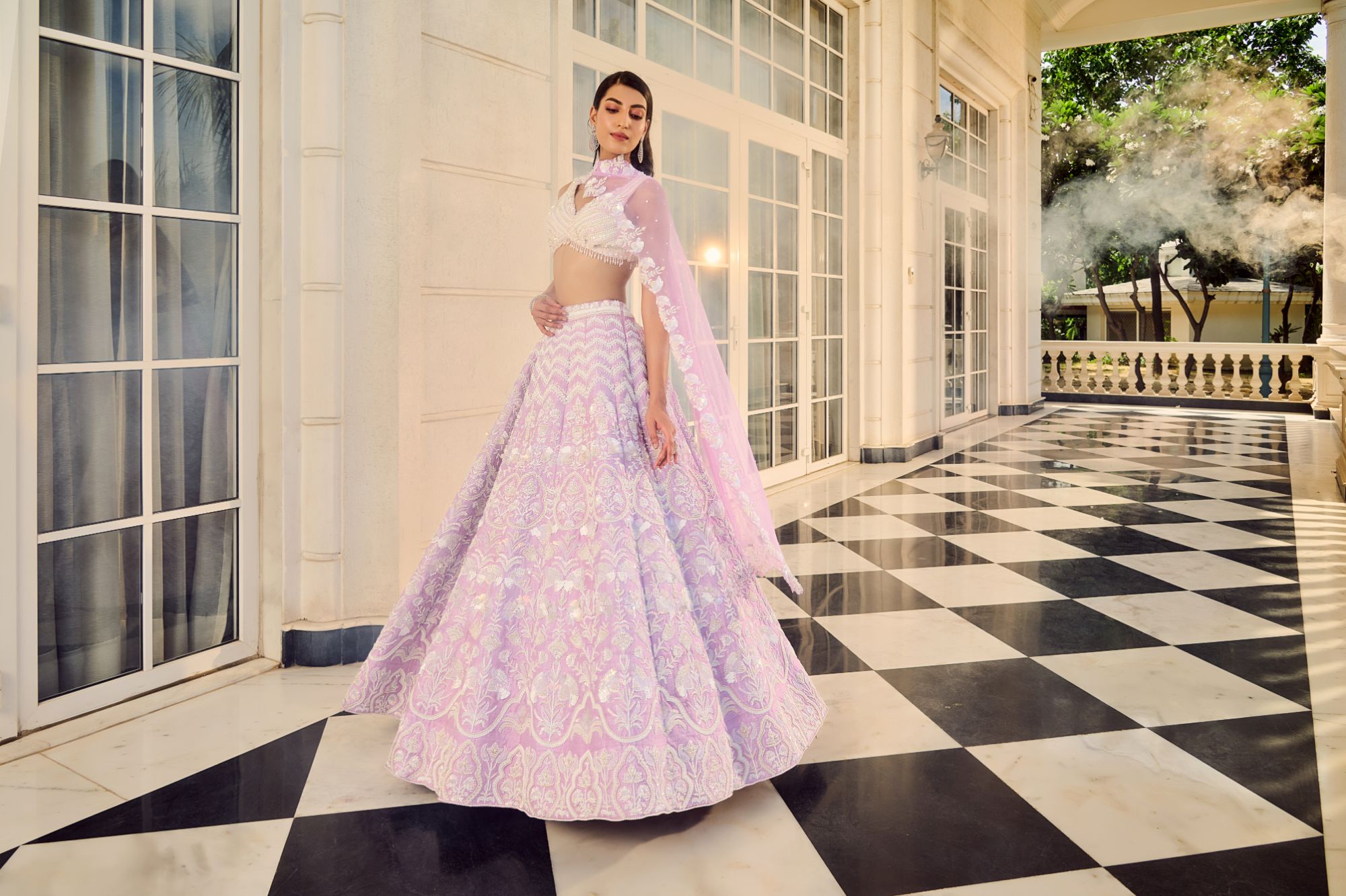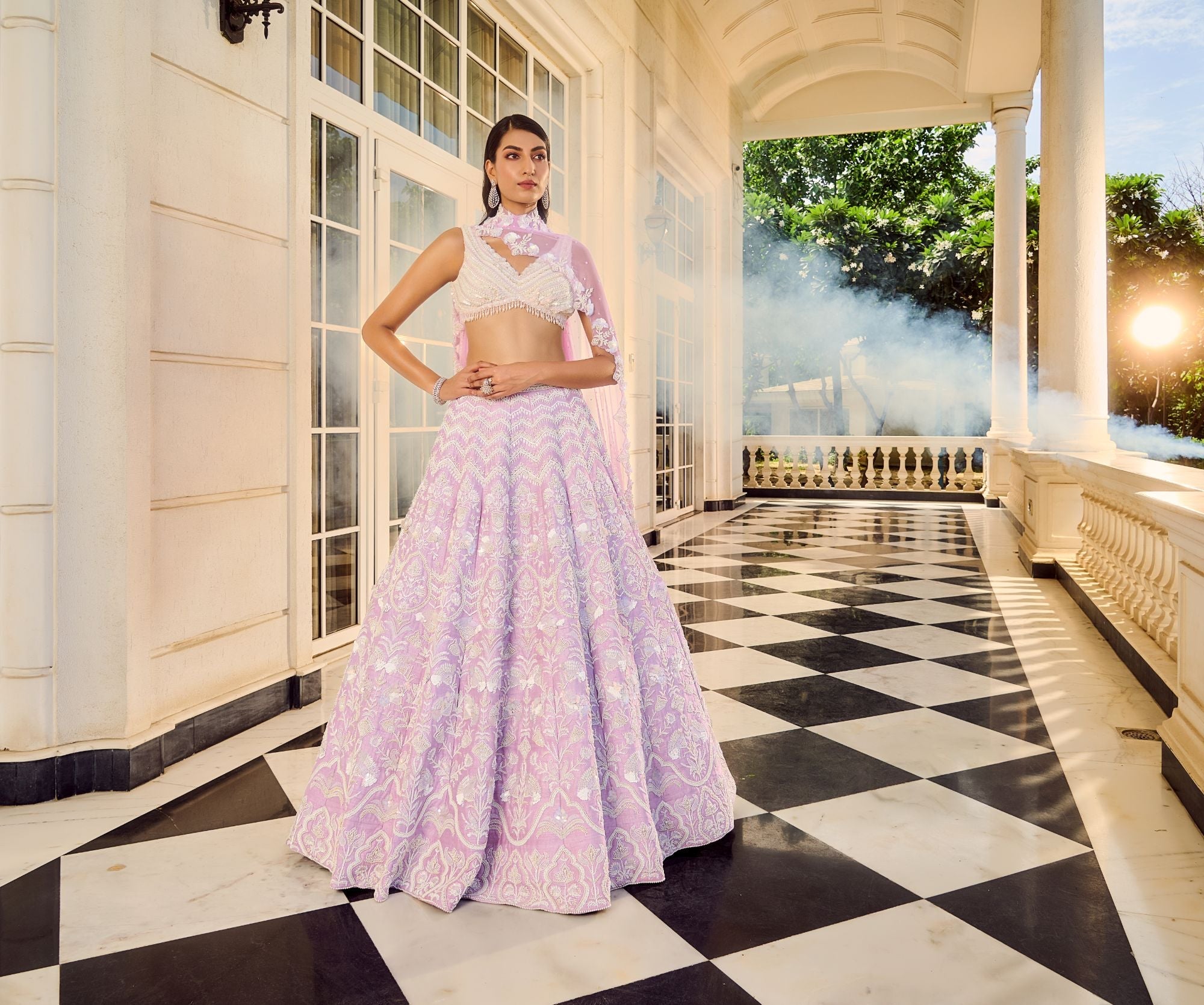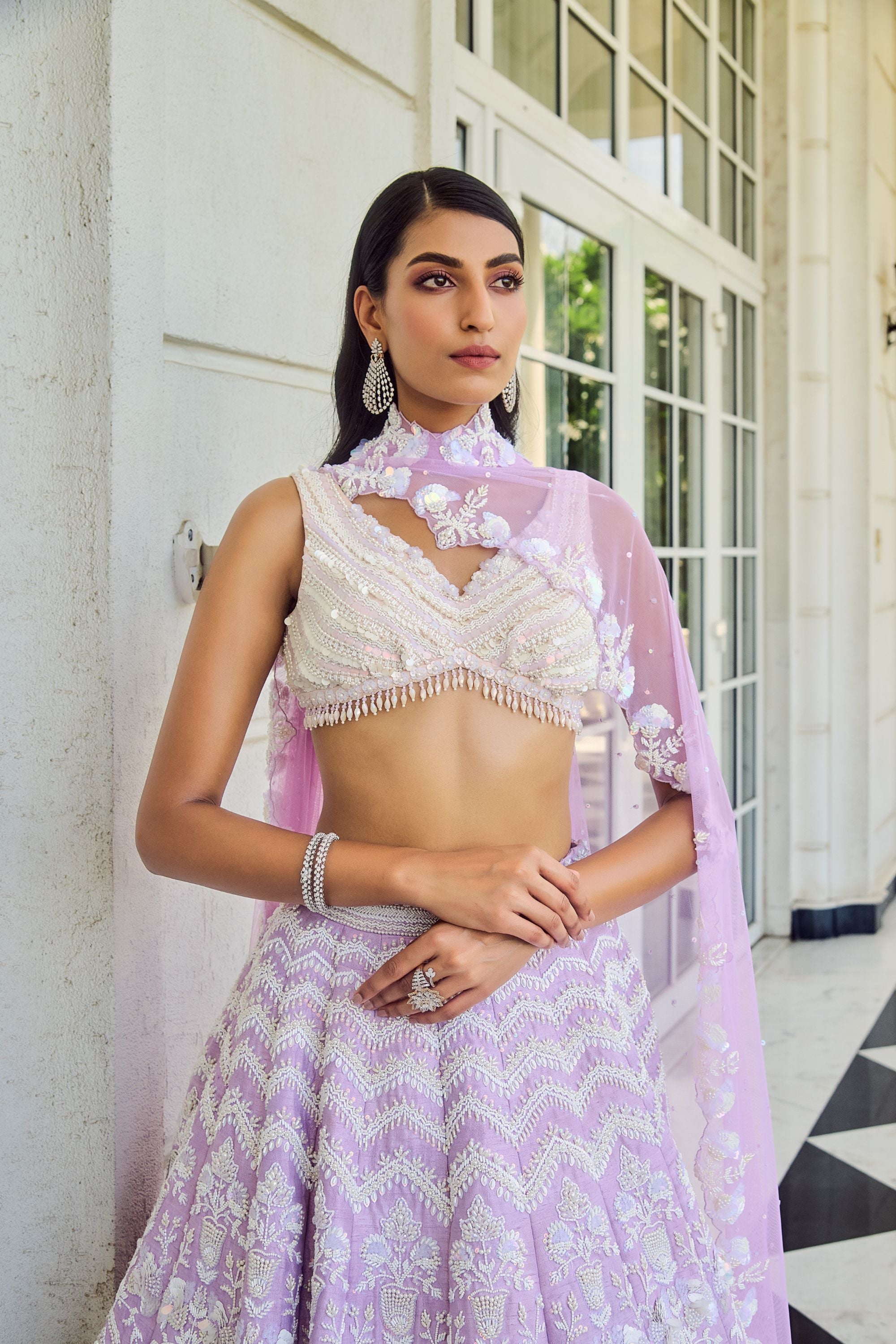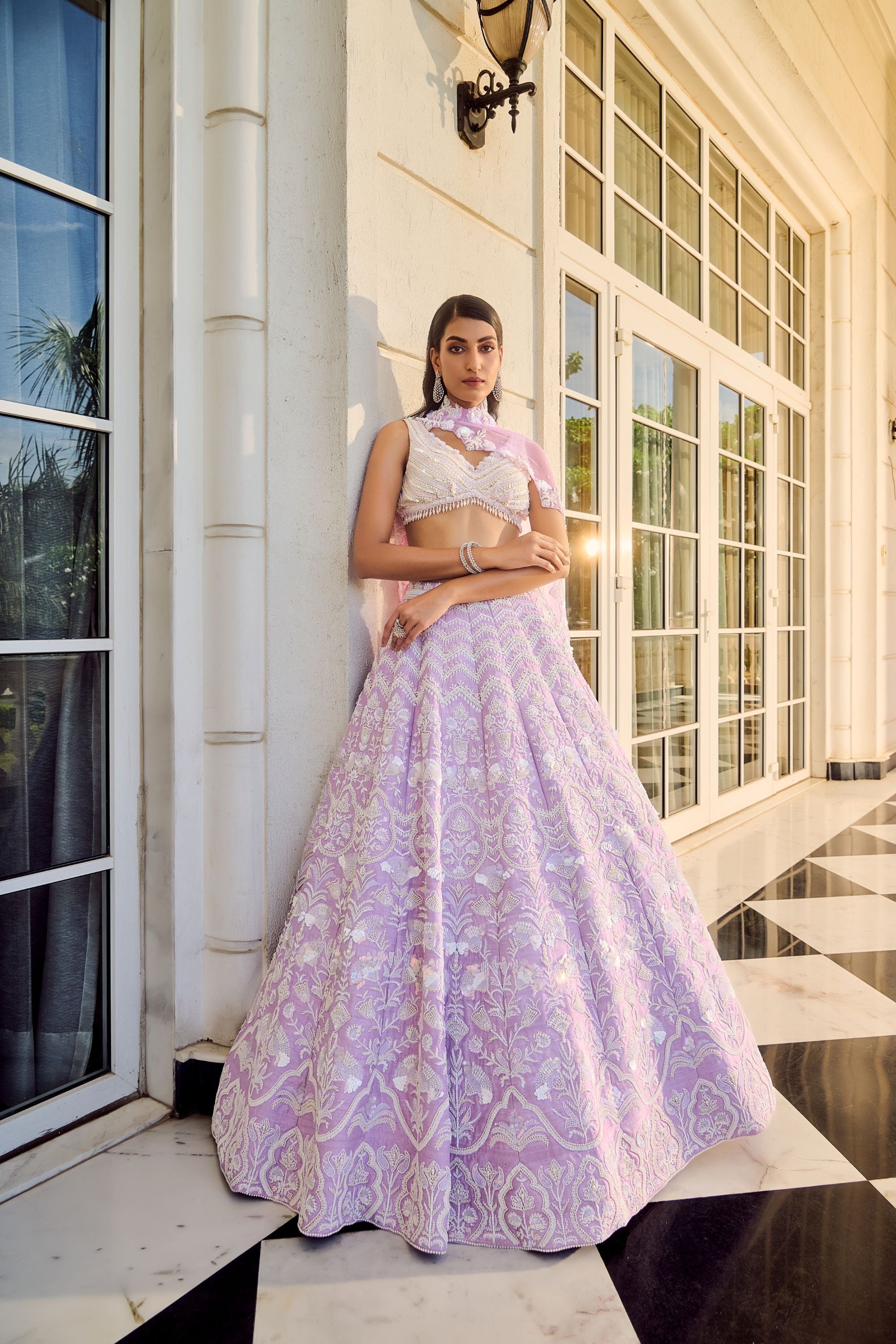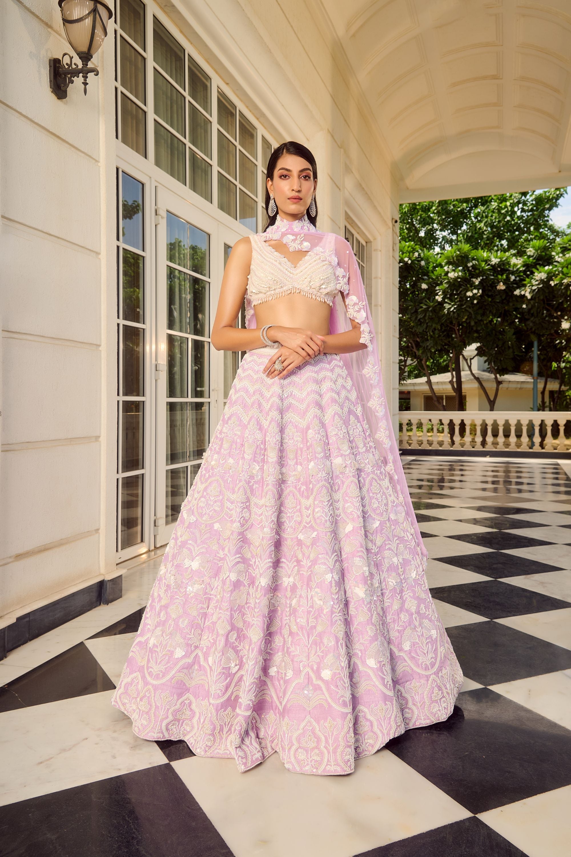 The Maive Lehenga is a dream in lavender, featuring a delicate haze of lavender hues that add a soft, enchanting touch. Adorned with shimmering holographic sequins and intricate beaded hand embroidery, this lehenga captures a captivating balance between elegance and modern flair. Ideal for those who wish to make a refined statement, the Maive Lehenga radiates sophistication, making it a perfect choice for wedding celebrations and grand festivities.