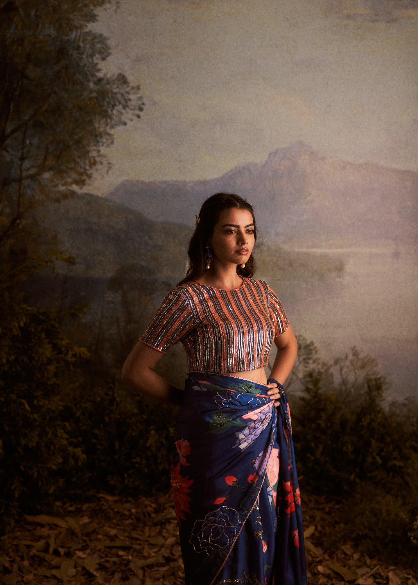 The navy blue saree is a classic and versatile choice that exudes sophistication and elegance. The deep hue of navy blue adds a touch of depth and richness to the ensemble. Whether for formal events or casual occasions, this saree is timeless, effortlessly embodying grace and style.