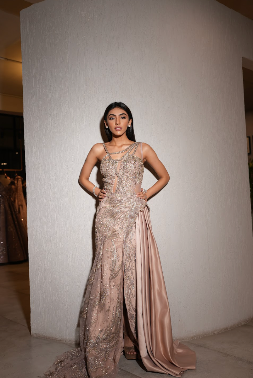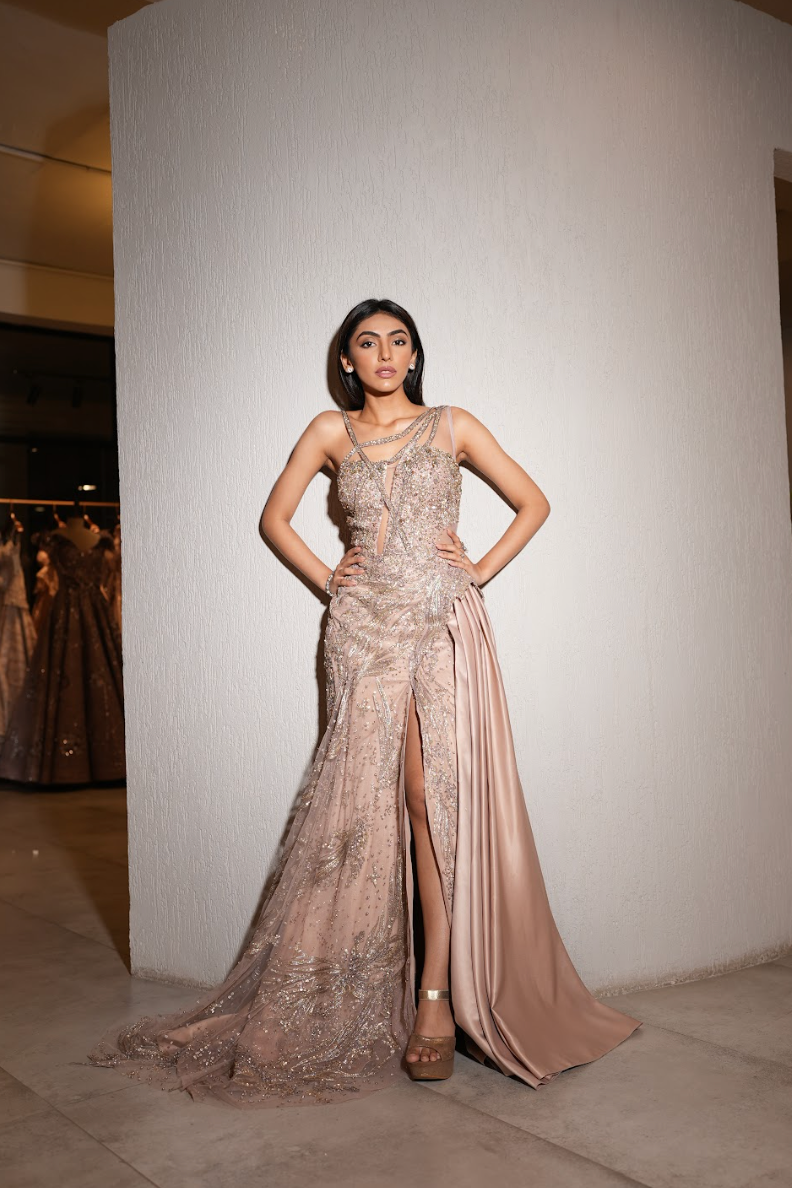This gown exudes elegance and sophistication with its flattering body fit and enchanting flare