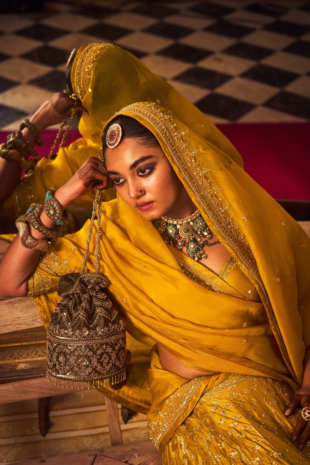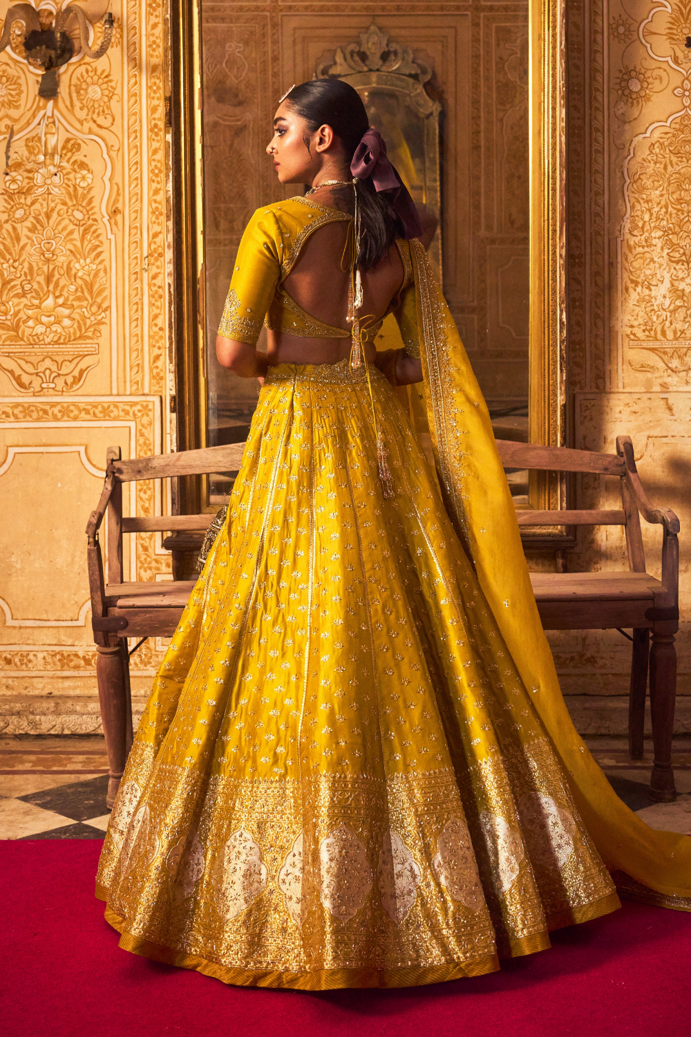Featuring an mustard banarsi bridal lehenga set paired with organza base dupatta with gold zari and embellished hand embroidery.