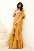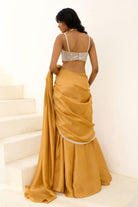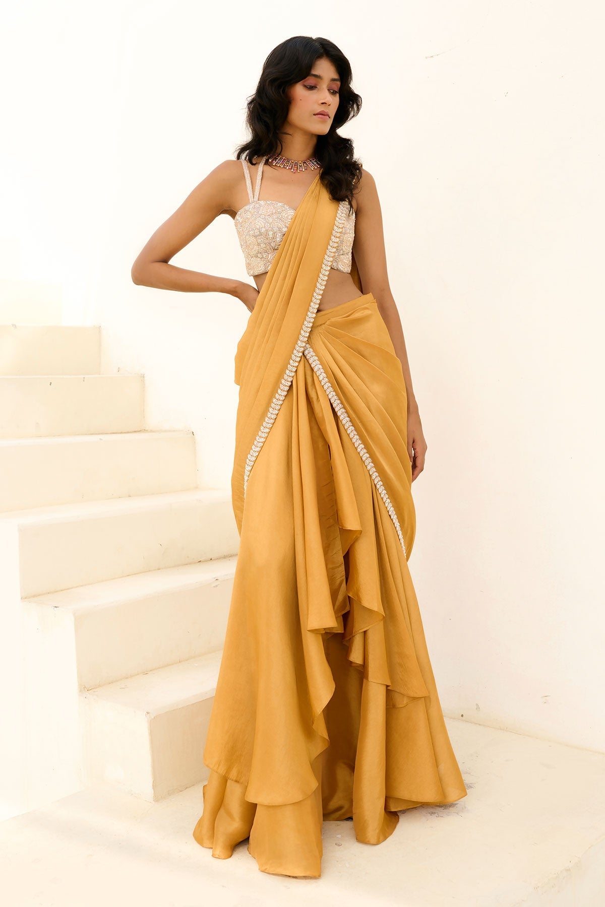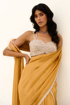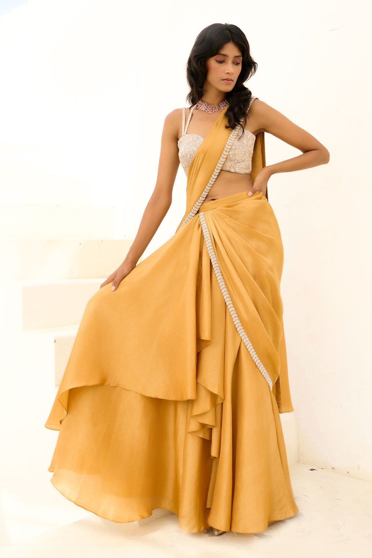 Tissue pre-draped cascade saree with glassbeads embellished border paired with glassbeads and sequence embroidered blouse